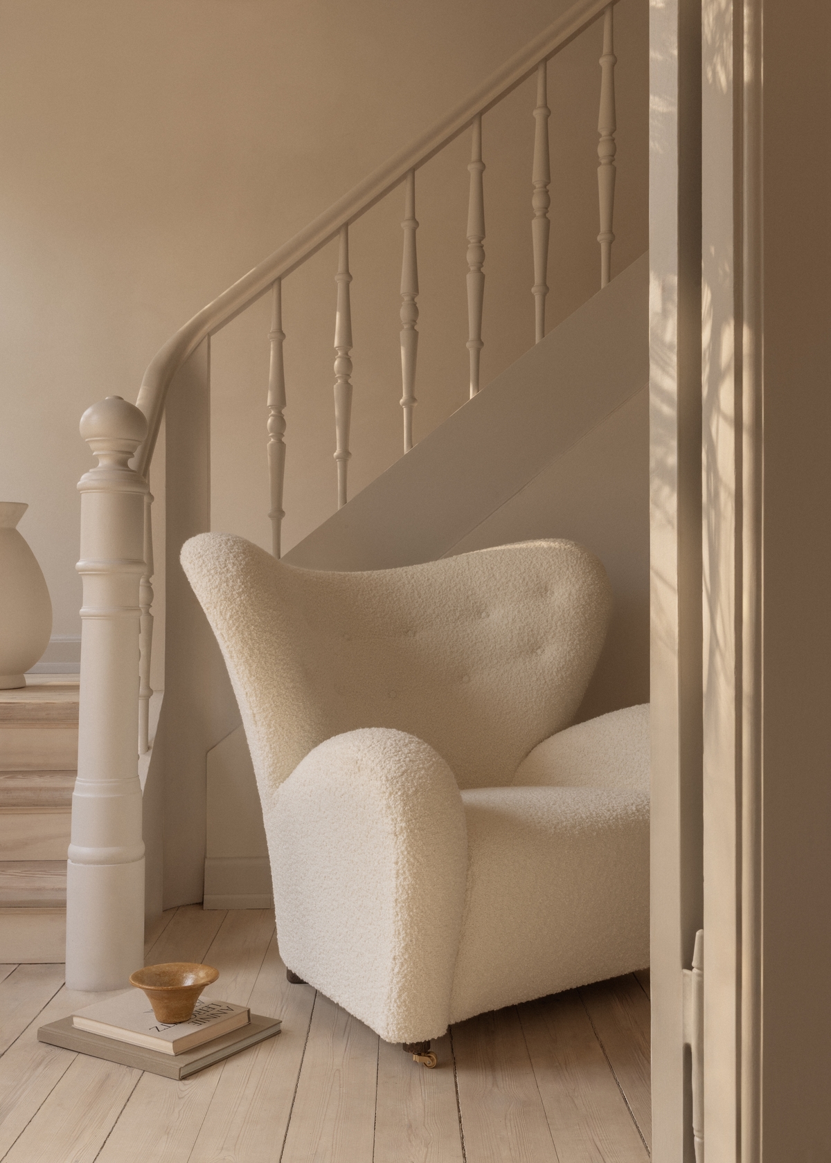 The Tired Man was launched at the Copenhagen Cabinetmakers’ Guild Exhibition in 1935 and has since become an icon of Danish design. The epitome of craftsmanship and comfort, the characteristically curved armchair was designed by Flemming Lassen to feel “as warm and snug as a polar bear cub in the arms of its mother.” Relaunched in 2015, the award-winning design is offered in plush upholstery, including sheepskin in a nod to the original, and with natural or dark-oiled oak heartwood legs and front brass casters for easy movement. A corresponding footstool ensures further comfort.