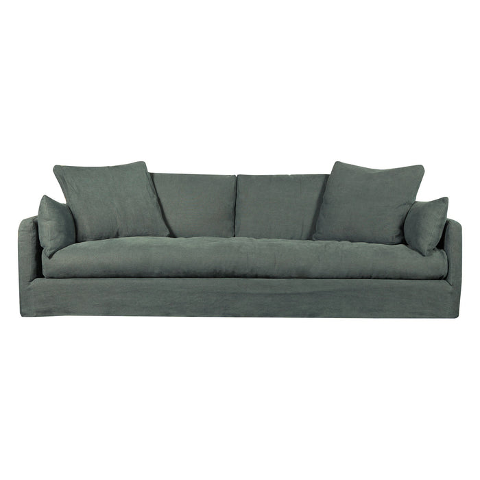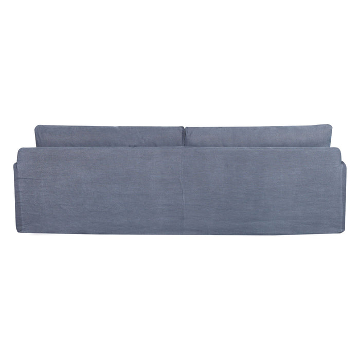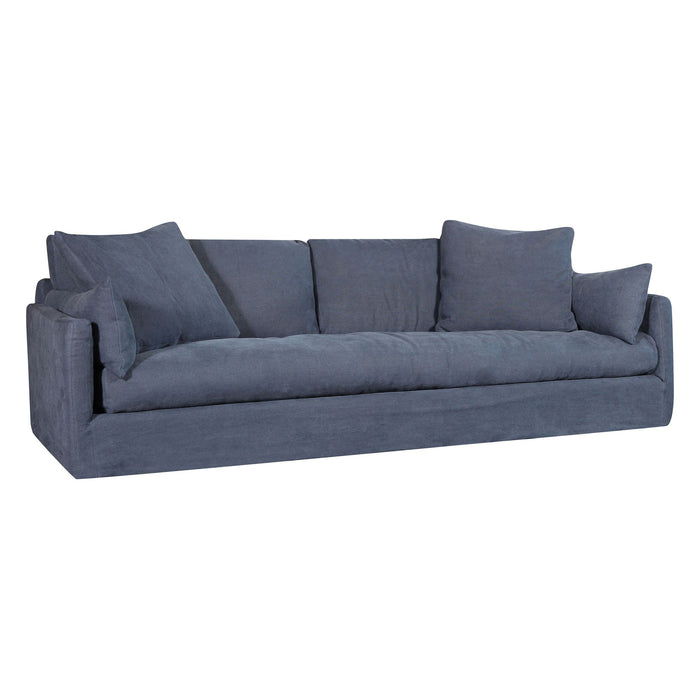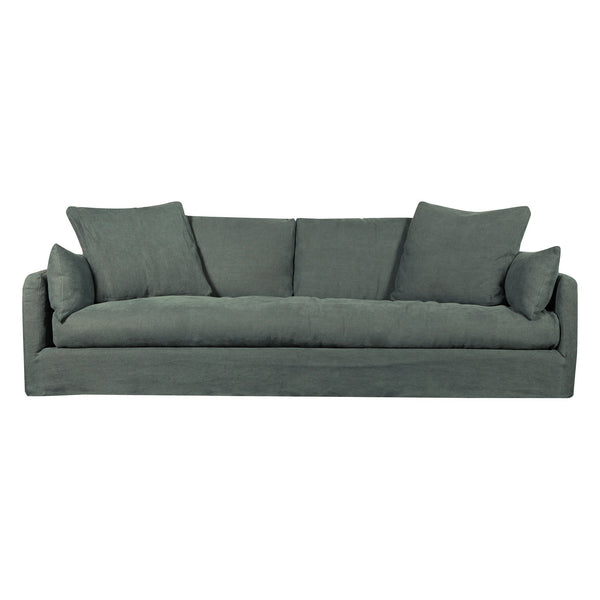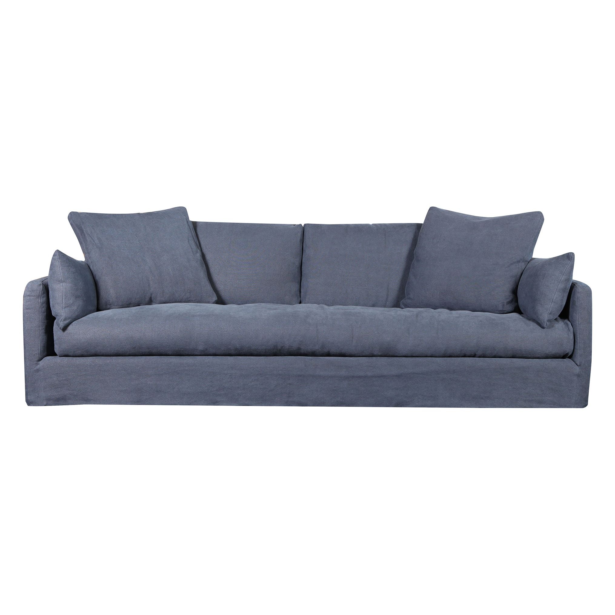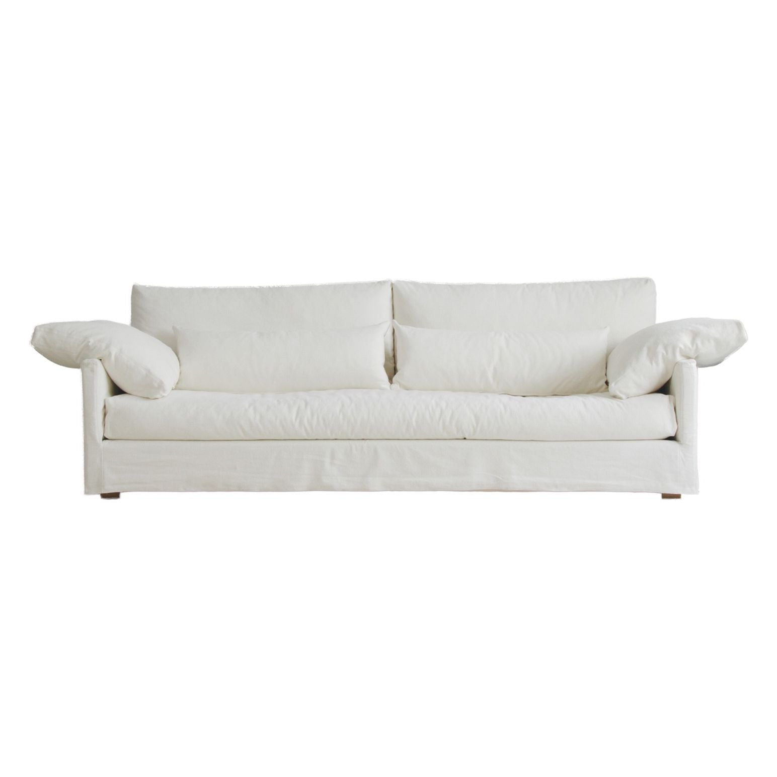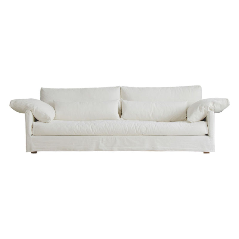 Island sofa is classic coastal. Thin arms combined with generous seating width create an elegant yet casual mood. Its loose-fitting slip cover speaks of the beach house and long summers. The long single seat cushion invites languorous lounging.