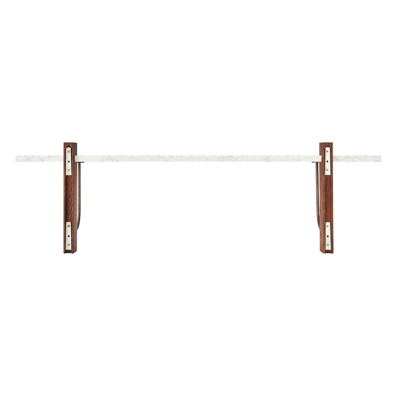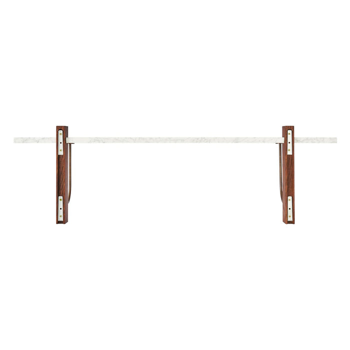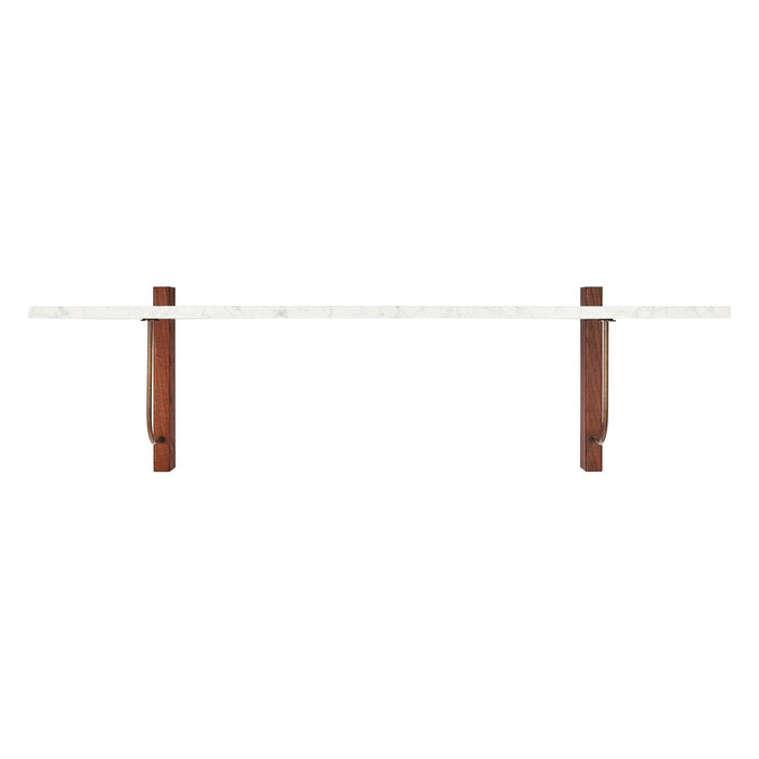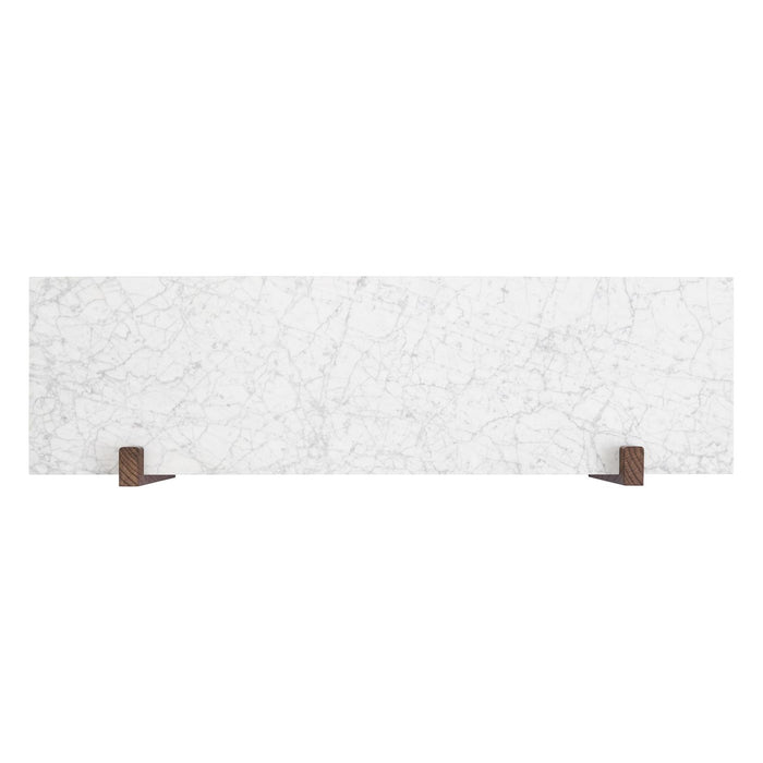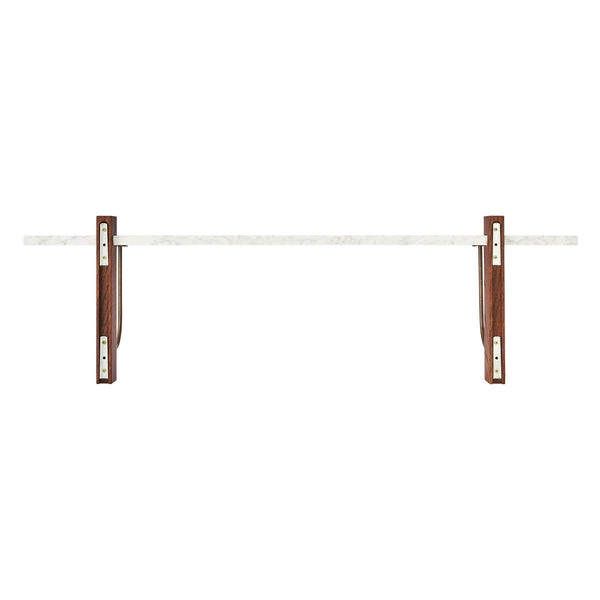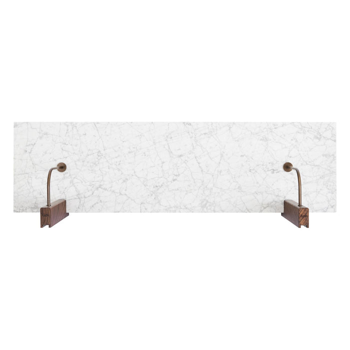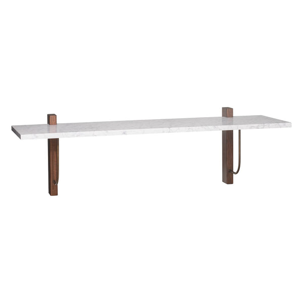 The Corbel Shelf takes its name and design cues from architectural weight-bearing brackets traditionally made from stone or wood. Designed for versatility, it serves a range of different purposes and needs in dining, kitchen and living room areas, maximising the utility of a space and infusing the design with a sense of structural elegance. The shelf can also be paired with the corresponding desk to create a minimalist home office. thoughtfully crafted to maintain a clean and decluttered aesthetic. The small distance to the wall allows for neat cord management. The wall-mounted design is offered in marble or dark-stained oak with dark-stained oak and bronzed steel brackets, catering to different interior styles and preferences.
