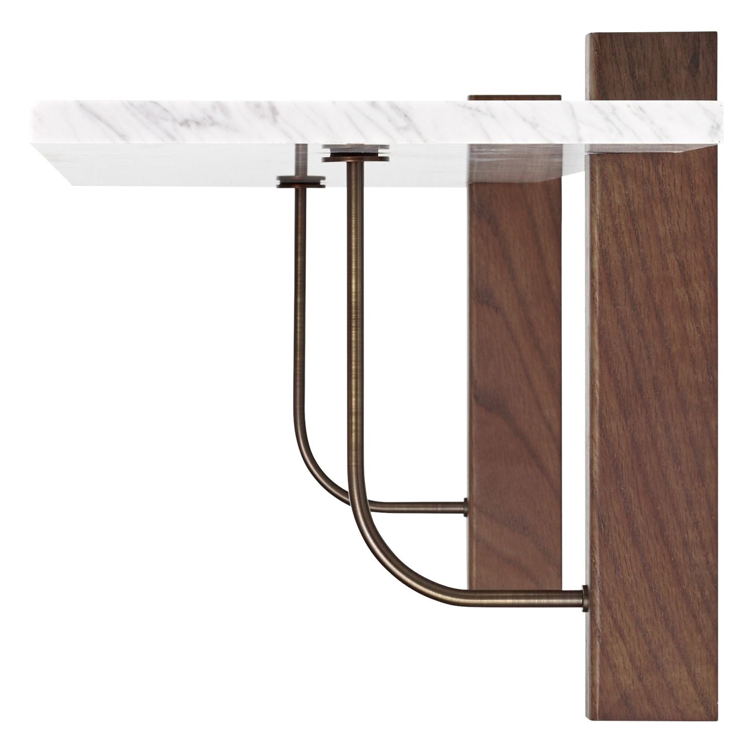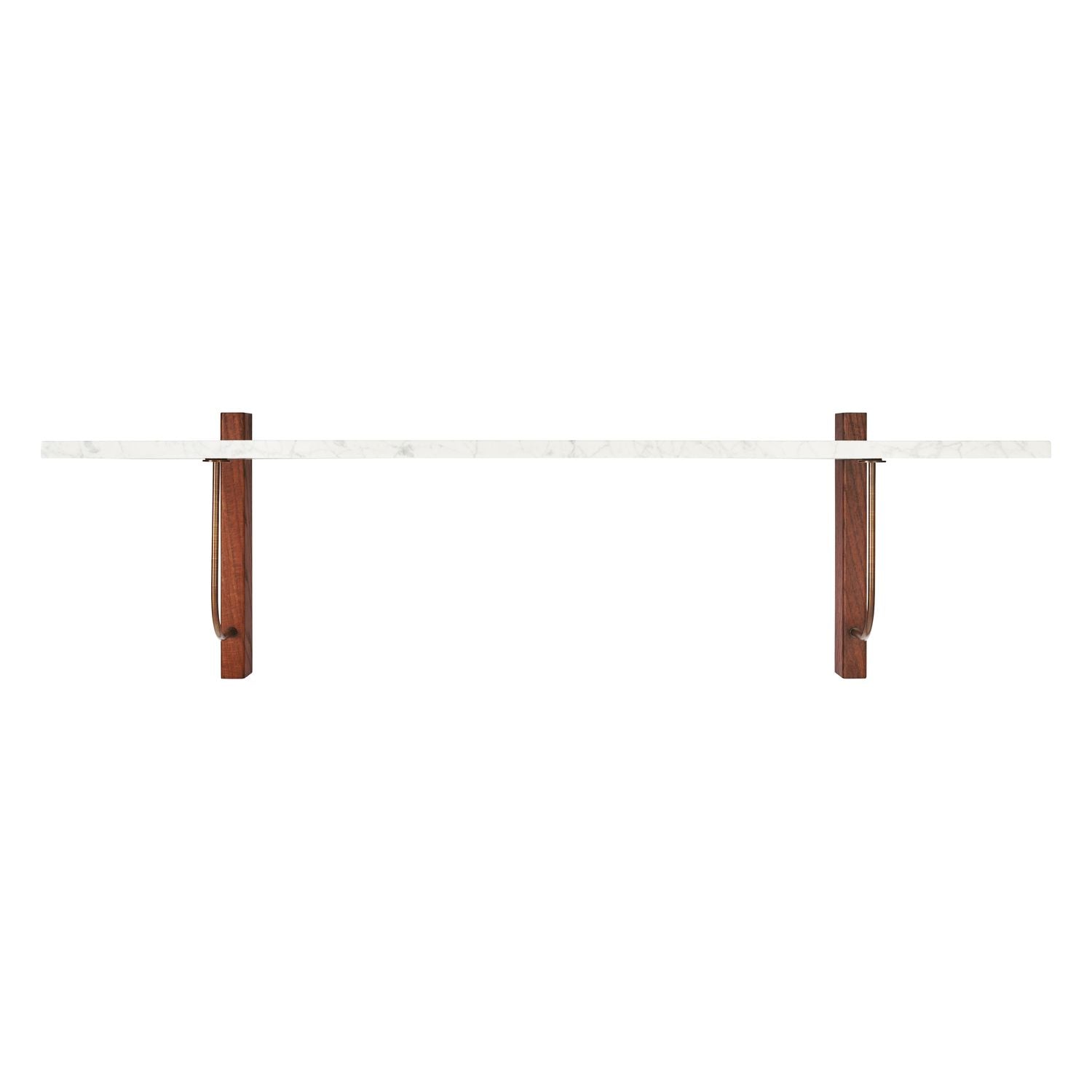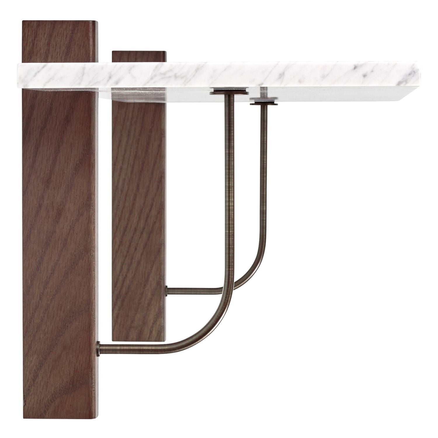 The Corbel Shelf takes its name and design cues from architectural weight-bearing brackets traditionally made from stone or wood. Designed for versatility, it serves a range of different purposes and needs in dining, kitchen and living room areas, maximising the utility of a space and infusing the design with a sense of structural elegance. The shelf can also be paired with the corresponding desk to create a minimalist home office. thoughtfully crafted to maintain a clean and decluttered aesthetic. The small distance to the wall allows for neat cord management. The wall-mounted design is offered in marble or dark-stained oak with dark-stained oak and bronzed steel brackets, catering to different interior styles and preferences.