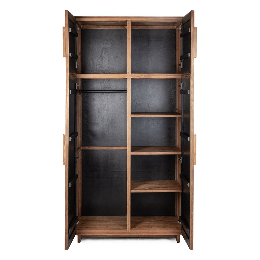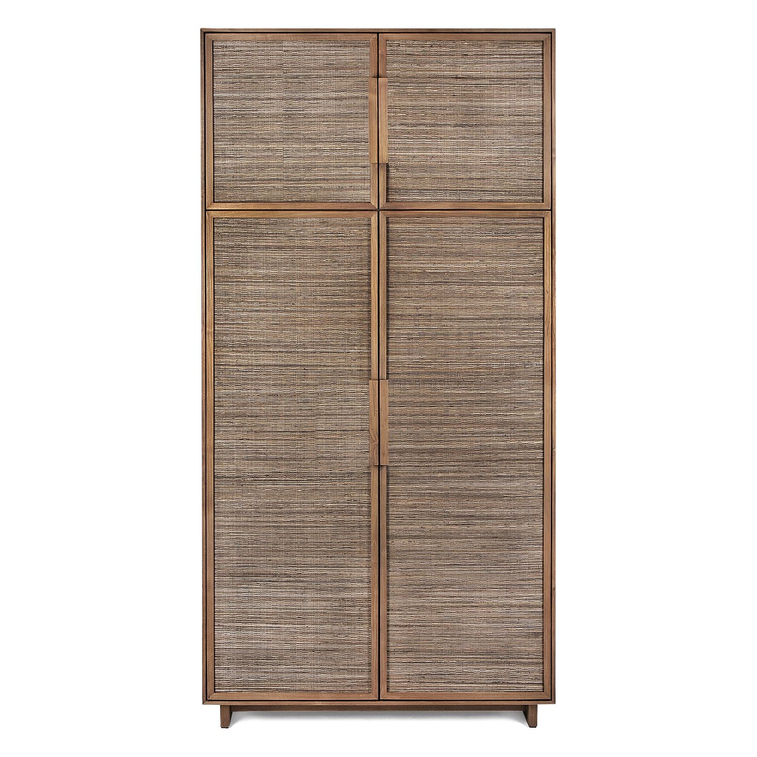 Noble and beautifully proportioned, this wardrobe is both practical and rewarding to look at. Doors framed in teak with skilfully recessed edging and flattering teak handles, blend together with handwoven, coconut midrib-leaf covered door surfaces. Adjustable lower shelving within are completed with metal hangar rail above.