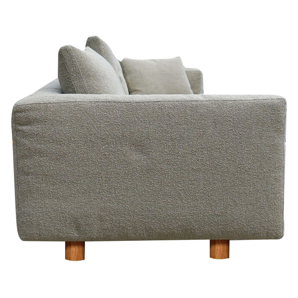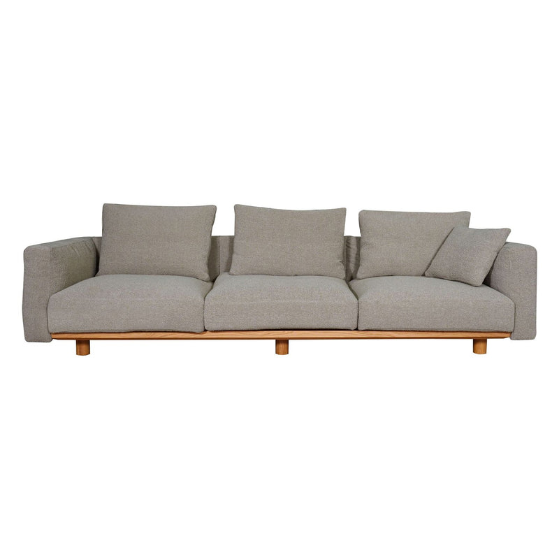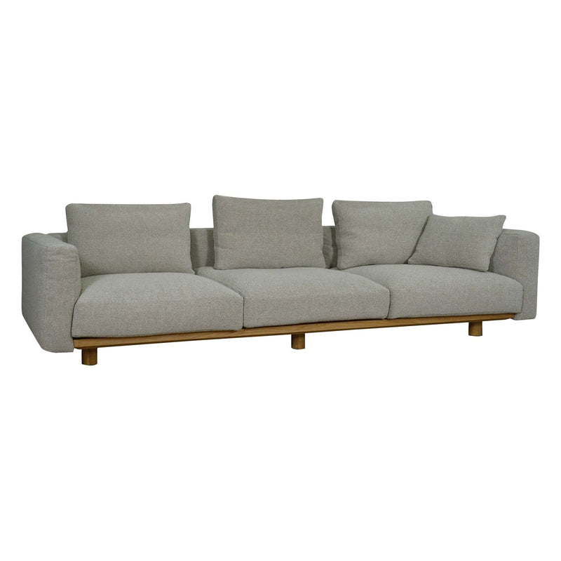 The standout characteristic of this product is its wooden platform, distinguished by beveled edges, upon which sturdy cylindrical legs are affixed. The system can be configured with either an open end or terminated with an armrest, providing a visual closure.