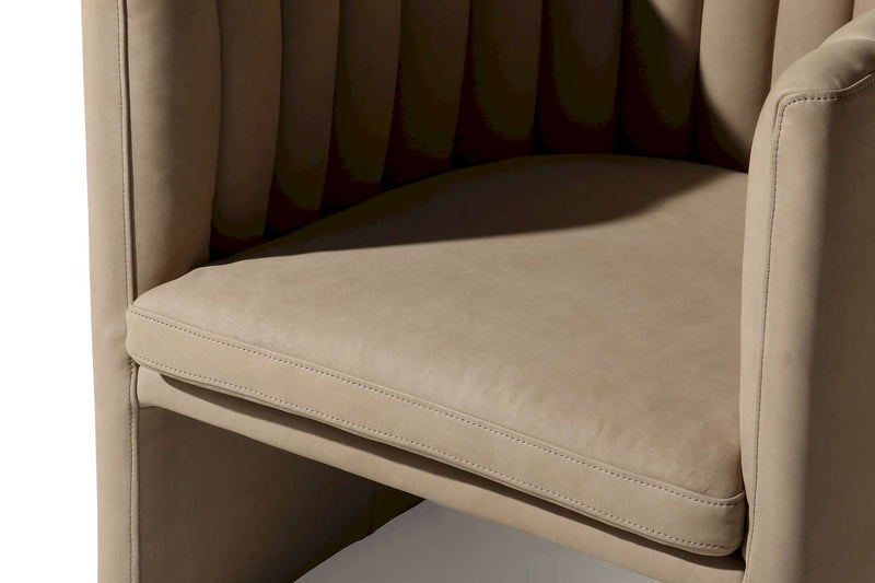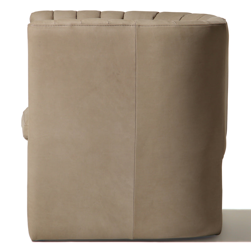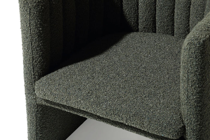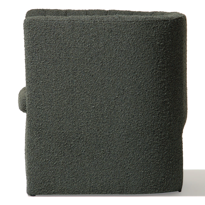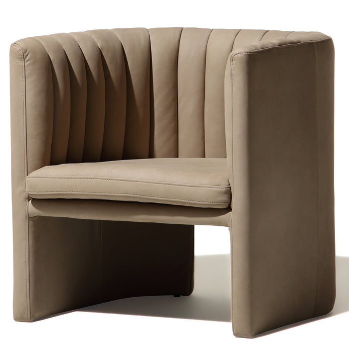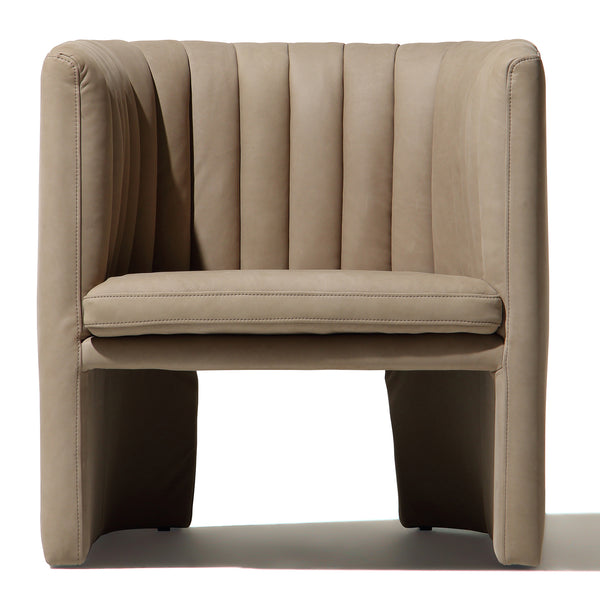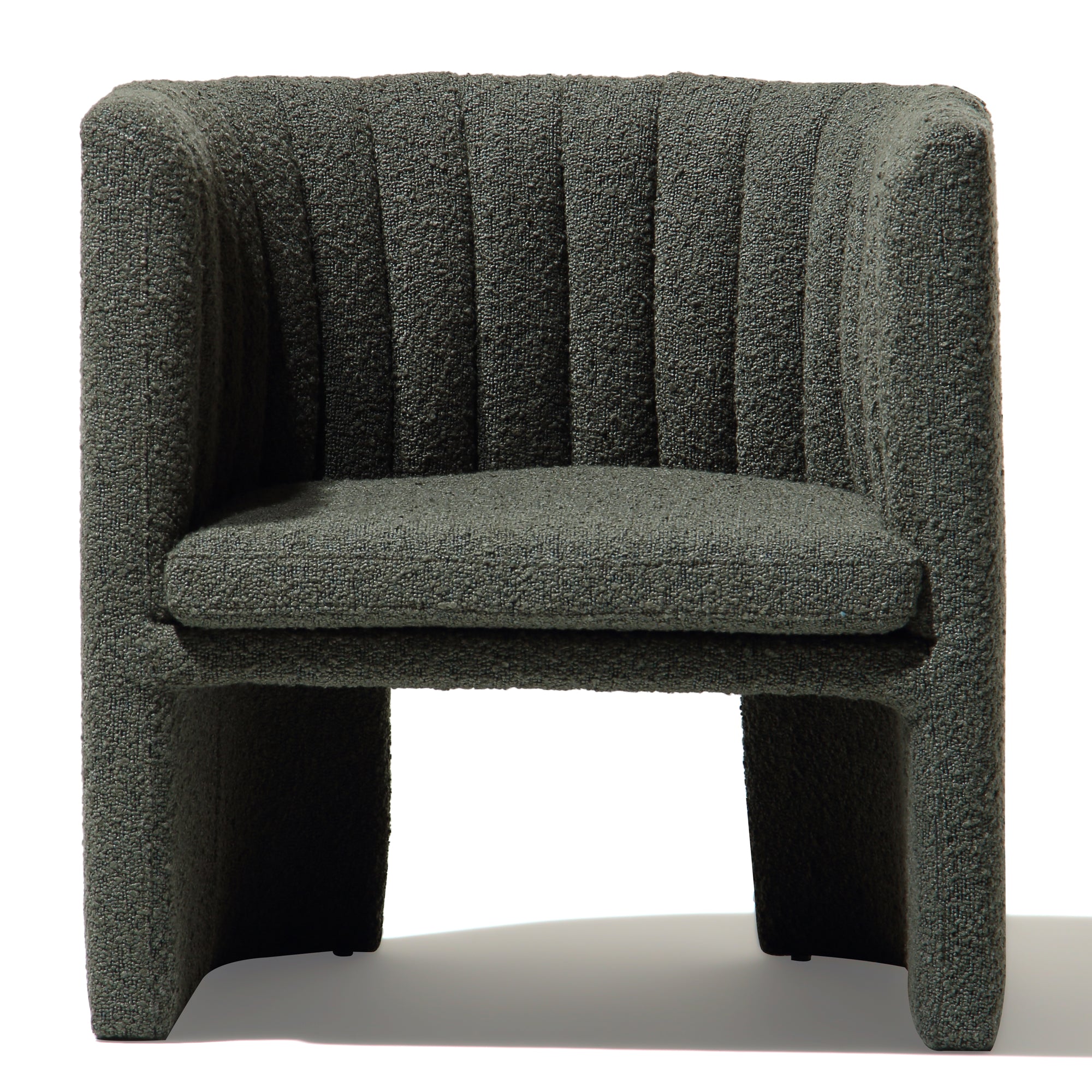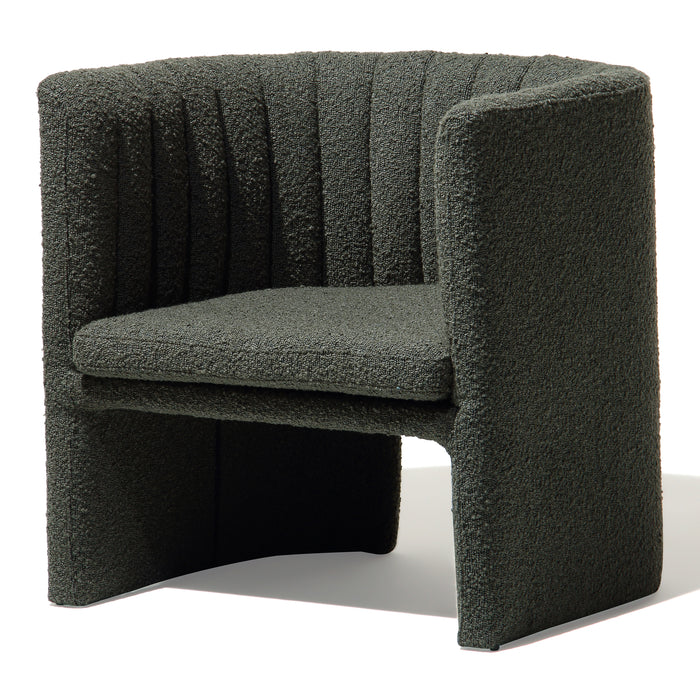 Full bodied leather or boucle occasional chair with channel detailing and soft foam seat base. Carefully put together, this chair is a plush and sophisticated design that adds a touch of strong textural interest to your home.