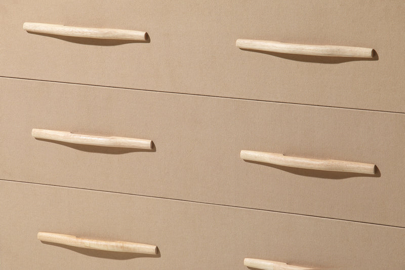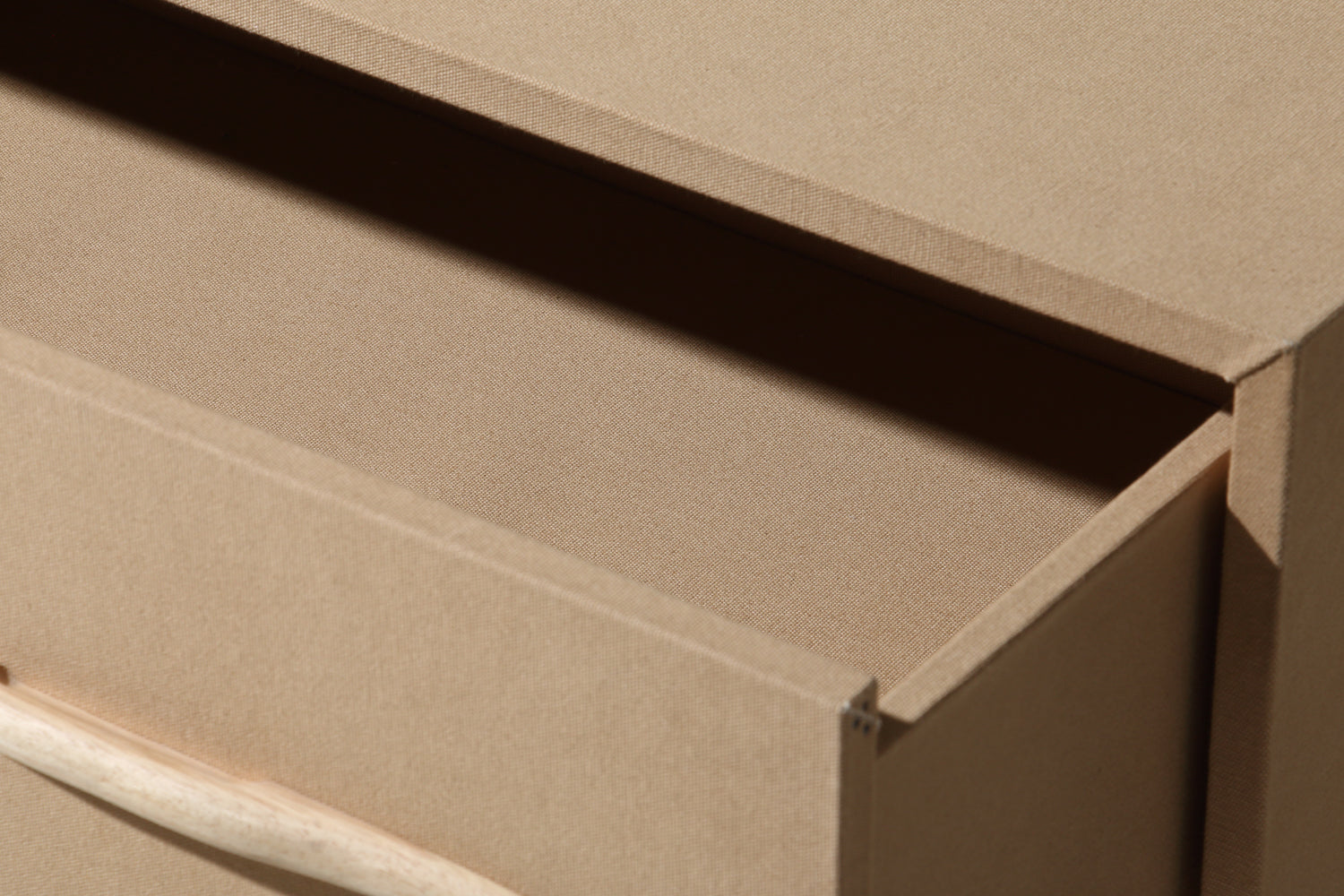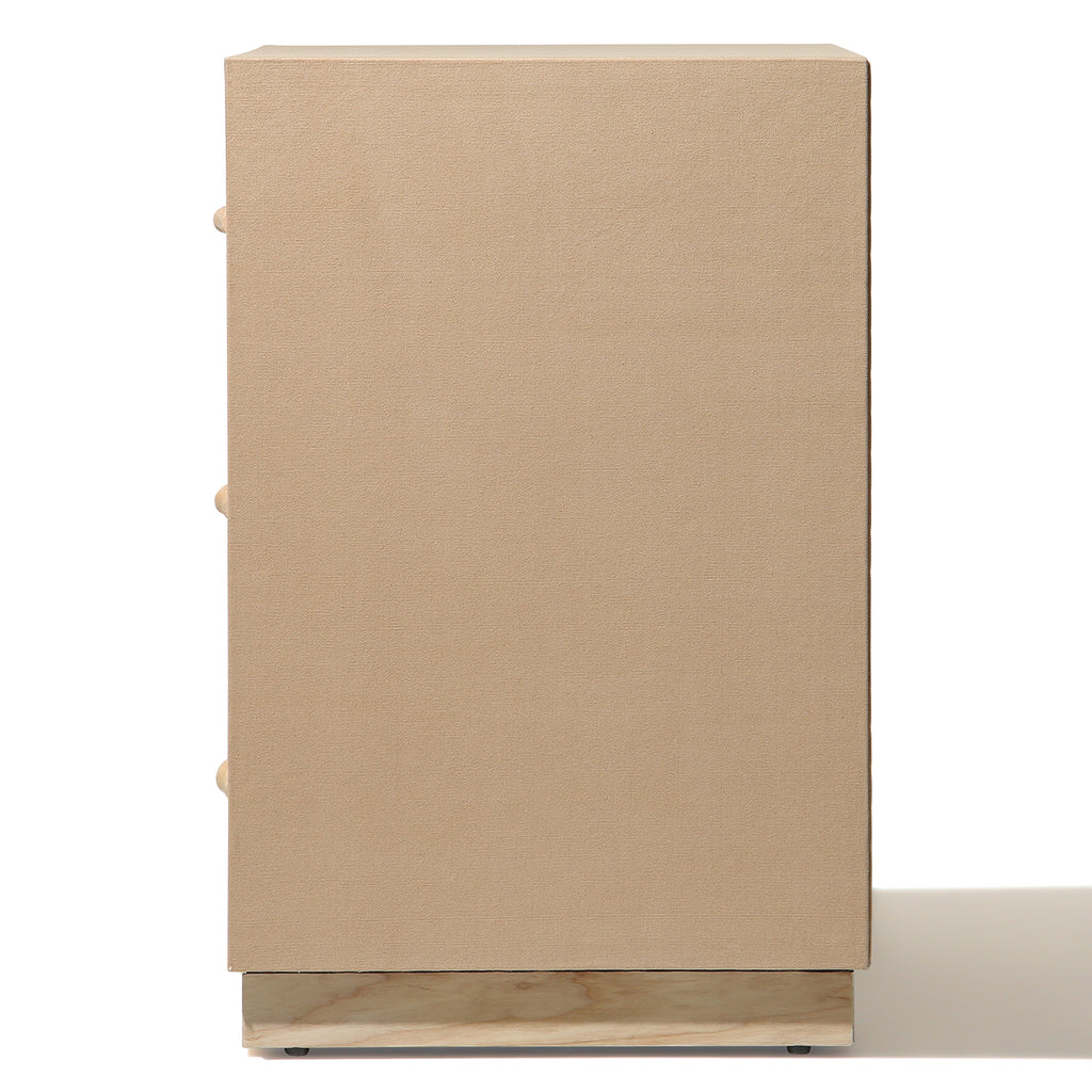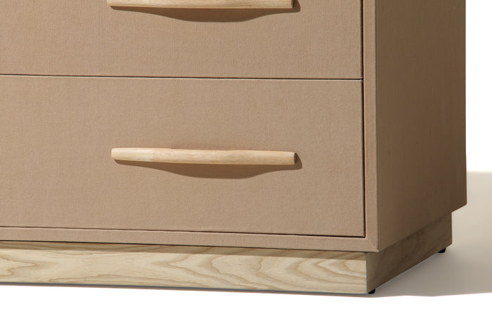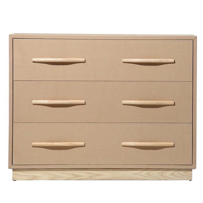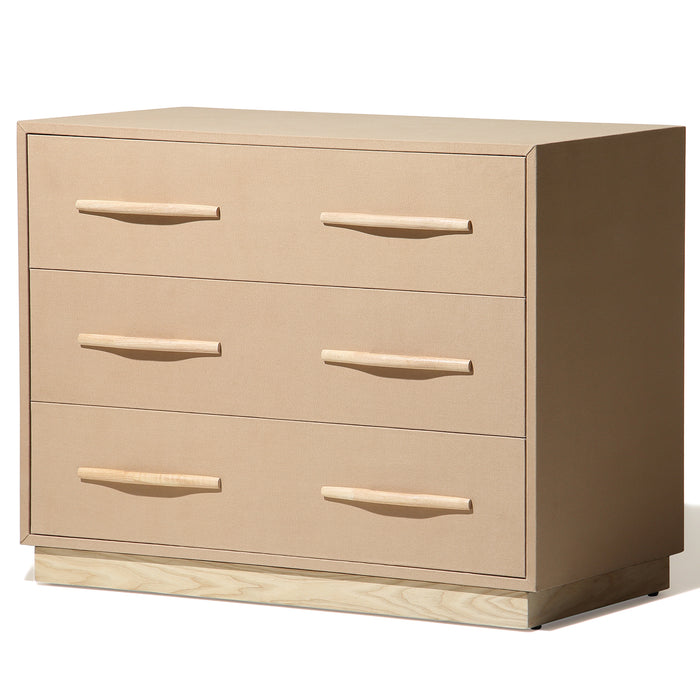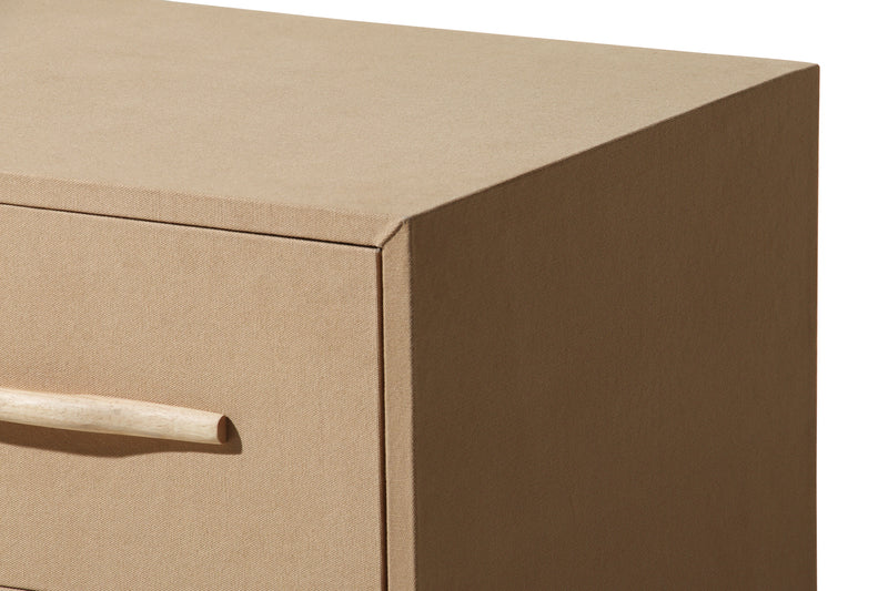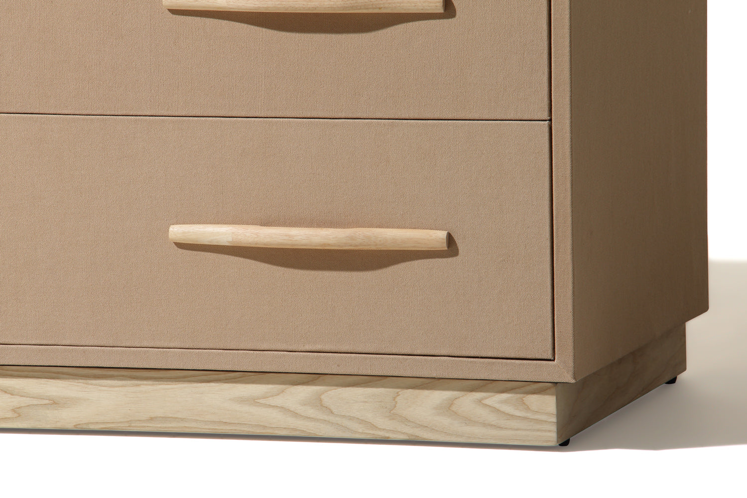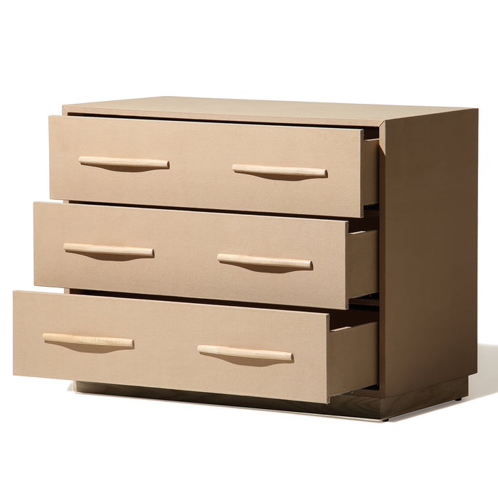 Drawer collection made using the finest of leather material drawer fronts, 100% cotton fabric out and completed with solid wood handle, base accents and self closing German hardware. Perfect for the bedroom or living space, this cabinet provides ample storage to neatly pack away all your necessities.