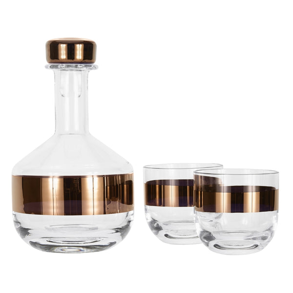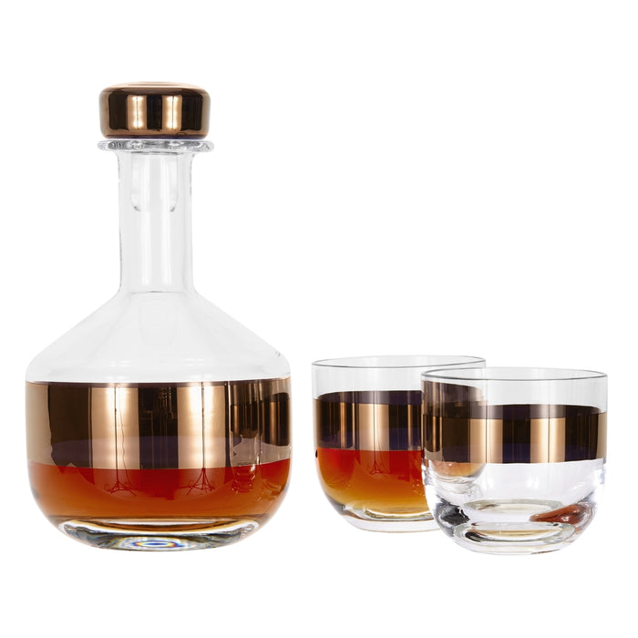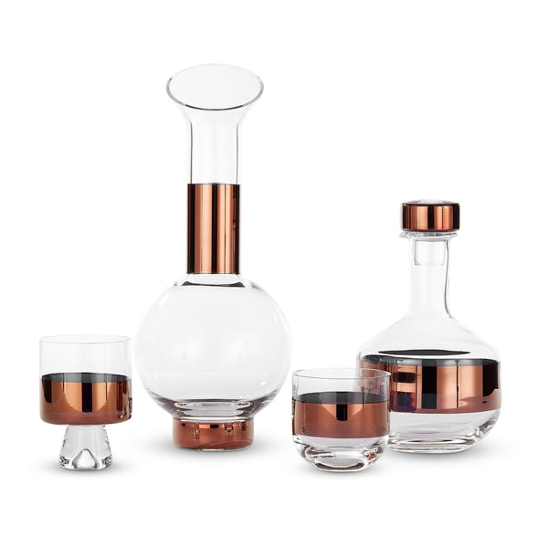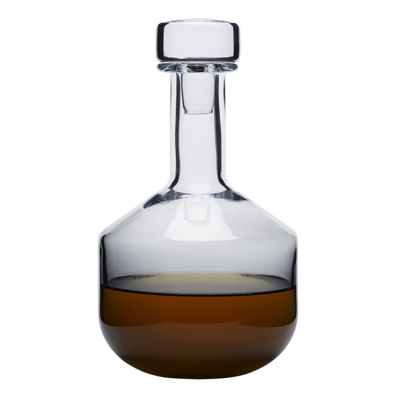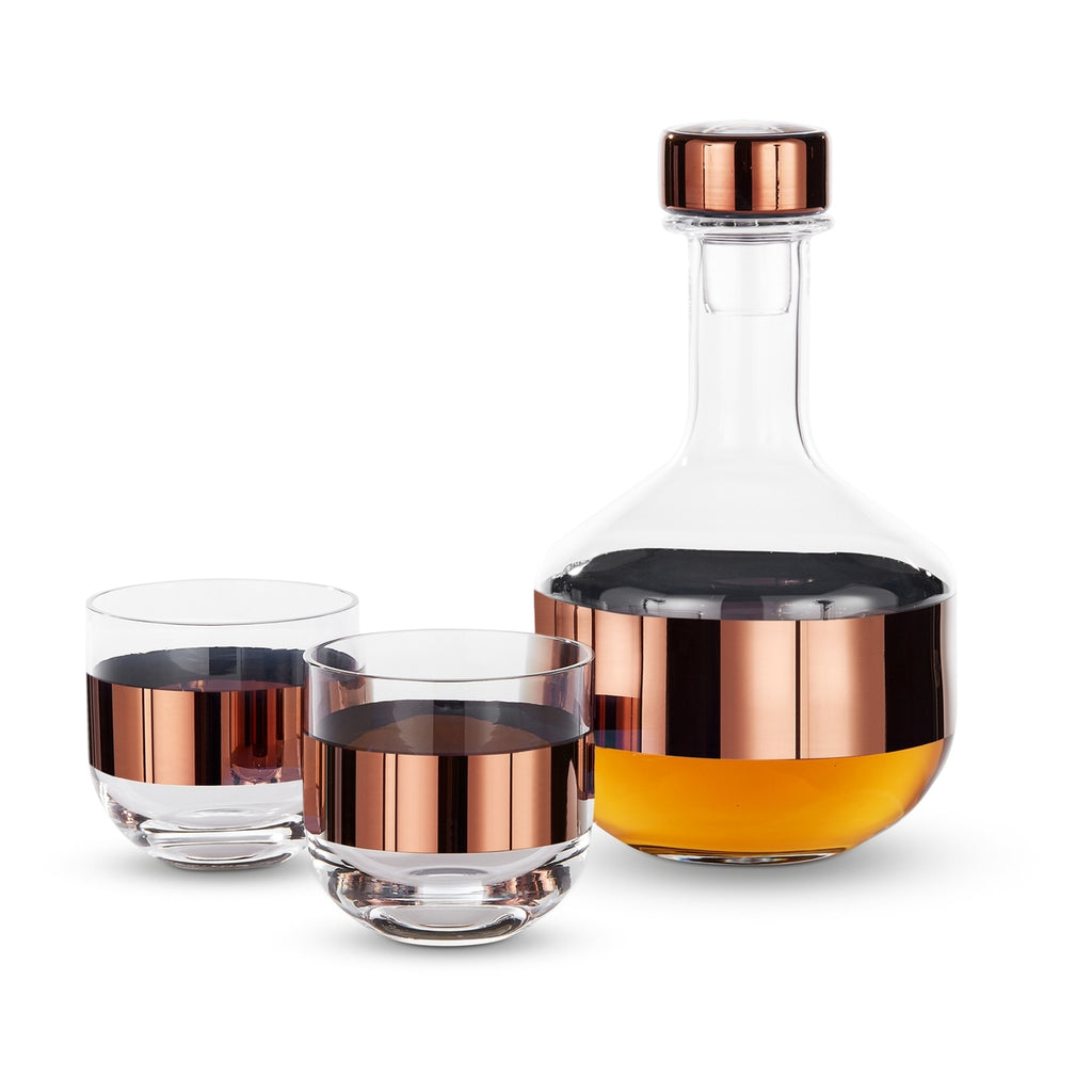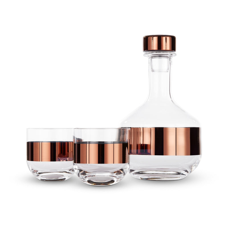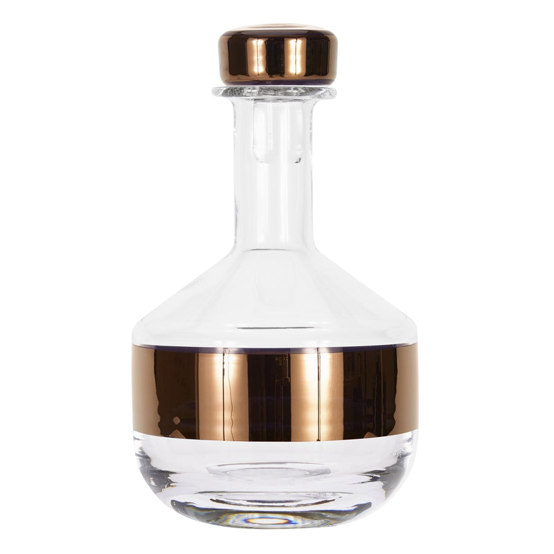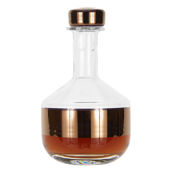 A mouth-blown whiskey decanter presented in gift-worthy packaging. Made in Poland, this decanter is ornamented with hand-painted copper detailing. This Tank decanter takes its sculptural cue from the functional shapes and volumes of scientific glassware. Featuring a hot-cut edge and an etched Tom Dixon logo.