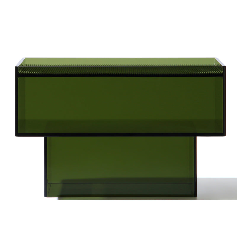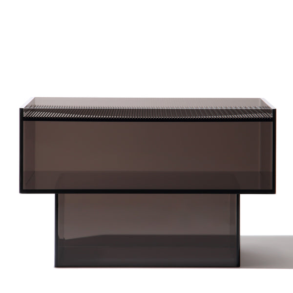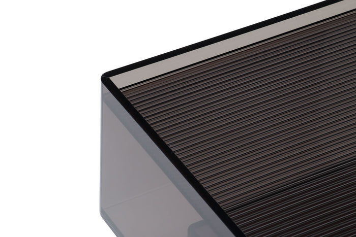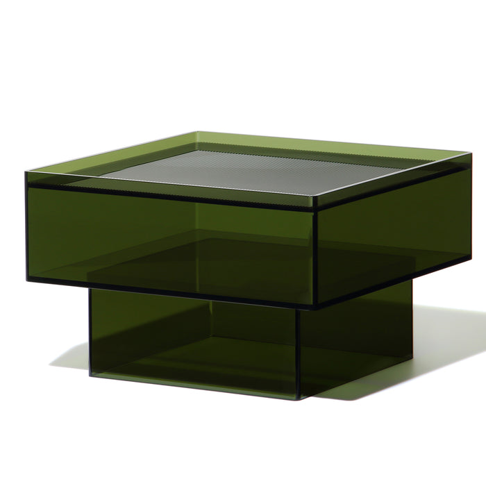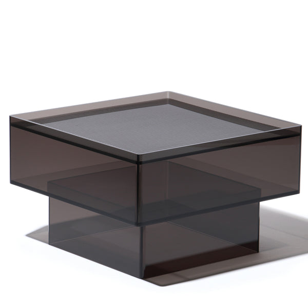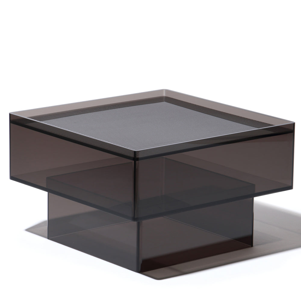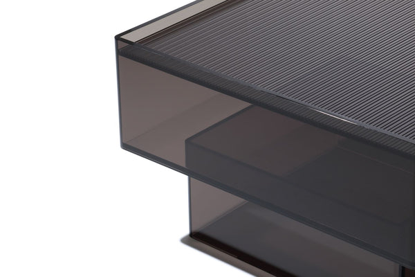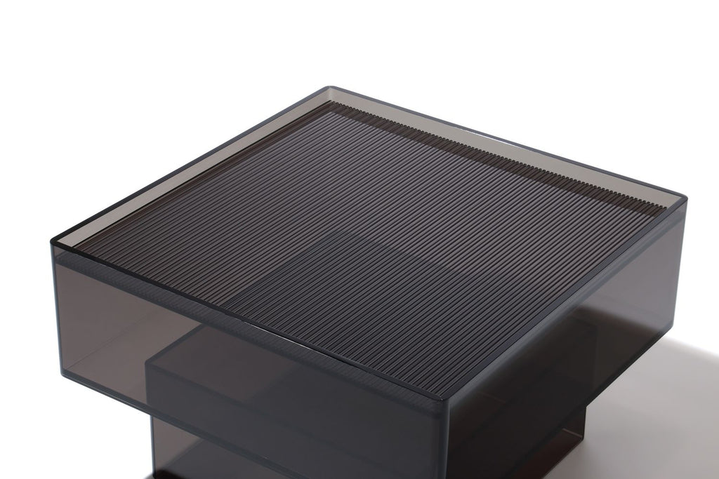Coffee table made using acrylic which has been designed to create voids internally which hold a certain depth and feeling when viewed from different angles. Top has small grooves embedded into the surface.