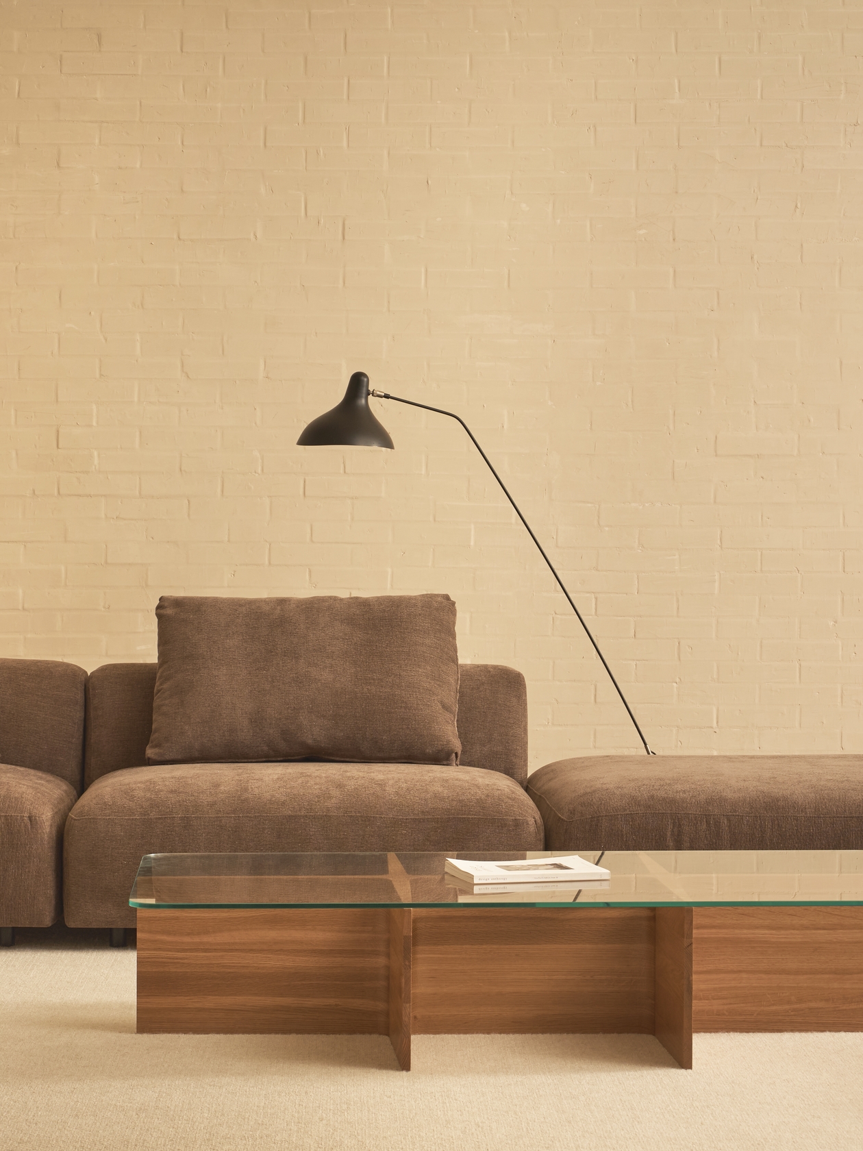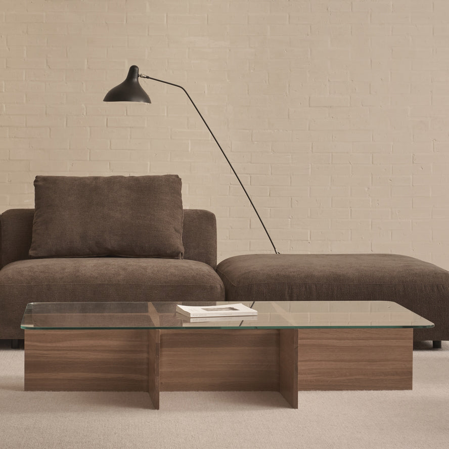 Solid timber panels in an understated T-shape form the base of the Jaunt table. Subtle and harmonious changes in the thickness of the panels, chunky at the centre and tapering out to a narrow gauge at the edge, provide an almost imperceptible dynamism, echoed by the tapered edge of the table top, which can be solid wood, natural stone or glass.