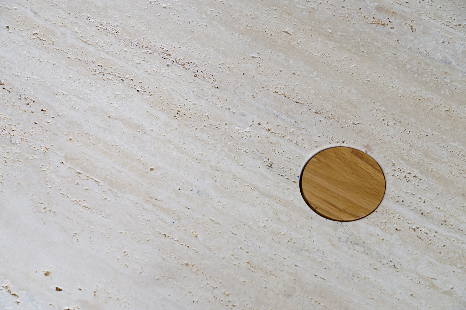 The Pivot coffee table features a solid timber dowel that meets a timber t-frame, providing contrast between the cylindrical and flat surfaces. The dowel also makes its way through to the table top creating a beautiful link and adding stunning detail to the travertine. A half length of timber dowel at the end of the table nicely mirrors the large timber leg.