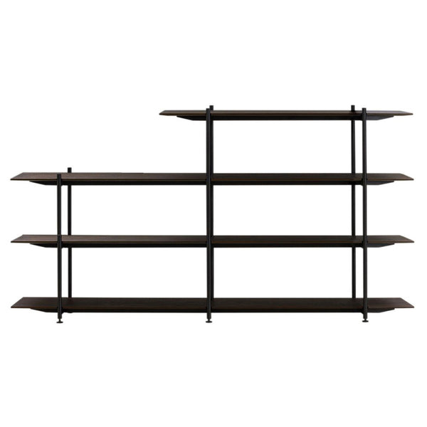 The Formal Shelving system by kindred spirit and long-time collaborator, Jonas Wagell, is constructed with only two materials. Framing and supporting the slim shelves in brown stained oak veneer, a structure consisting of horizontal and vertical trussed poles in black powder-coated steel creates a sturdy grid with subtle joints.