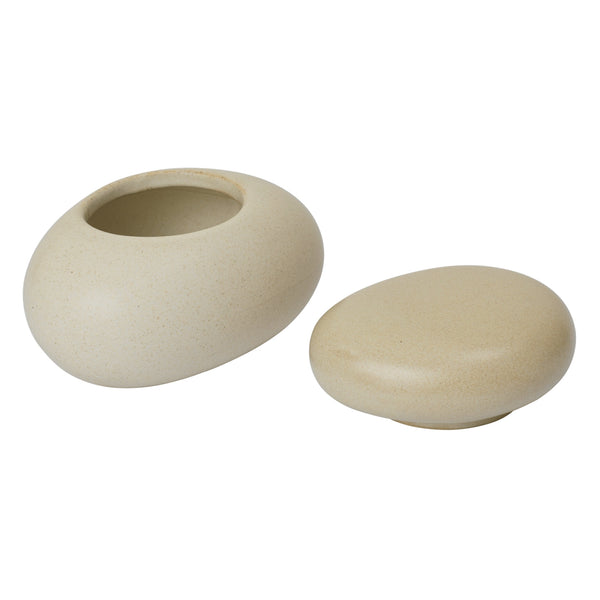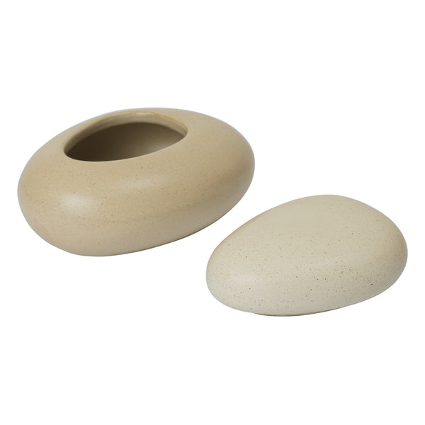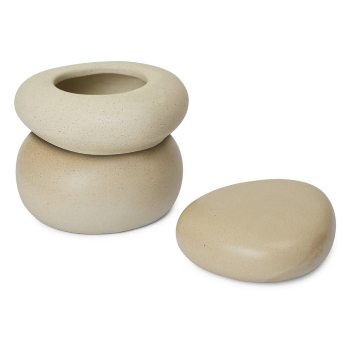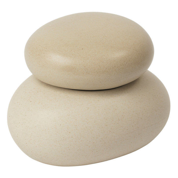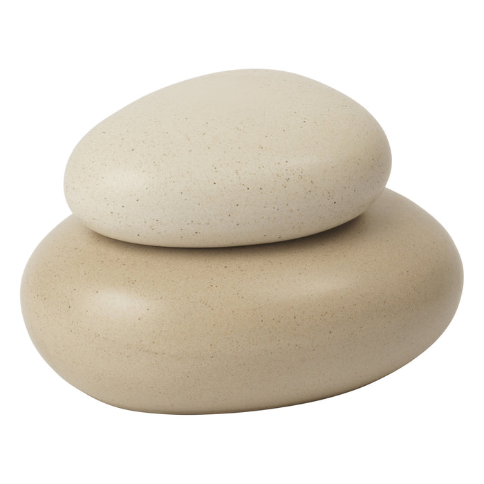 The Pebble Box draws inspiration from the natural beauty of stacked pebble stones along the coast, with each box mimicking the smooth, rounded shapes of pebbles. Crafted from glazed ceramic, it features a sleek, polished finish that highlights the elegance and calming appeal of the design. The Pebble Box is available in different sizes and can be displayed individually or stacked together for a dynamic, layered look.
