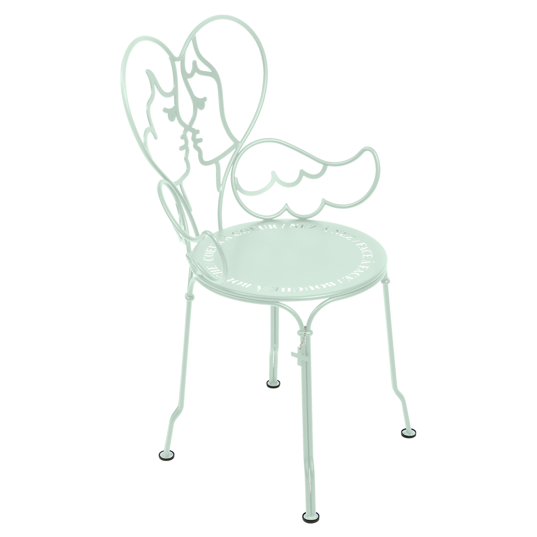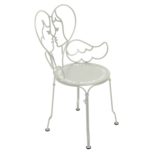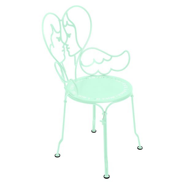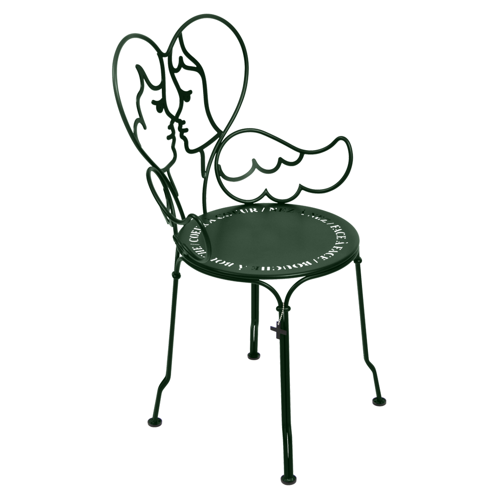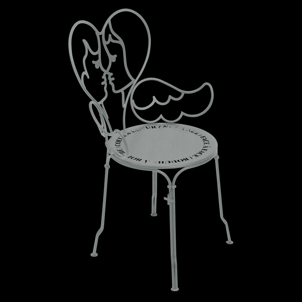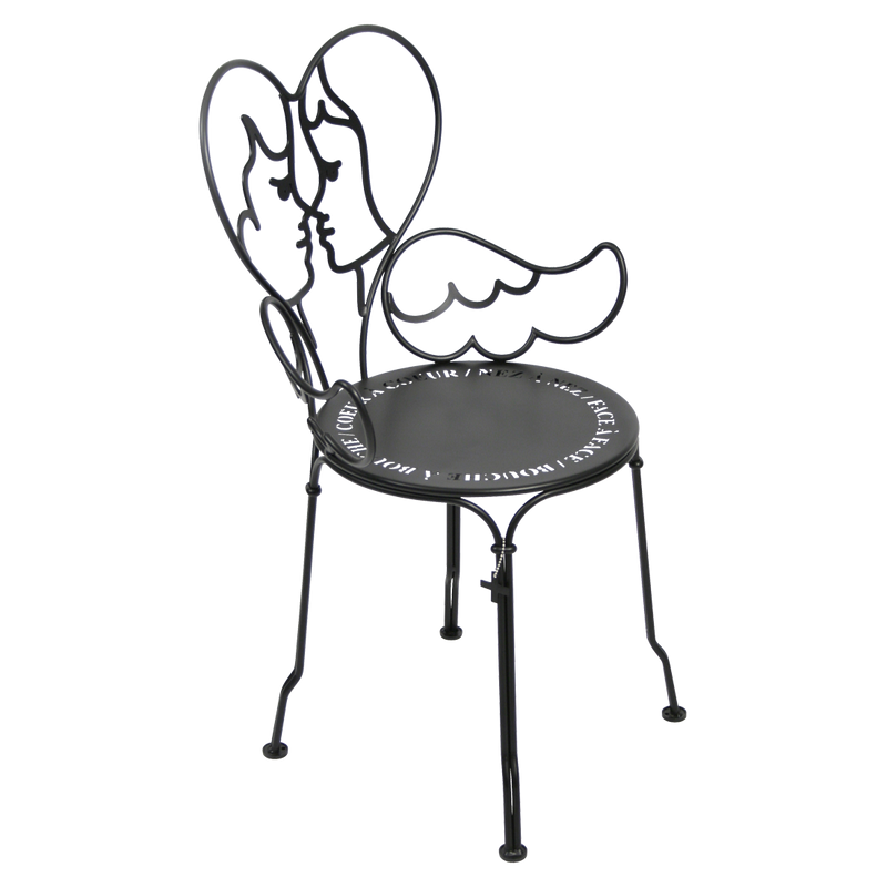 Jean-Charles de Castelbaljac is normally associated with the world of fashion, not metalwork. But he shares Fermob’s love for fine craftsmanship. This piece is his fresh take on the iconic 1900 chair. And it really is poetry in motion – an item of furniture that spreads its wings and makes us feel as if we want to fly away. The backrest of this unique, metal garden armchair takes the form of two cherubs kissing. What’s more, their outline forms a heart, which is as appealing as it is comfortable to lean against. Ange is guaranteed to add a romantic, decorative touch to your patio, terrace or indoor space. This designer chair, with its Belle Époque style, encapsulates the full breadth of Fermob’s metalwork expertise. The curved wire, and the hand-forged rings and wings on the armrests, are particularly eye-catching in their intricacy. Equally impressive are the laser-cut backrest, formed from two cherubs positioned face to face, and seat, which is reminiscent of a poem in the style of Cocteau: heart to heart, nose to nose, face to face, mouth to mouth. In fact, this metal armchair is so appealing you might have second thoughts about sitting on it. But you’d be wrong to miss out, because this piece is built to withstand the test of time thanks to Fermob’s expertise in outdoor furniture design. It’s covered with an anti-UV polyester powder coating that’s durable and hard-wearing. They’re stacking, which makes these Ange chairs extremely easy to store away. And they come in all 24 shades of the Fermob colour chart. The combination of colour and distinctive design means your interior is guaranteed to look good no matter what!