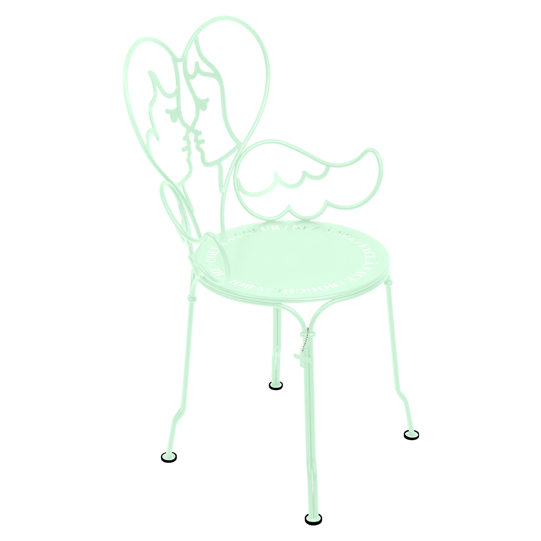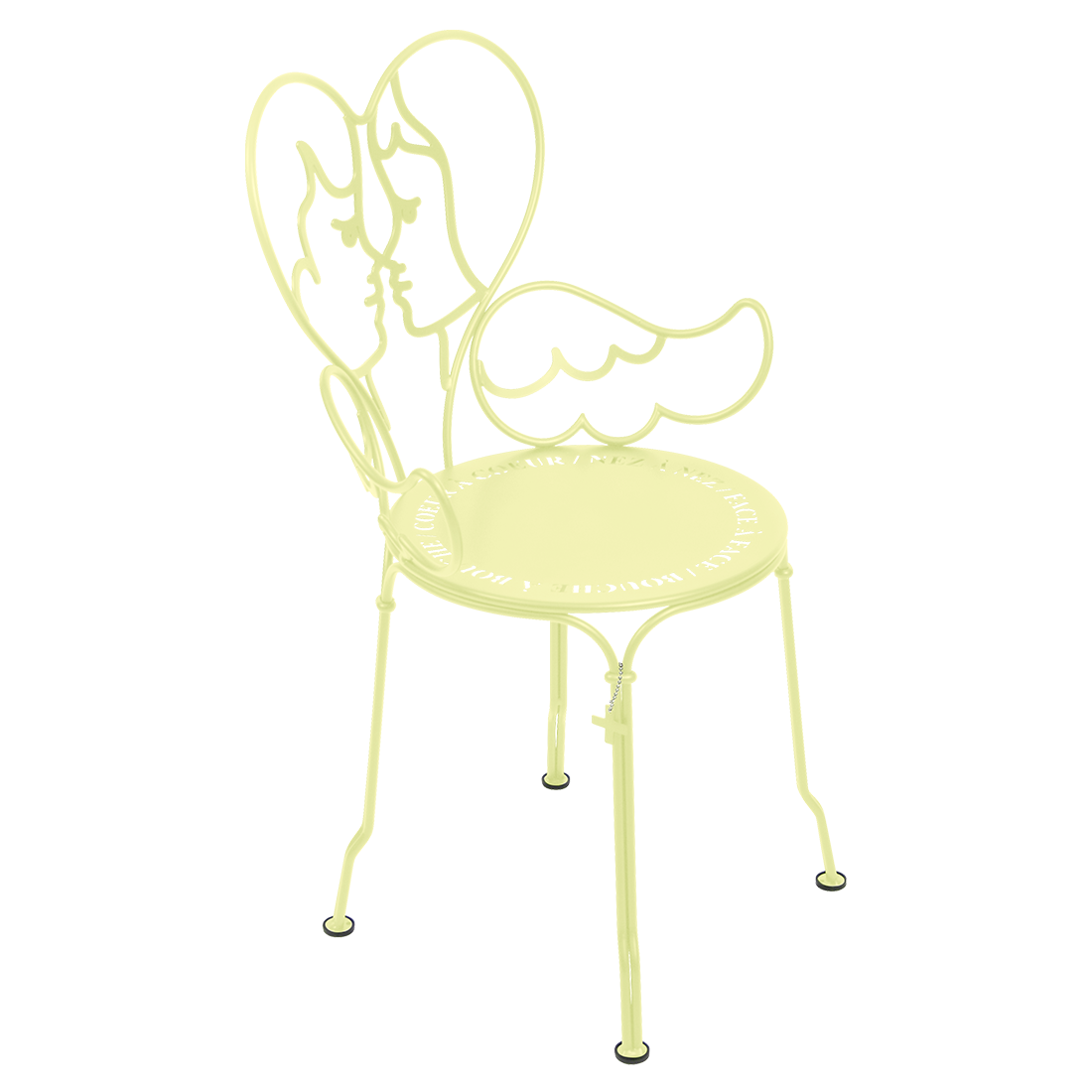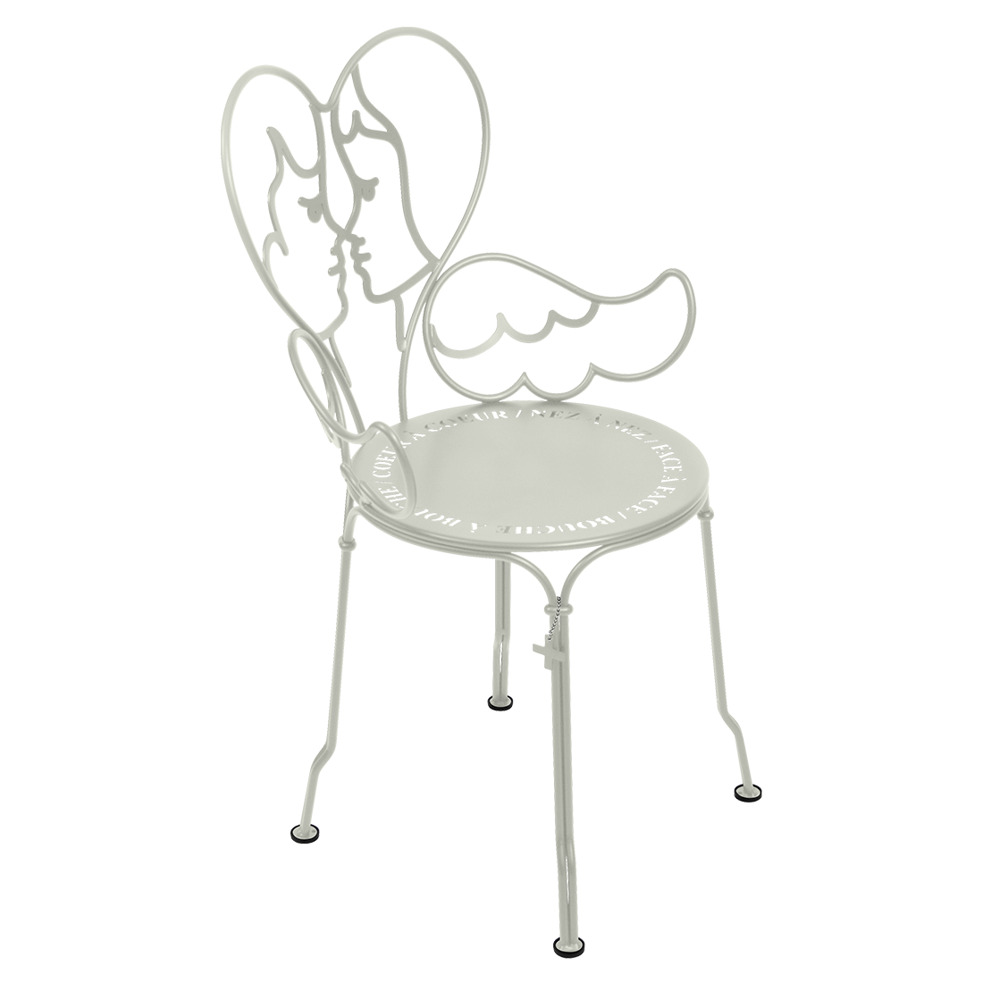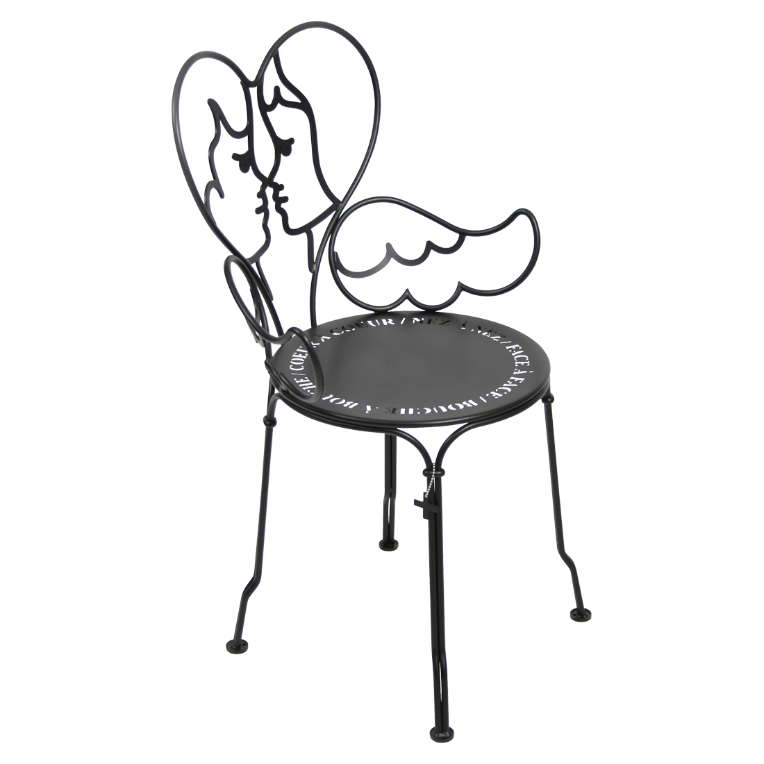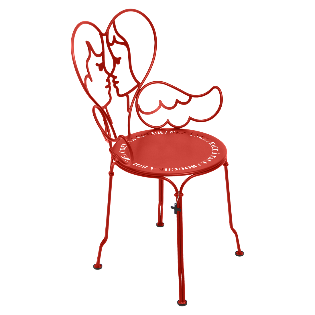 Jean-Charles de Castelbaljac is normally associated with the world of fashion, not metalwork. But he shares Fermob’s love for fine craftsmanship. This piece is his fresh take on the iconic 1900 chair. And it really is poetry in motion – an item of furniture that spreads its wings and makes us feel as if we want to fly away. The backrest of this unique, metal garden armchair takes the form of two cherubs kissing. What’s more, their outline forms a heart, which is as appealing as it is comfortable to lean against. Ange is guaranteed to add a romantic, decorative touch to your patio, terrace or indoor space. This designer chair, with its Belle Époque style, encapsulates the full breadth of Fermob’s metalwork expertise. The curved wire, and the hand-forged rings and wings on the armrests, are particularly eye-catching in their intricacy. Equally impressive are the laser-cut backrest, formed from two cherubs positioned face to face, and seat, which is reminiscent of a poem in the style of Cocteau: heart to heart, nose to nose, face to face, mouth to mouth. In fact, this metal armchair is so appealing you might have second thoughts about sitting on it. But you’d be wrong to miss out, because this piece is built to withstand the test of time thanks to Fermob’s expertise in outdoor furniture design. It’s covered with an anti-UV polyester powder coating that’s durable and hard-wearing. They’re stacking, which makes these Ange chairs extremely easy to store away. And they come in all 24 shades of the Fermob colour chart. The combination of colour and distinctive design means your interior is guaranteed to look good no matter what!