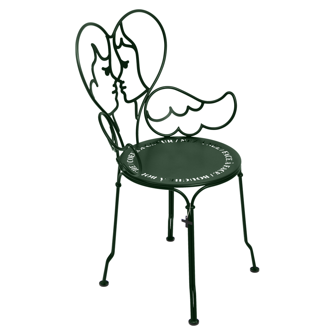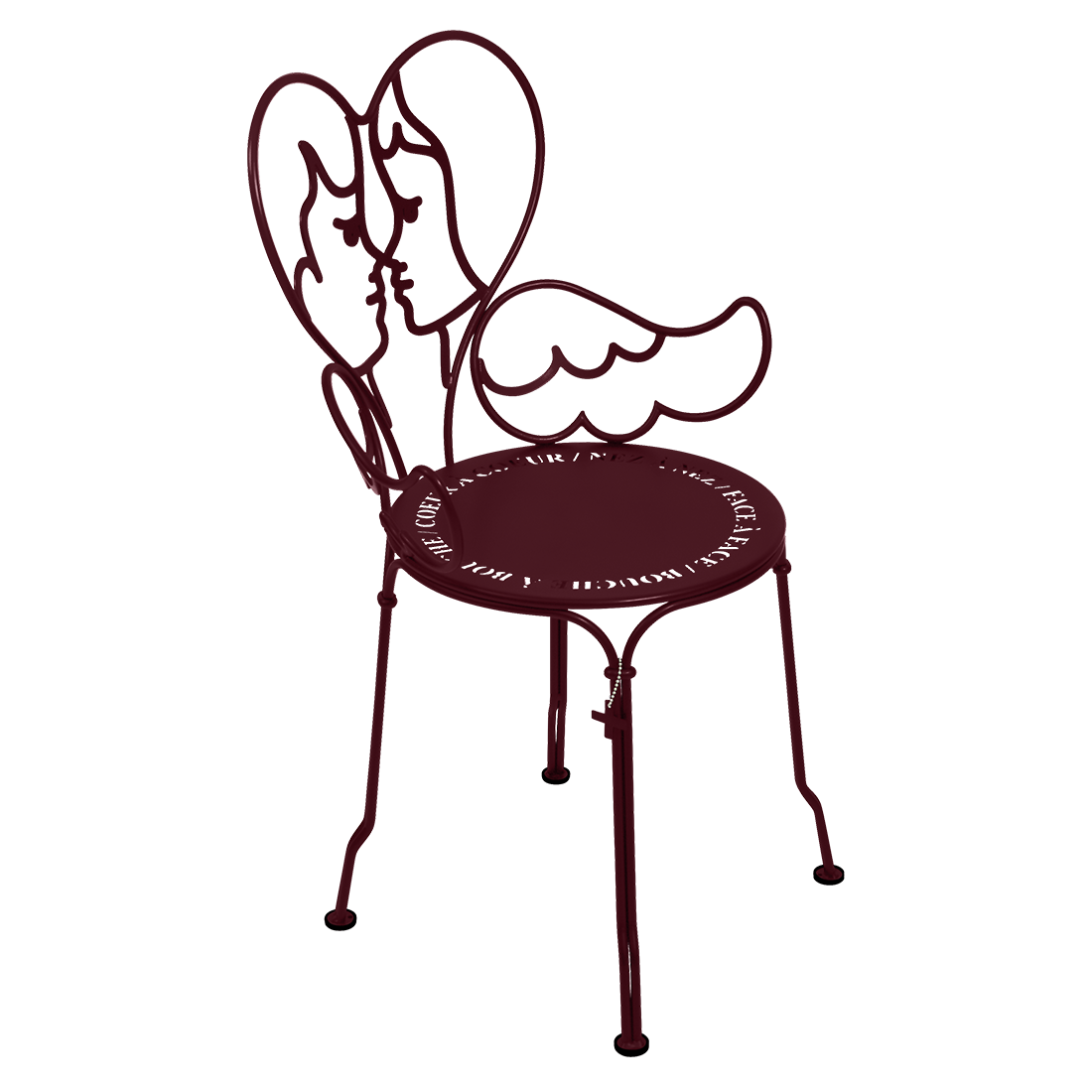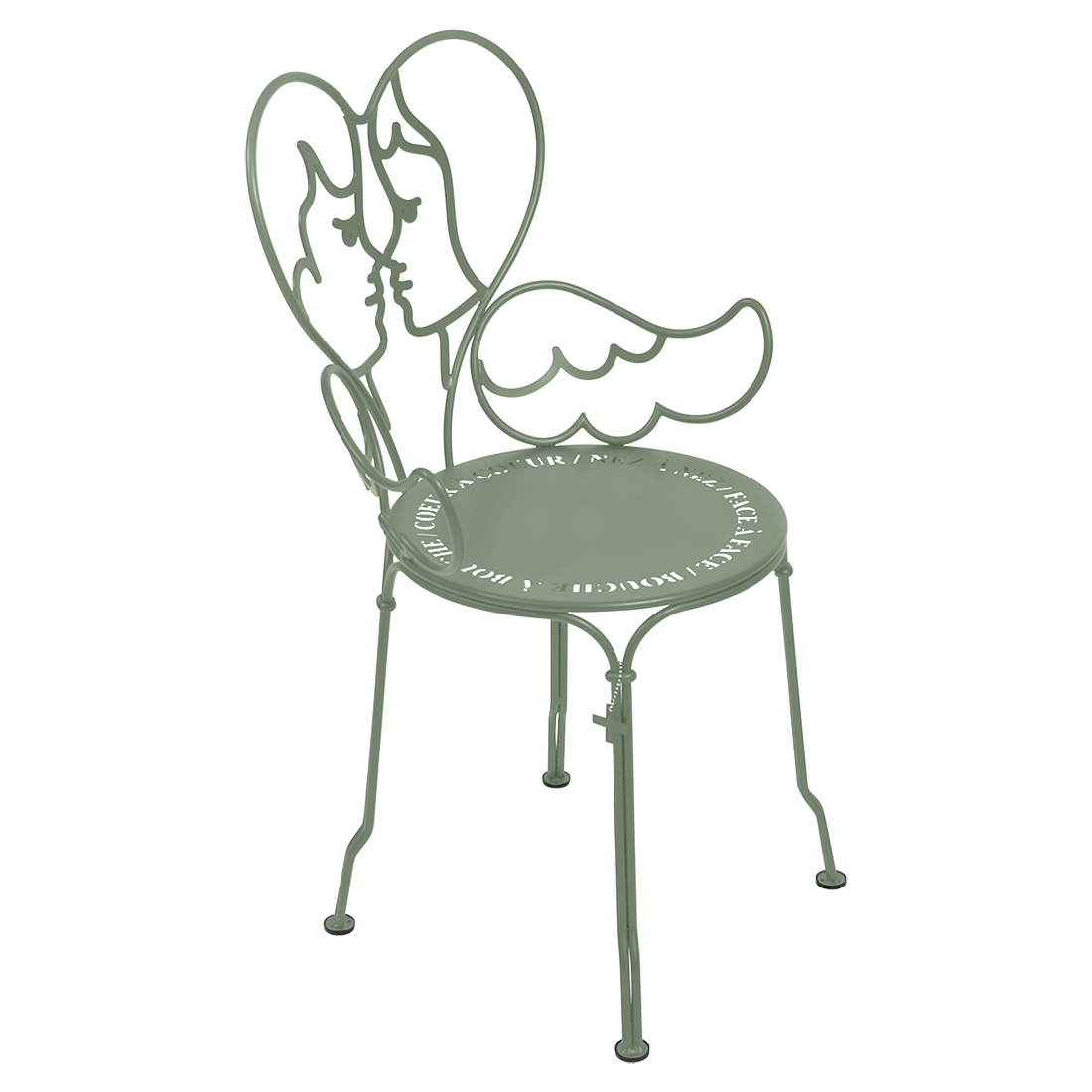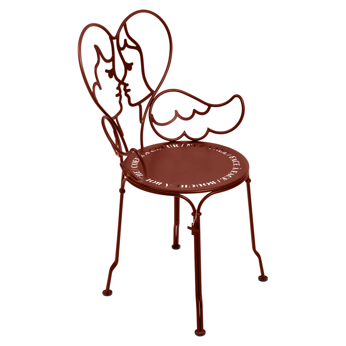 Jean-Charles de Castelbaljac is normally associated with the world of fashion, not metalwork. But he shares Fermob’s love for fine craftsmanship. This piece is his fresh take on the iconic 1900 chair. And it really is poetry in motion – an item of furniture that spreads its wings and makes us feel as if we want to fly away. The backrest of this unique, metal garden armchair takes the form of two cherubs kissing. What’s more, their outline forms a heart, which is as appealing as it is comfortable to lean against. Ange is guaranteed to add a romantic, decorative touch to your patio, terrace or indoor space. This designer chair, with its Belle Époque style, encapsulates the full breadth of Fermob’s metalwork expertise. The curved wire, and the hand-forged rings and wings on the armrests, are particularly eye-catching in their intricacy. Equally impressive are the laser-cut backrest, formed from two cherubs positioned face to face, and seat, which is reminiscent of a poem in the style of Cocteau: heart to heart, nose to nose, face to face, mouth to mouth. In fact, this metal armchair is so appealing you might have second thoughts about sitting on it. But you’d be wrong to miss out, because this piece is built to withstand the test of time thanks to Fermob’s expertise in outdoor furniture design. It’s covered with an anti-UV polyester powder coating that’s durable and hard-wearing. They’re stacking, which makes these Ange chairs extremely easy to store away. And they come in all 24 shades of the Fermob colour chart. The combination of colour and distinctive design means your interior is guaranteed to look good no matter what!