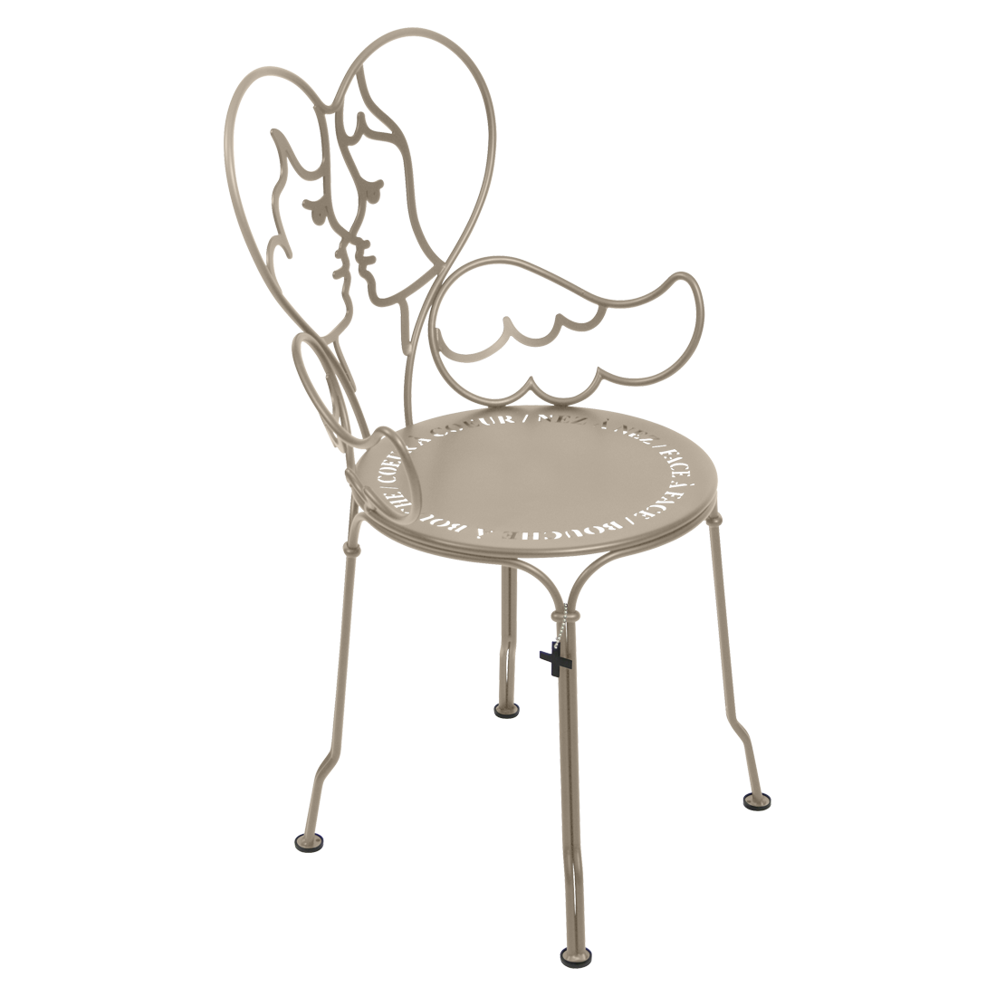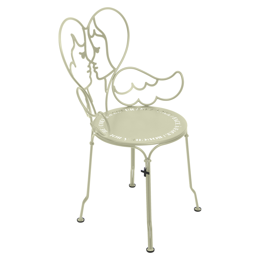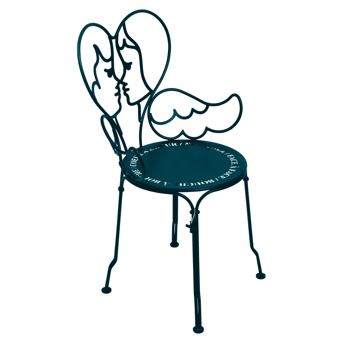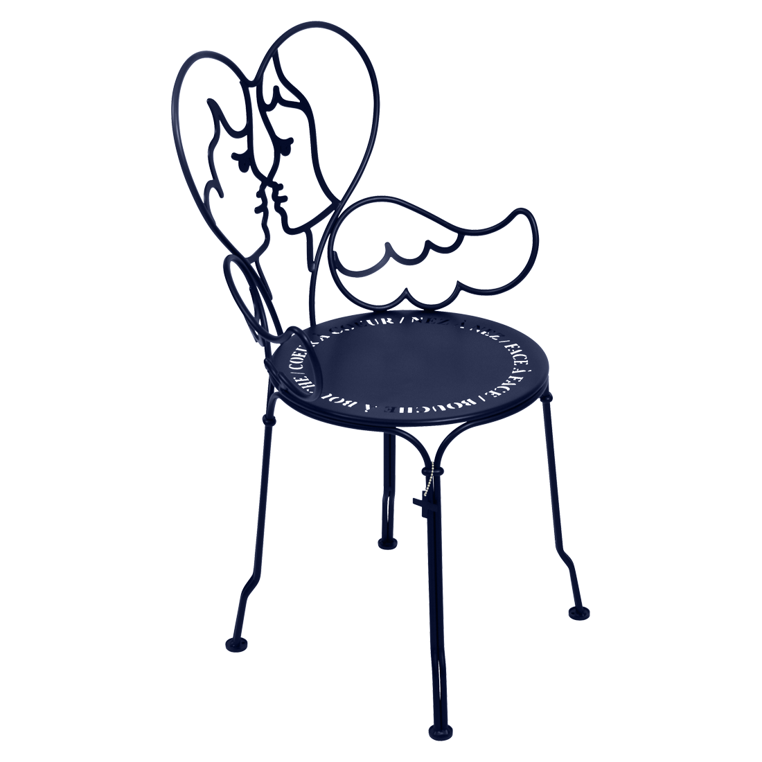 Jean-Charles de Castelbaljac is normally associated with the world of fashion, not metalwork. But he shares Fermob’s love for fine craftsmanship. This piece is his fresh take on the iconic 1900 chair. And it really is poetry in motion – an item of furniture that spreads its wings and makes us feel as if we want to fly away. The backrest of this unique, metal garden armchair takes the form of two cherubs kissing. What’s more, their outline forms a heart, which is as appealing as it is comfortable to lean against. Ange is guaranteed to add a romantic, decorative touch to your patio, terrace or indoor space. This designer chair, with its Belle Époque style, encapsulates the full breadth of Fermob’s metalwork expertise. The curved wire, and the hand-forged rings and wings on the armrests, are particularly eye-catching in their intricacy. Equally impressive are the laser-cut backrest, formed from two cherubs positioned face to face, and seat, which is reminiscent of a poem in the style of Cocteau: heart to heart, nose to nose, face to face, mouth to mouth. In fact, this metal armchair is so appealing you might have second thoughts about sitting on it. But you’d be wrong to miss out, because this piece is built to withstand the test of time thanks to Fermob’s expertise in outdoor furniture design. It’s covered with an anti-UV polyester powder coating that’s durable and hard-wearing. They’re stacking, which makes these Ange chairs extremely easy to store away. And they come in all 24 shades of the Fermob colour chart. The combination of colour and distinctive design means your interior is guaranteed to look good no matter what!