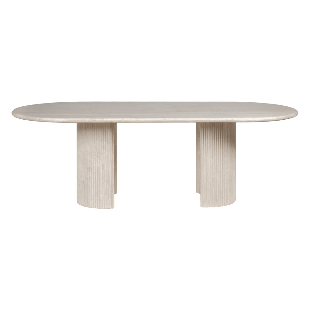 The Lucent is a creamy travertine statement that balances raw beauty with architectural poise. Its elongated stone top reveals unique, organic veining; twin pedestal bases lend an ordered symmetry and reassuring stability. This table is designed to be the quiet focal point of a dining room — generous in proportion, precise in detail, and made to centre conversation. Pair with mixed seating to soften the geometry, or match with more sculptural chairs for a refined, cohesive feel.