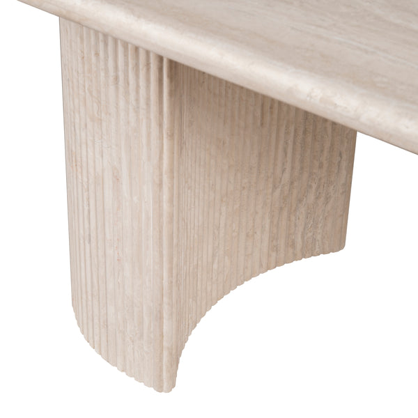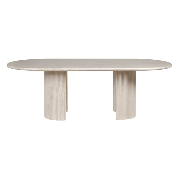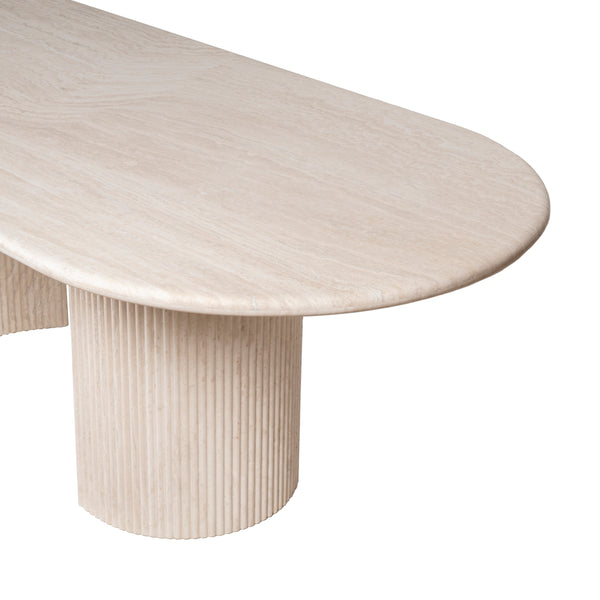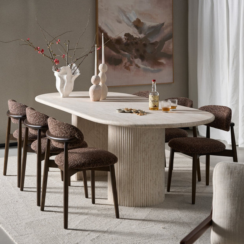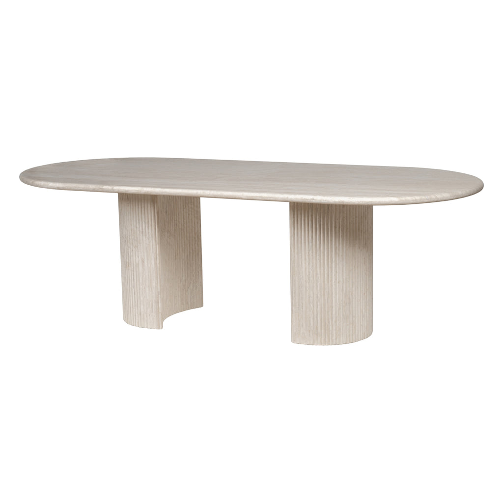 The Lucent is a creamy travertine statement that balances raw beauty with architectural poise. Its elongated stone top reveals unique, organic veining; twin pedestal bases lend an ordered symmetry and reassuring stability. This table is designed to be the quiet focal point of a dining room — generous in proportion, precise in detail, and made to centre conversation. Pair with mixed seating to soften the geometry, or match with more sculptural chairs for a refined, cohesive feel.