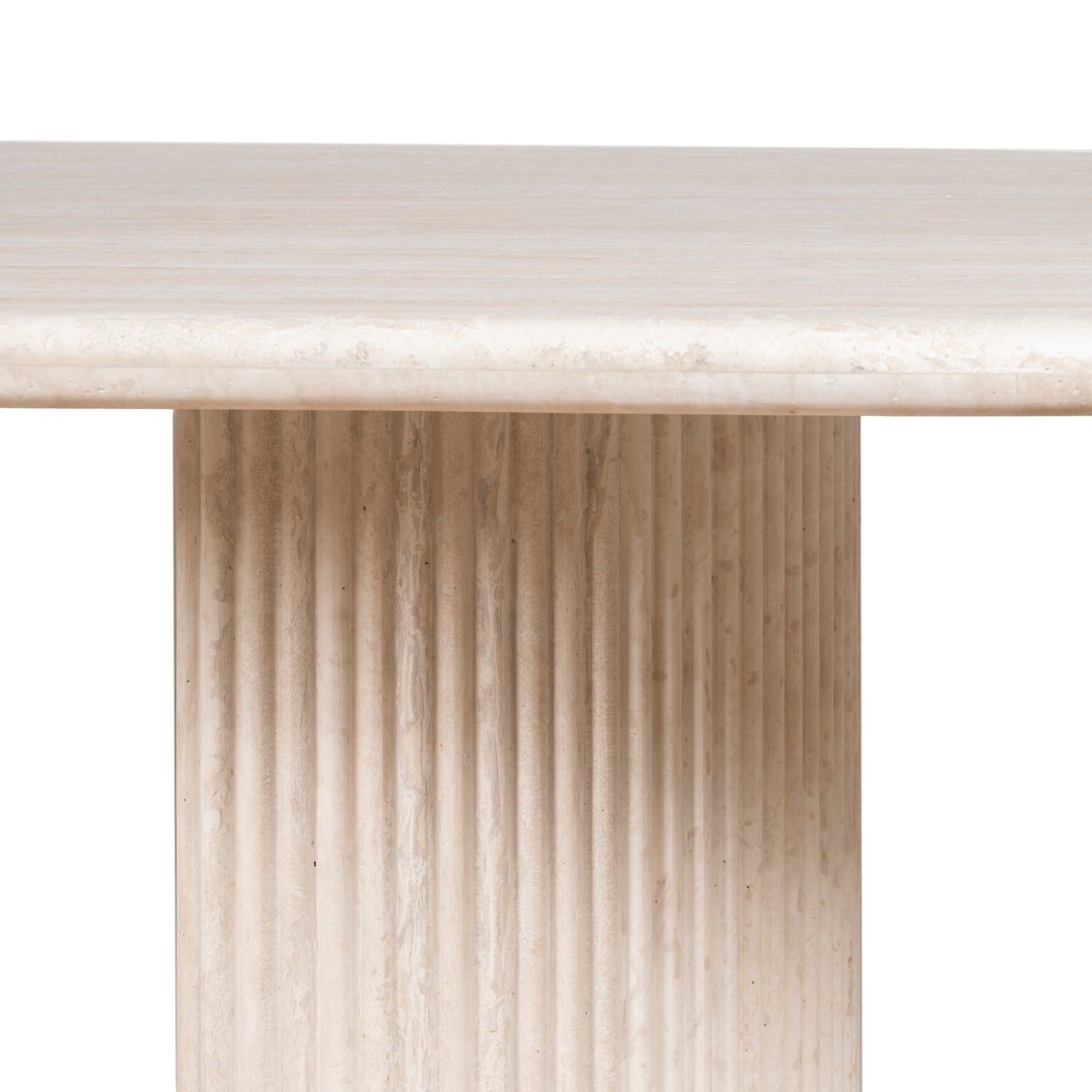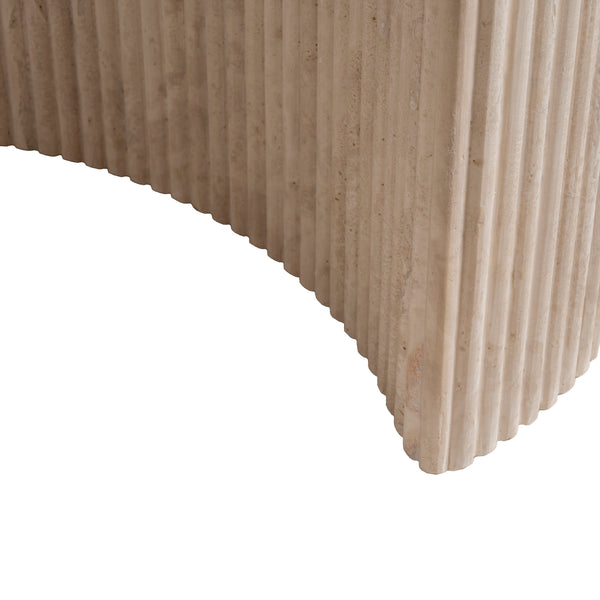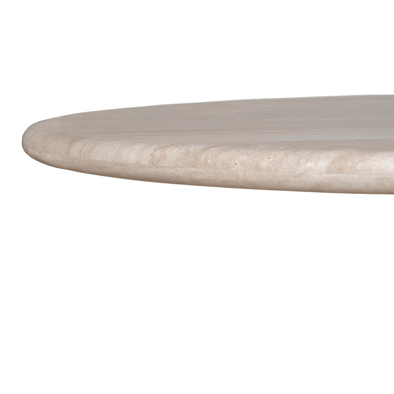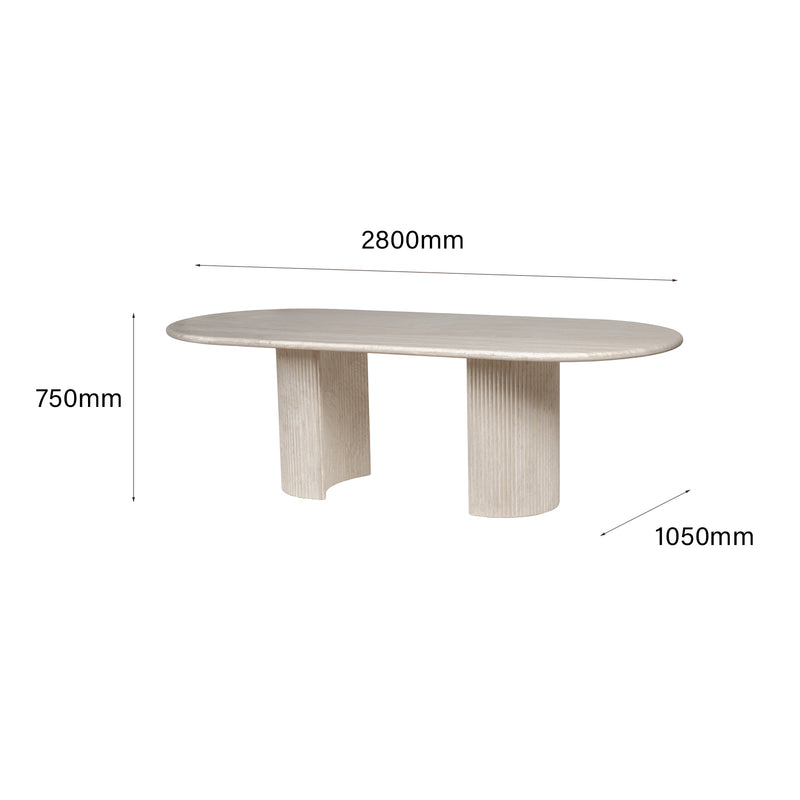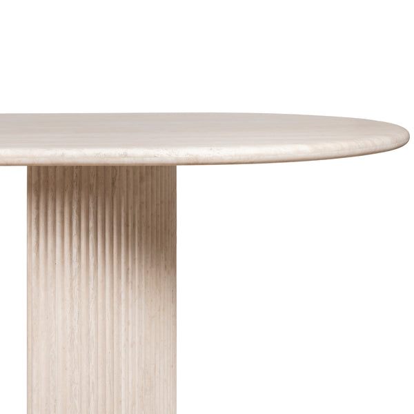 The Lucent is a creamy travertine statement that balances raw beauty with architectural poise. Its elongated stone top reveals unique, organic veining; twin pedestal bases lend an ordered symmetry and reassuring stability. This table is designed to be the quiet focal point of a dining room — generous in proportion, precise in detail, and made to centre conversation. Pair with mixed seating to soften the geometry, or match with more sculptural chairs for a refined, cohesive feel.