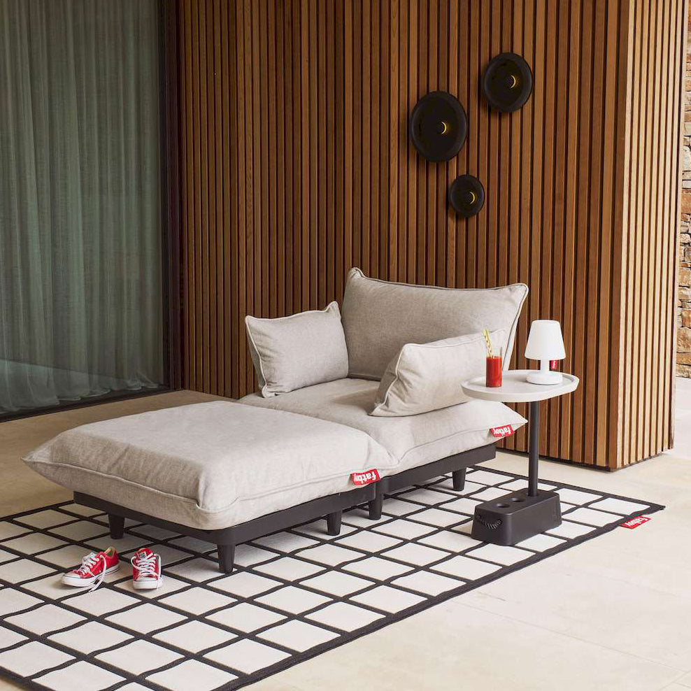 Relaxing, eating, drinking, tanning: everything is possible with the Paletti lounge set, inspired by a pallet base frame. Choose the elements that you need and create your own ideal pallet lounge set. Whether you want to go for an intimate lounge sofa, or a complete garden set with a corner sofa, table, and separate chairs - the possibilities are endless. With this multifunctional lounge set, you'll know one thing for sure: everything's paletti.In addition to flexibility and comfort, Paletti offers premium quality. The modules are made with recycled materials as much as possible. The back cushions are filled with excess filling foam, and the base frame contains recyclable plastic. The rest of the lounge set was also produced sustainably. Whether it's the UV-resistant and waterproof cushions covered with durable olefin fabric, or the stainless back rest with premium powder coating: Paletti guarantees an endless lounge experience. Sit back and relax. In case of (heavy) rainfall and during the off-season, we recommend using the Paletti Cover or better, to store your Paletti under a roof and on a dry floor or surface.
