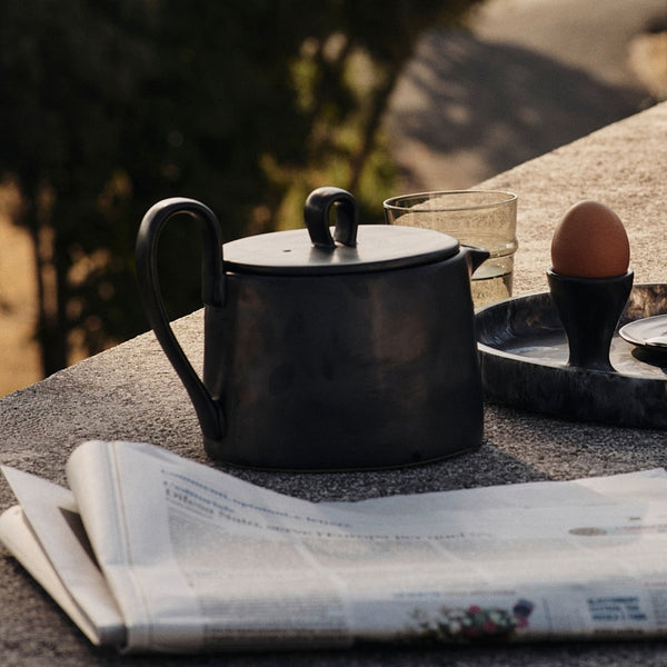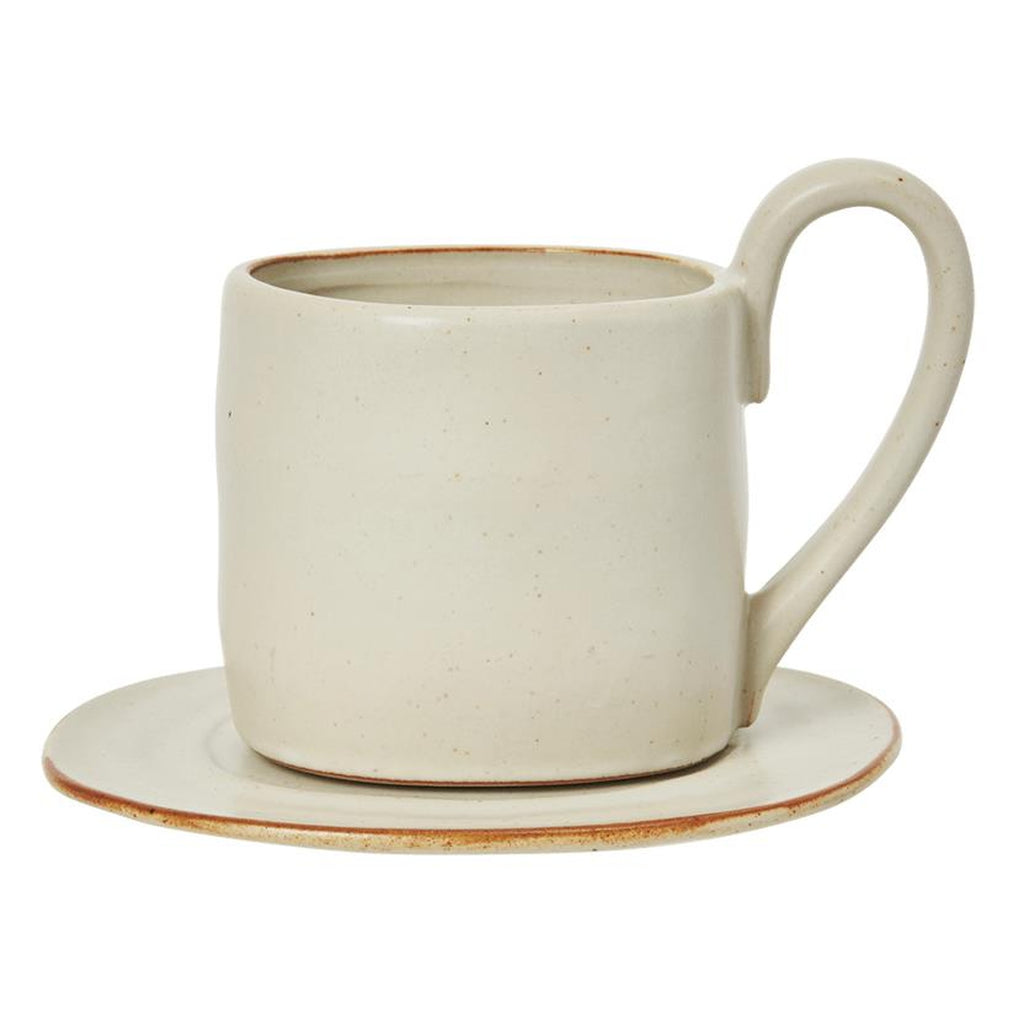 The Flow Mug with Saucer is part of a series of perfectly imperfect tableware made to modern sensibilities using traditional craftsmanship techniques. Made from stoneware with a semi-matte glaze, it features a gently rounded silhouette and a curved handle that adds a playful touch. The saucer adds a practical and elegant detail, ideal for serving with a biscuit.