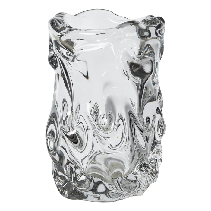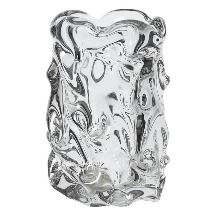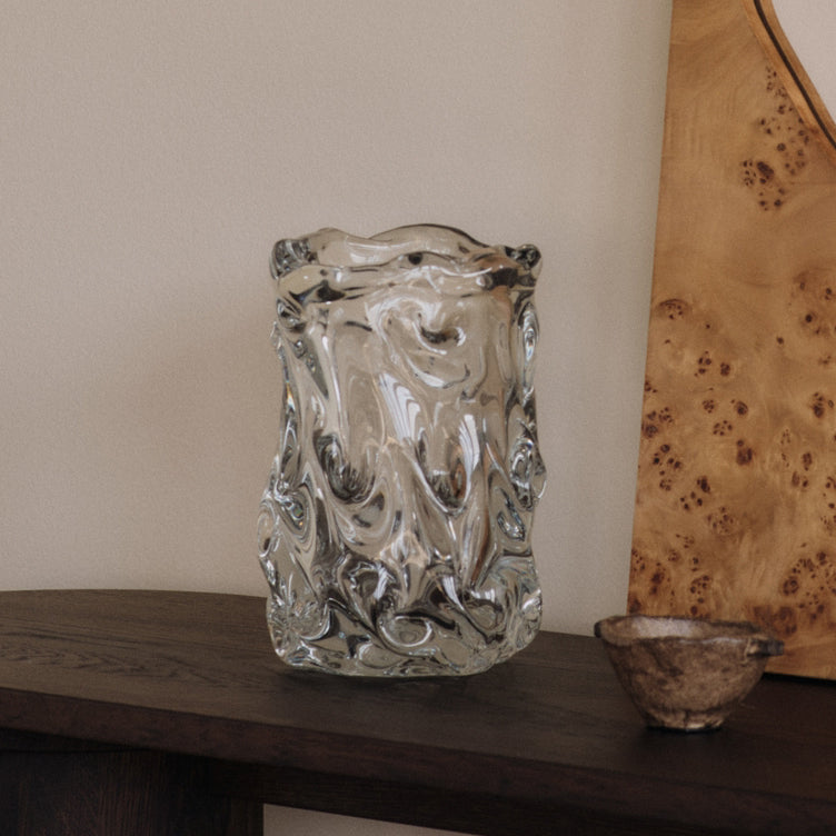 The Virelle Vase is crafted from mouth-blown glass with a form that captures gentle motion. Its rippling silhouette evokes the feeling of swells and vibrations, bringing a fluid, sculptural presence to the room. A considered piece that adds a quiet sense of movement to your space.