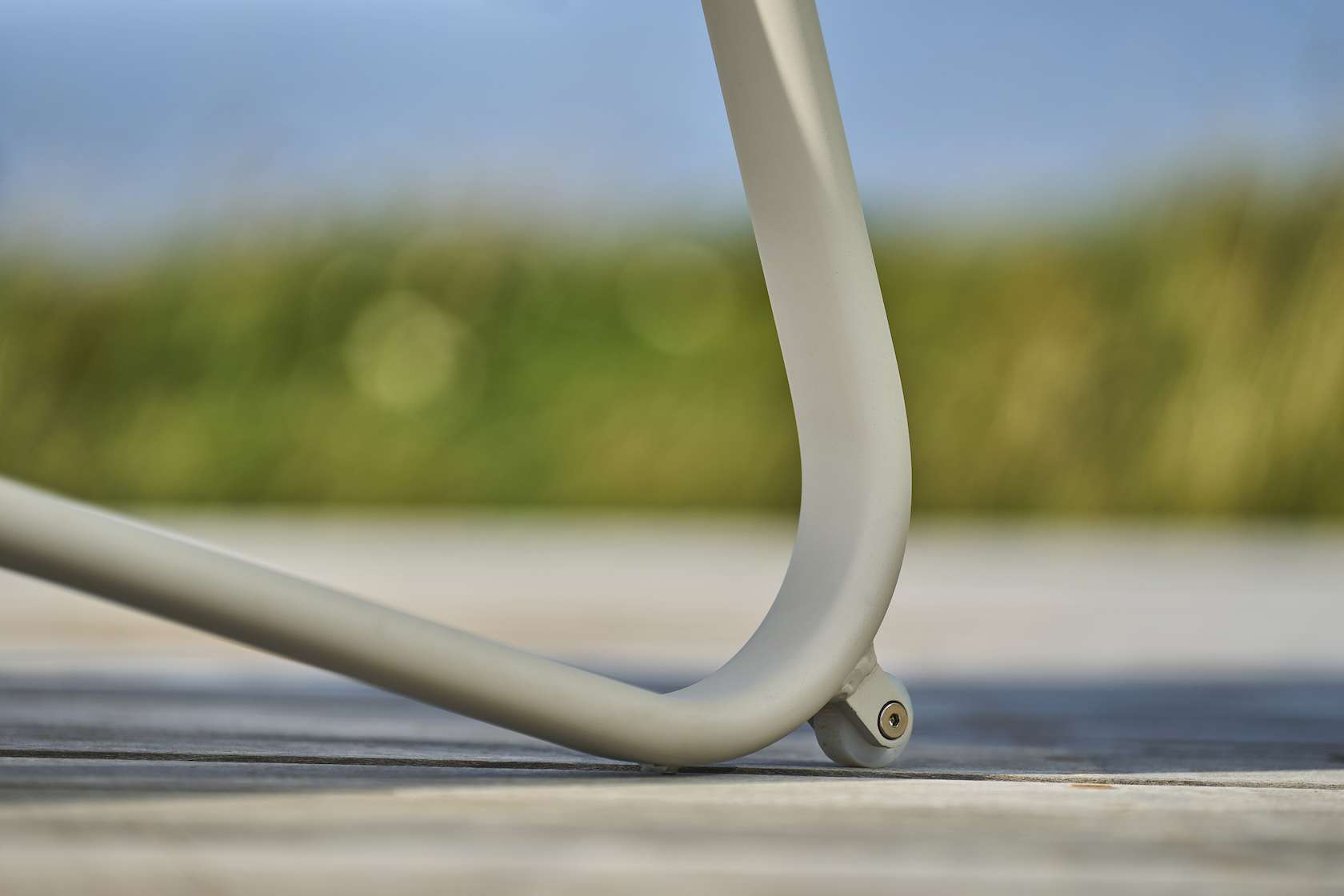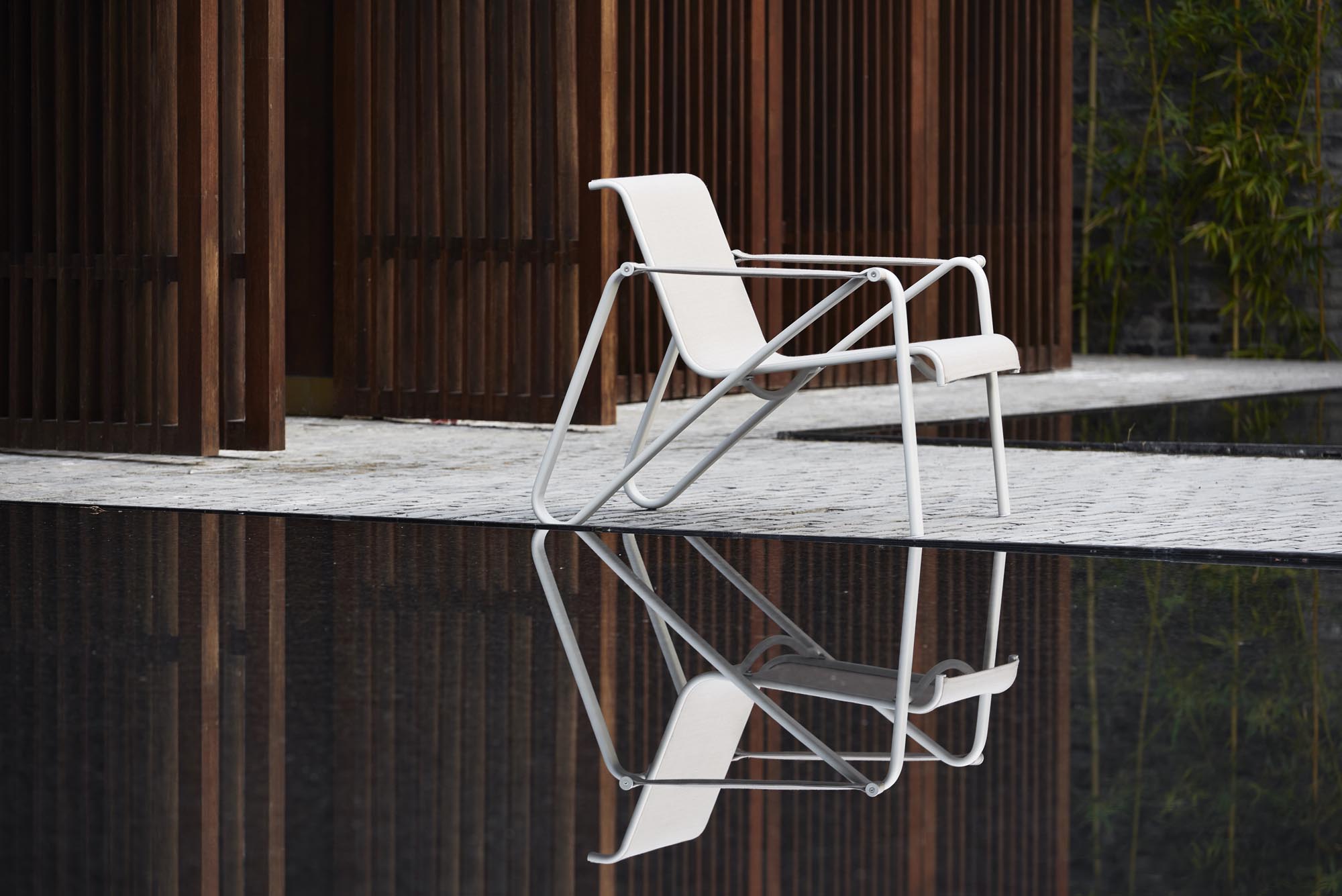 A lounge chair designed with special aluminium profiles and durable Batyline fabric. Designed for use in hotels or private homes. Easy to clean and, after a rain shower, the special, open Batyline fabric will dry quickly, allowing this lounge chair to be used all year around in all sorts of climates. No extra cushion is needed to achieve sublime comfort. In essence, a chair for those who just want to enjoy the moment but do not always have a lot of time to spare. Designed by Thomas E.Alken.