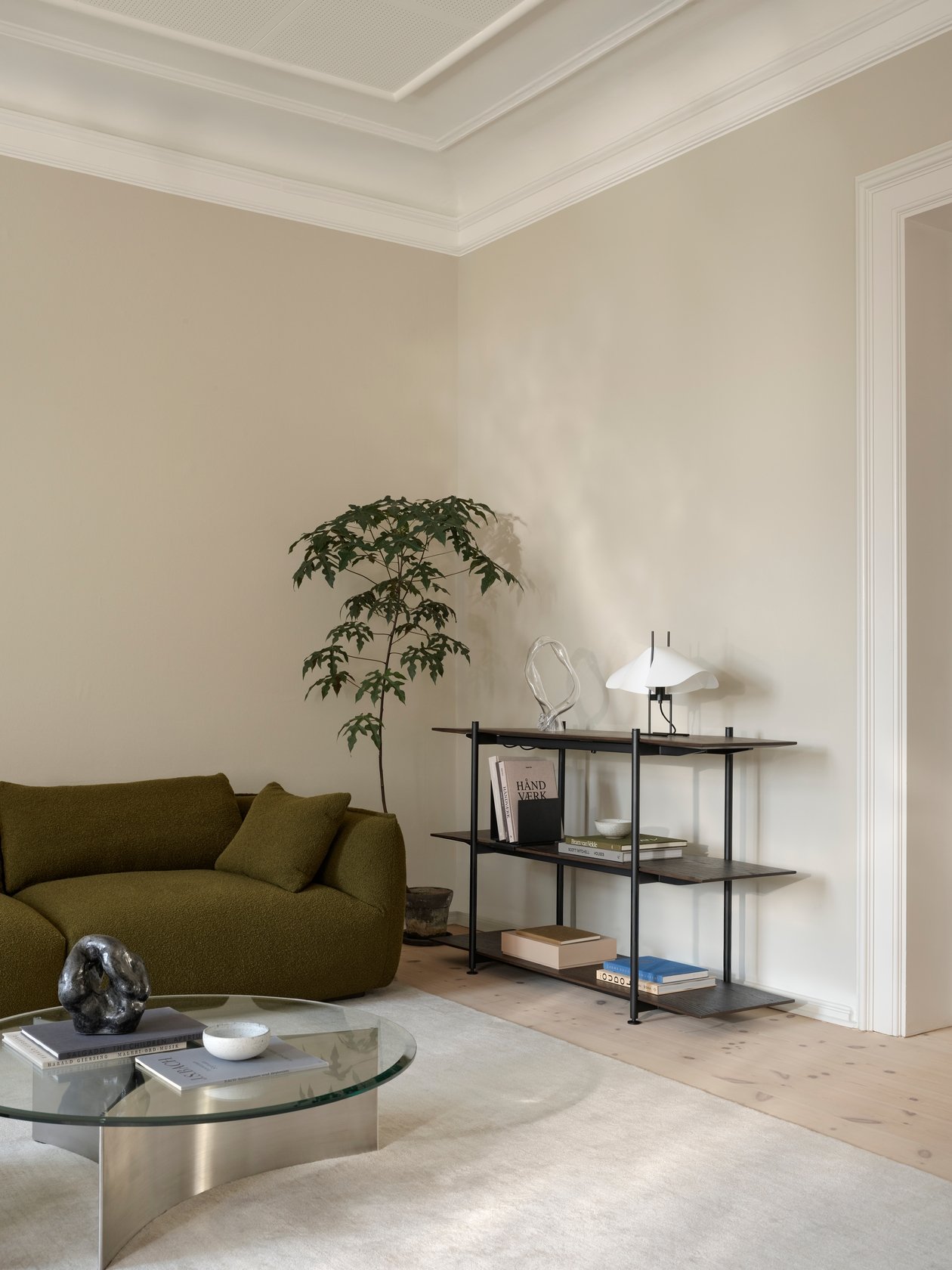Juxtaposing the solid base and the lightness of the slightly translucent tabletop, Arc prompts a contemporary take on the well-known typology. The dark glass simultaneously reflects the surroundings while revealing the sculptural silhouette of the base whilst the subtle polishing along the edge of the tabletop adds the finishing touches.