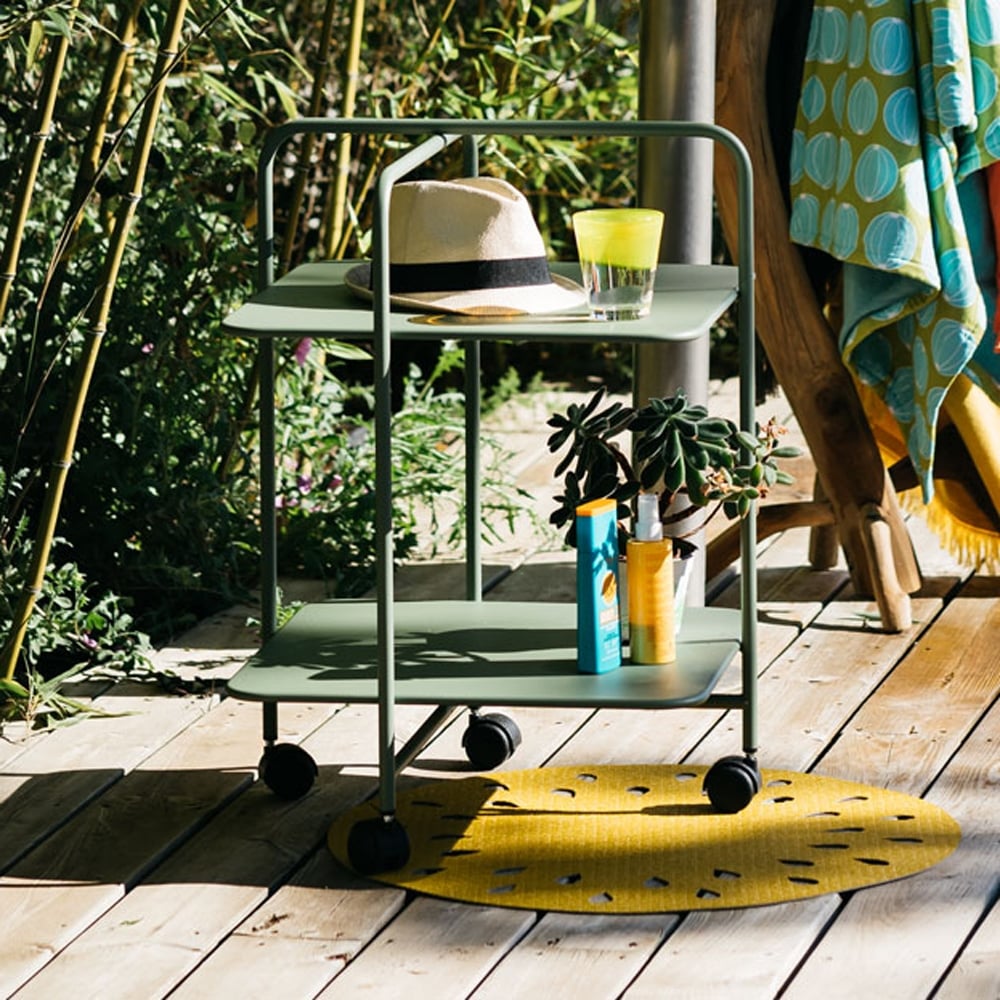 A modern trolley sidebar with a clean, 1950s-inspired look. With its integrated handle and wheels, this metal pedestal table is a new, modern, colourful take on the traditional serving trolley. It is a highly versatile product suited to a wide range of uses: in&out, plates or plants, office or terrace side bar, or even a mini-bar. Alfred knows no limits. It is a functional and attentive piece. Yet it also has a touch of the decorative about it, with its array of colourful outfits and asymmetrical frame. The ideal servant – perfectly at home indoors and outdoors!