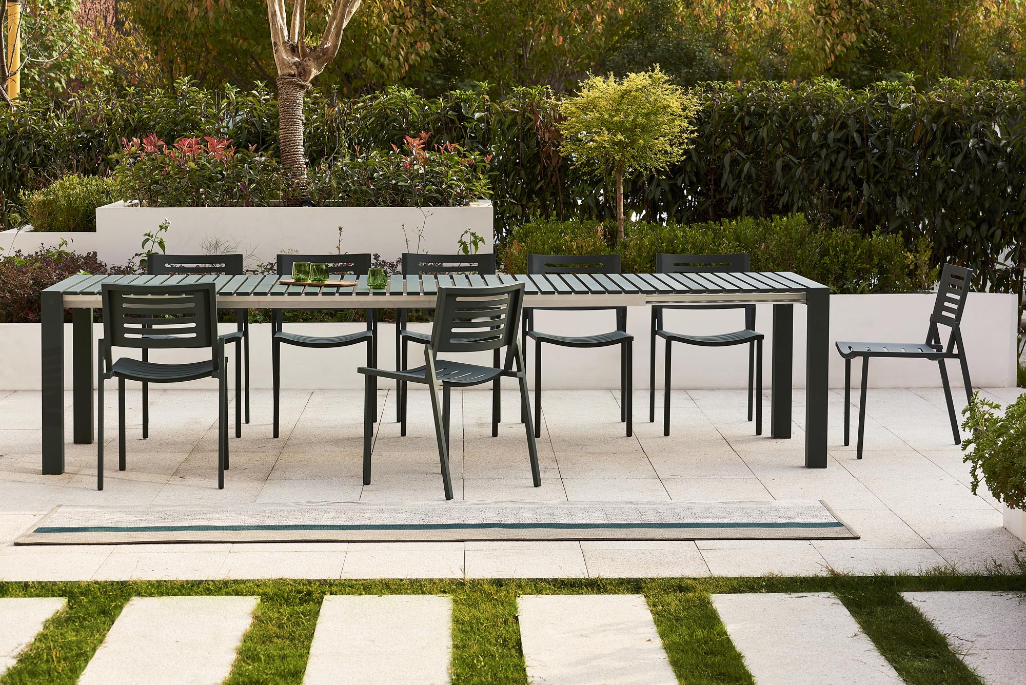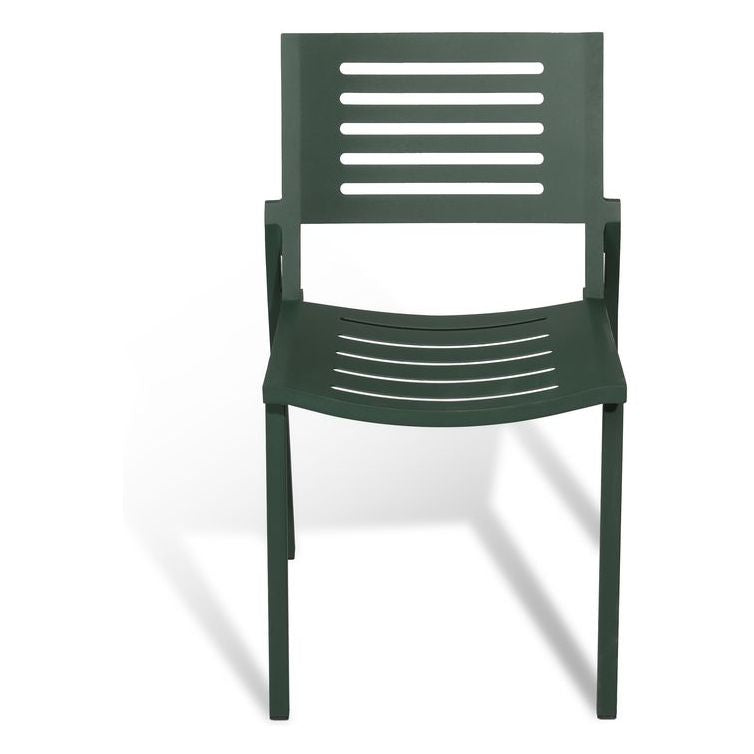 Stackable aluminium chair designed for those who prefer a simple and durable design with excellent comfort. Available in a deep shade of green, making it a compelling companion to Mindo 111 extending table.