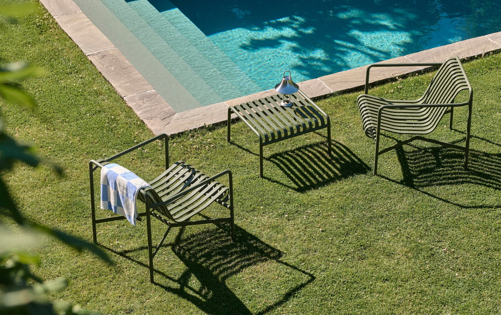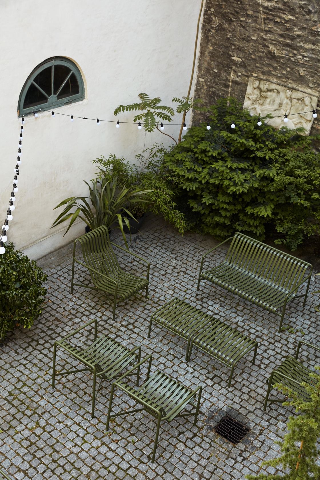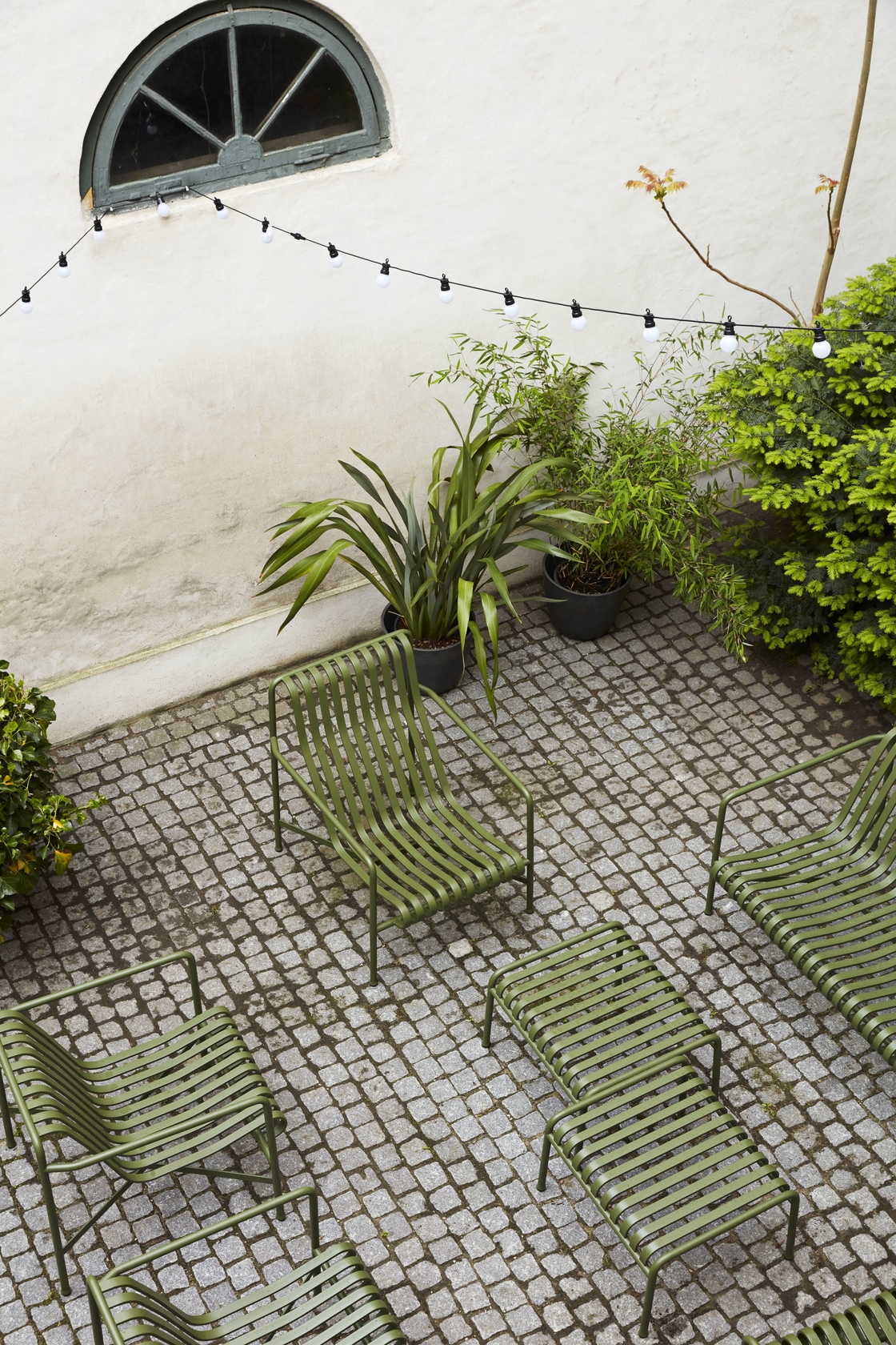 Palissade is a collection of outdoor furniture designed by Ronan and Erwan Bouroullec for HAY. The collection was designed to fit a wide variety of environments: cafés, restaurants, gardens, terraces and balconies. The construction allows a wide range of typologies with a common formal language. From stools and benches to chairs and tables, lounge chairs and sofas – the collection comprises 13 different elements, united not only by their graphical image but also by their common characteristics: they are strong without being bulky, elegant without being fragile.