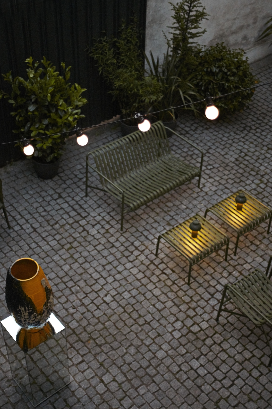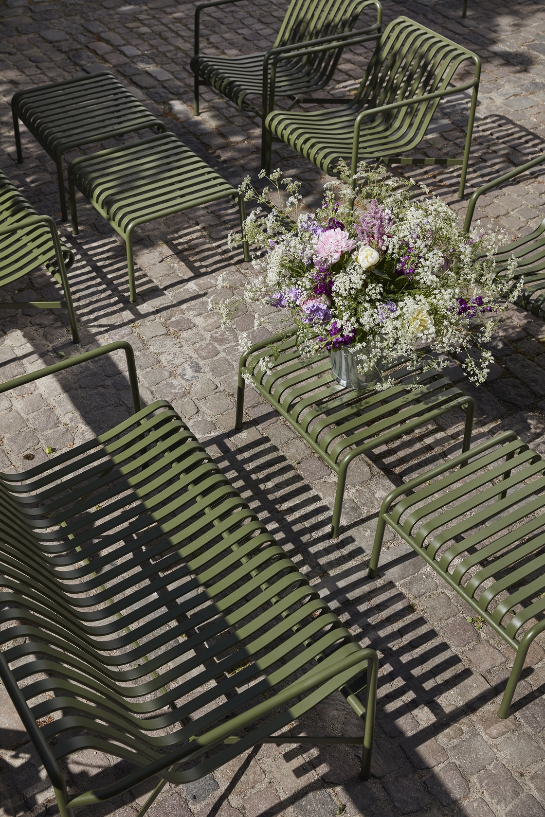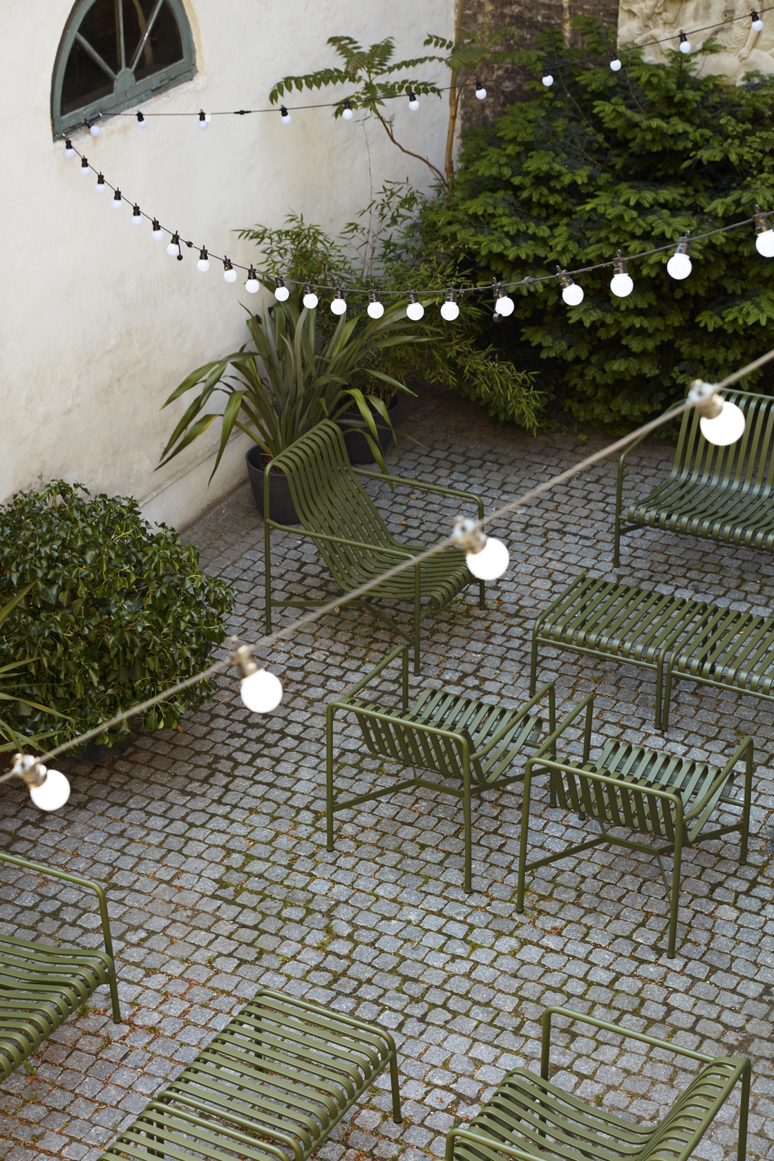 Palissade is a collection of outdoor furniture designed by Ronan and Erwan Bouroullec for HAY. The collection was designed to fit a wide variety of environments: cafés, restaurants, gardens, terraces and balconies. The construction allows a wide range of typologies with a common formal language. From stools and benches to chairs and tables, lounge chairs and sofas – the collection comprises 13 different elements, united not only by their graphical image but also by their common characteristics: they are strong without being bulky, elegant without being fragile.