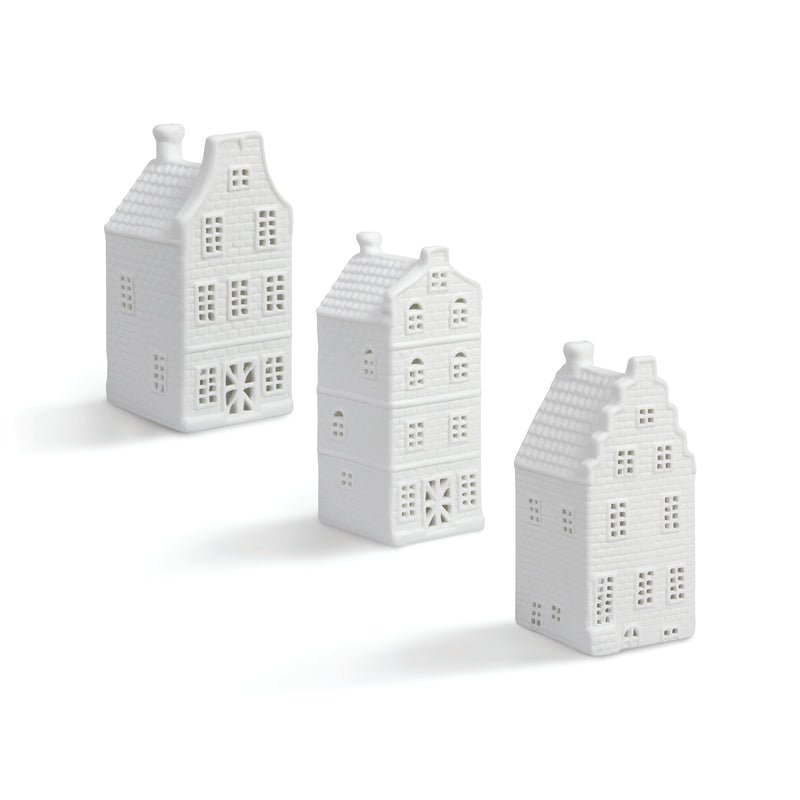 Bring Amsterdam into your living room with these canal houses made of porcelain. Suitable for one tealight.
