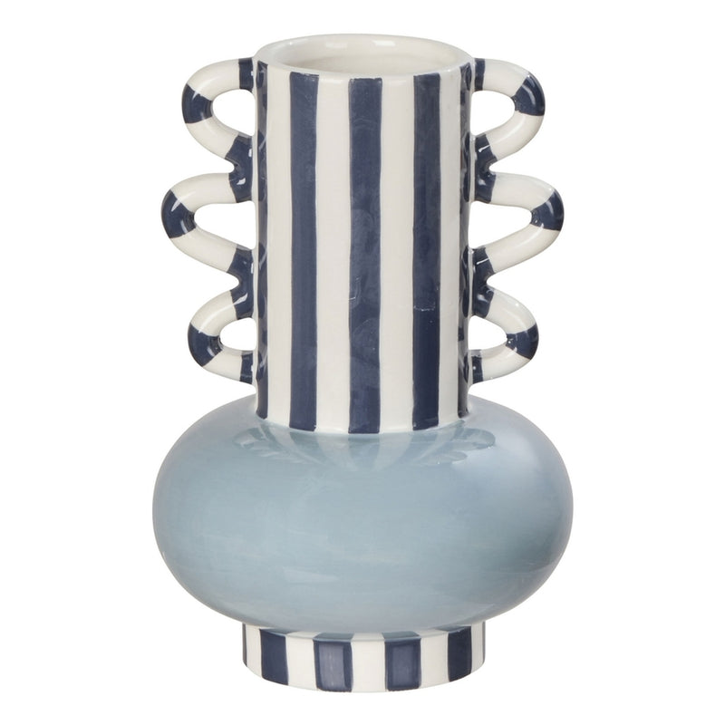 The Small Harp Stripe Vase brings a pop of playful charm to your decor collection, giving the classic urn silhouette an abstract update. With hand-painted humbug stripes and a rounded pale blue base, the wide neck is perfect for smaller floral arrangements.