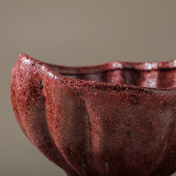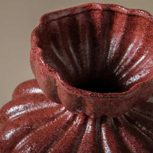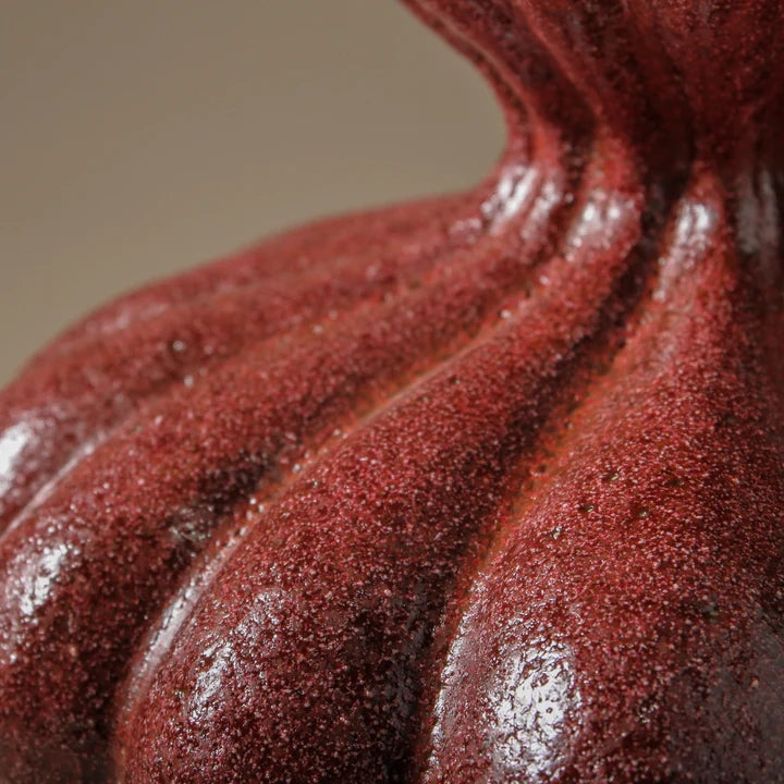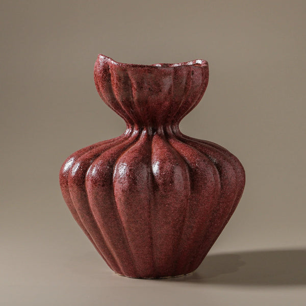 The Zivina Vase in deep burgundy tones celebrates an organic aesthetic that bridges art and nature. Its wavy silhouette and ribbed texture evoke the fluidity of natural forms, embodying the richness of the earth. The burgundy hue symbolises warmth and vitality, grounding the design in the cycles of life.