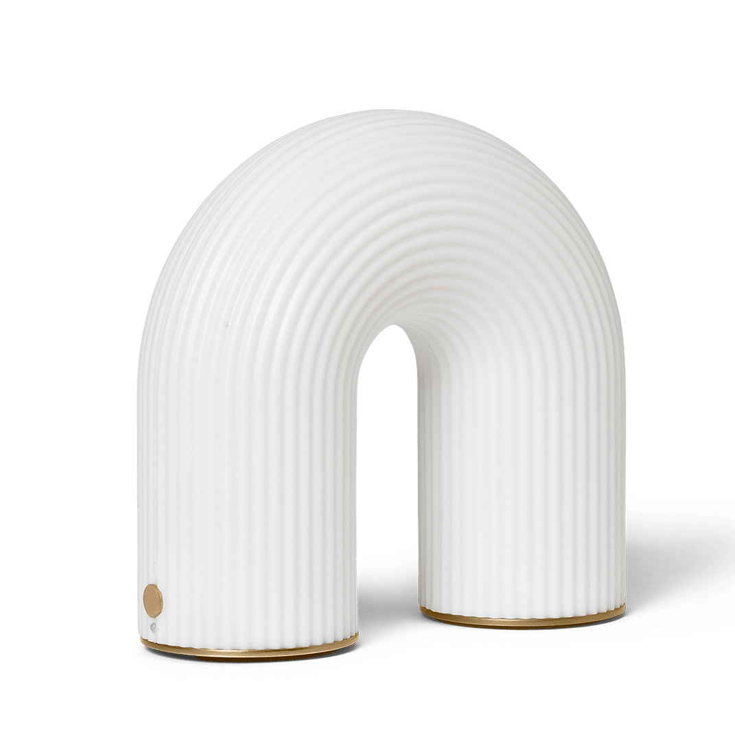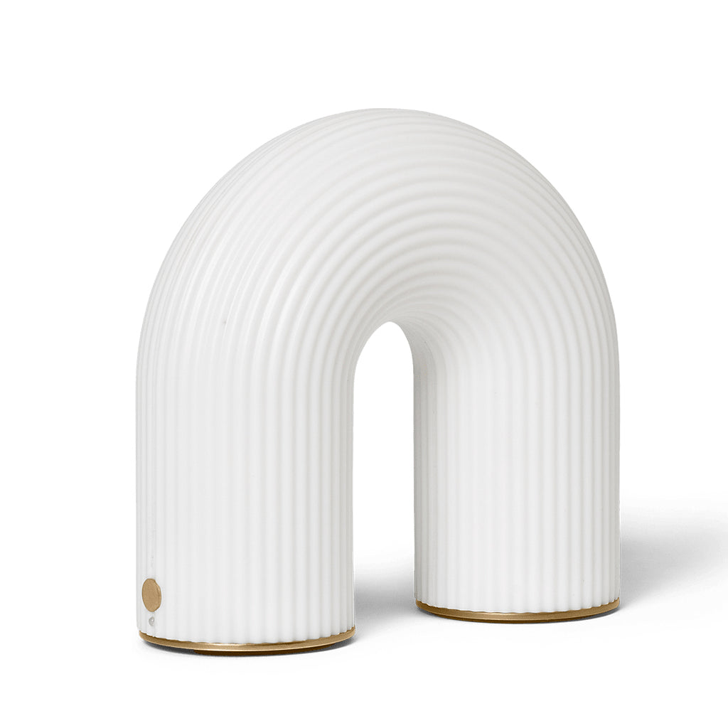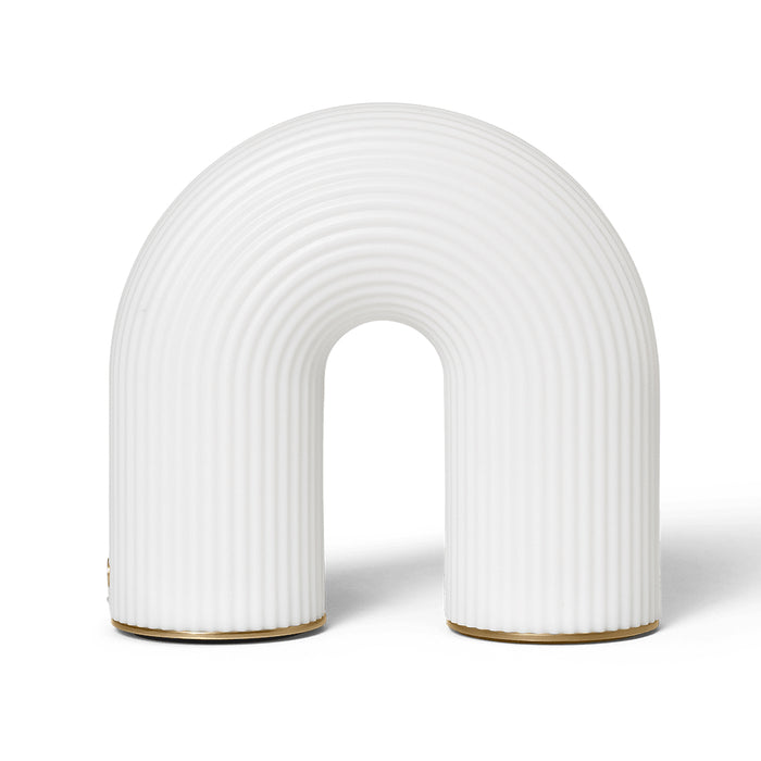 With its sculptural arc reminiscent of ancient columns, the Vuelta Portable Lamp reflects the distinctive style of the Vuelta Series. Designed with portability in mind, this compact lighting solution stands out for its craftsmanship and durable plastic construction, making it an exceptionally versatile product. Blending functionality and design, the lamp boasts an LED light source that emits a soft, diffused glow and an adjustable dimmer switch for ultimate ambience control. This portable lamp is a multifaceted addition to any setting, perfect as a gentle nightlight for the kids' room or a subtle accent to illuminate a dark corner.