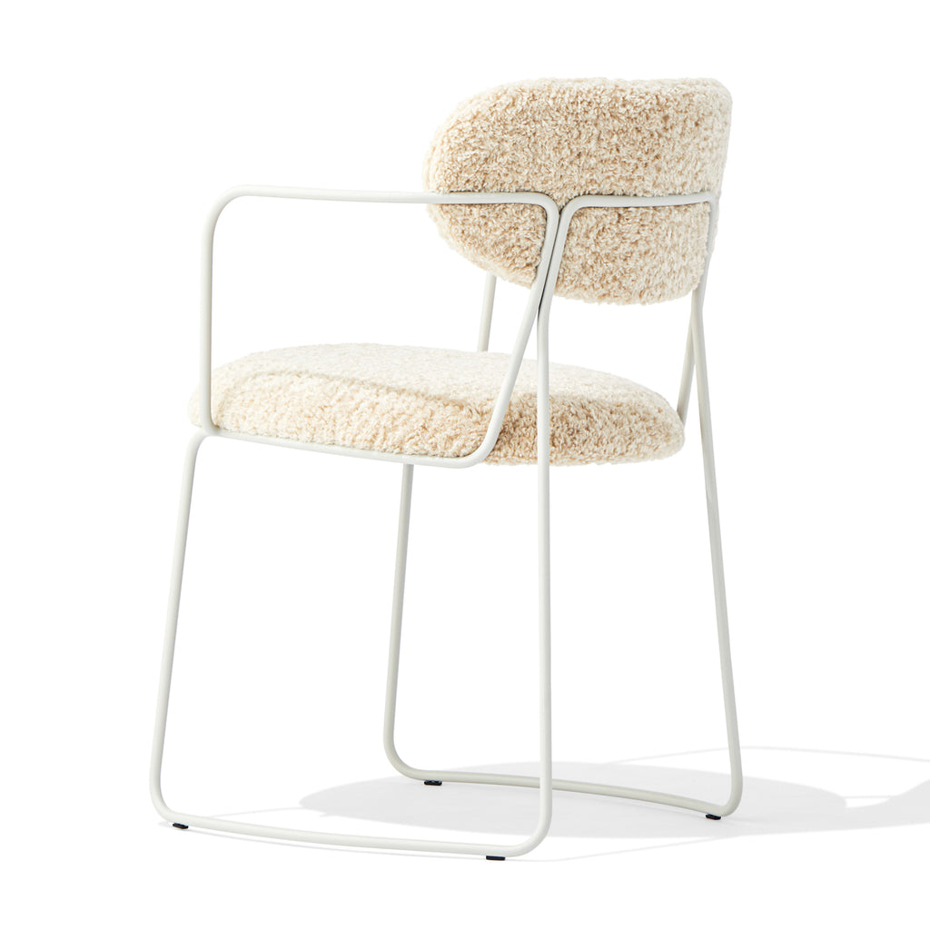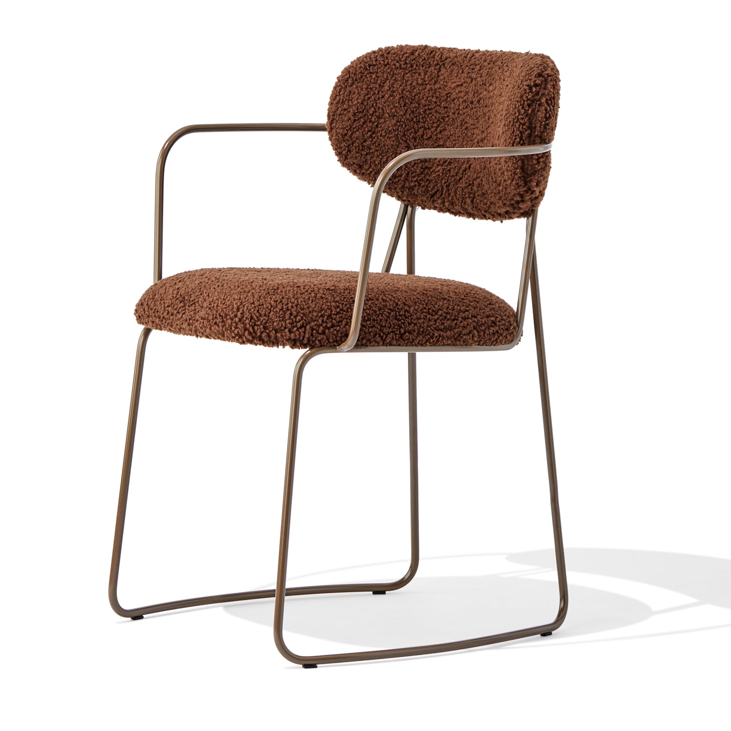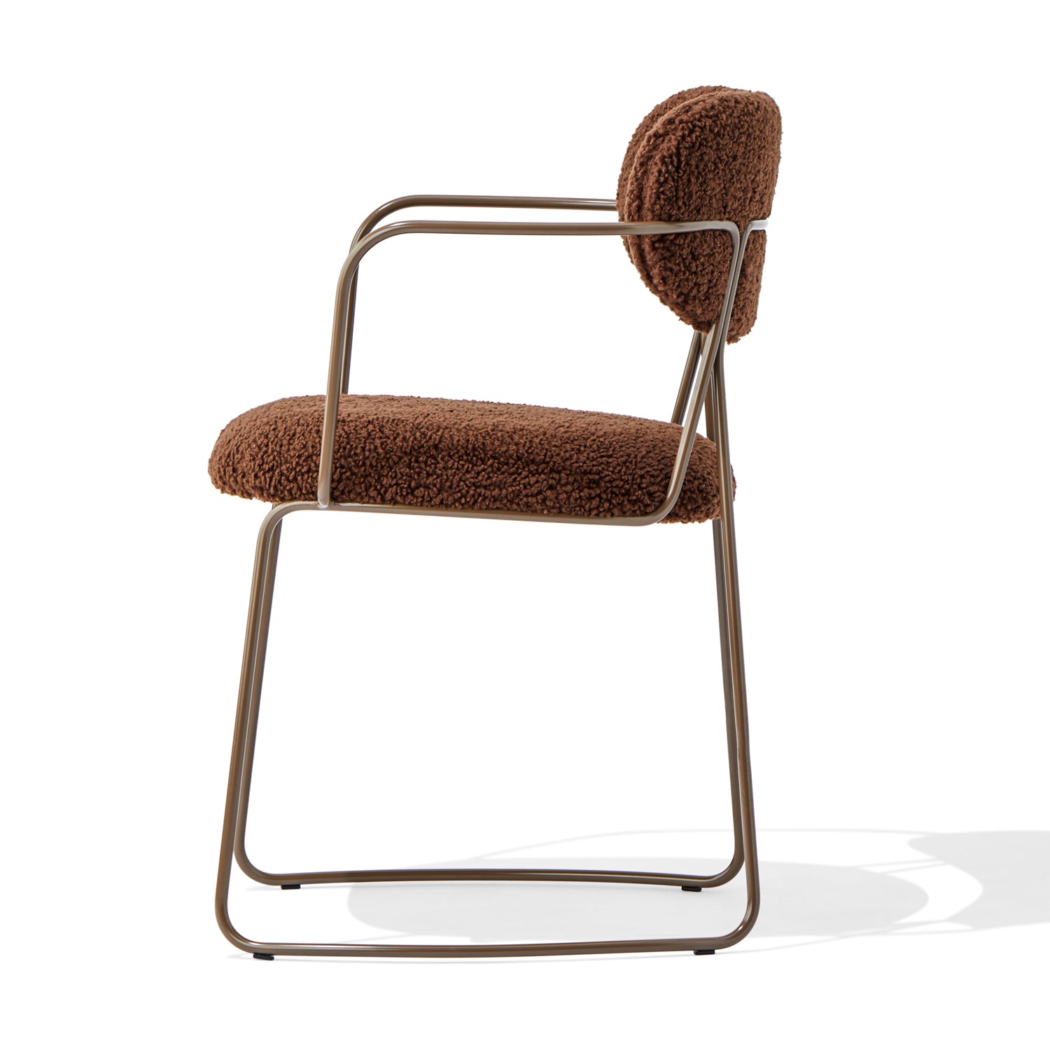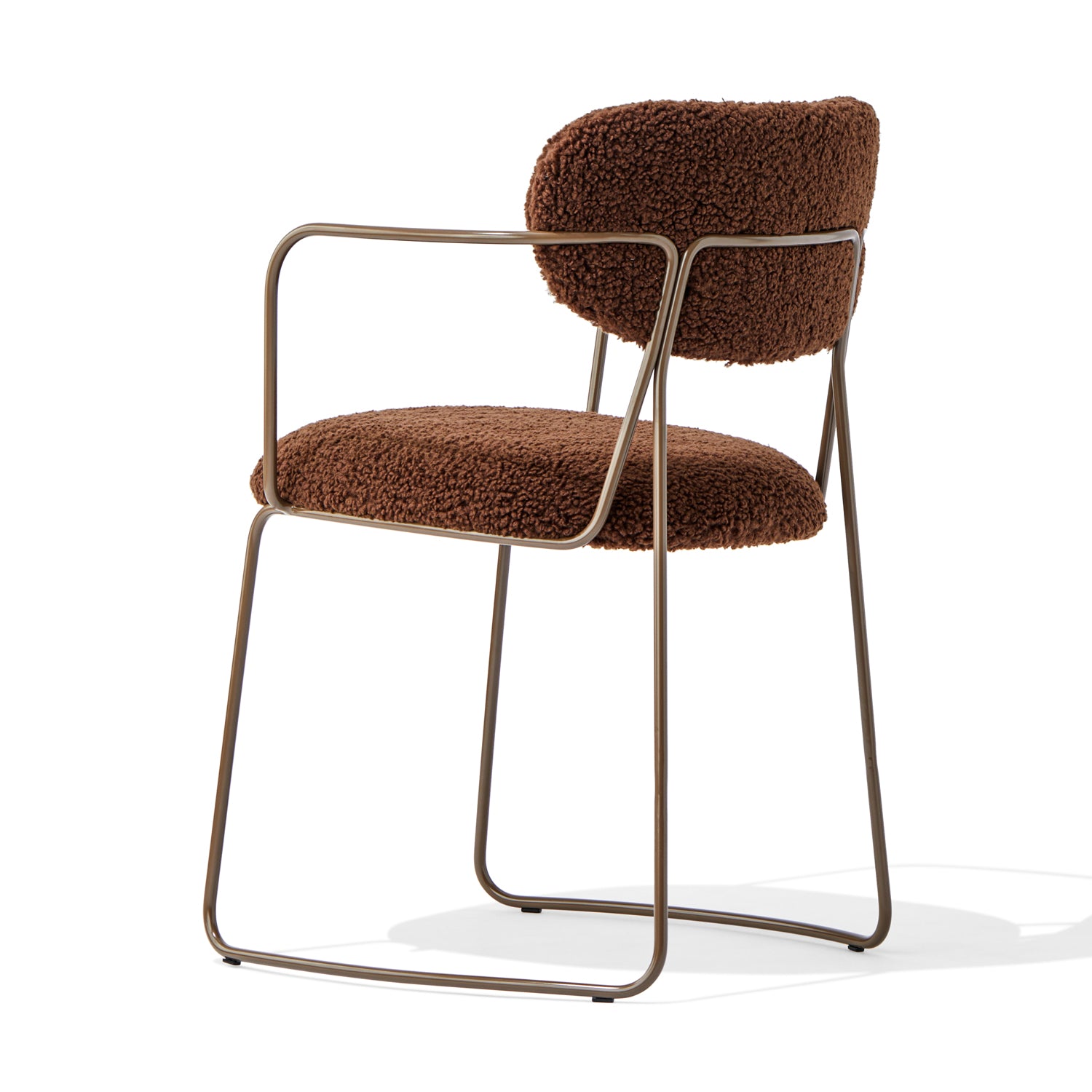 The Chester Armchair is shaped with an inviting curve, its generous backrest and rounded seat are wrapped in tactile boucle for a grounded sense of comfort. Slender steel legs keep the silhouette light, their gentle lines balancing structure with ease. Perfect at the dining table, in a study, or as a spare seat that quietly elevates a corner. A considered piece, crafted for both everyday use and timeless appeal.