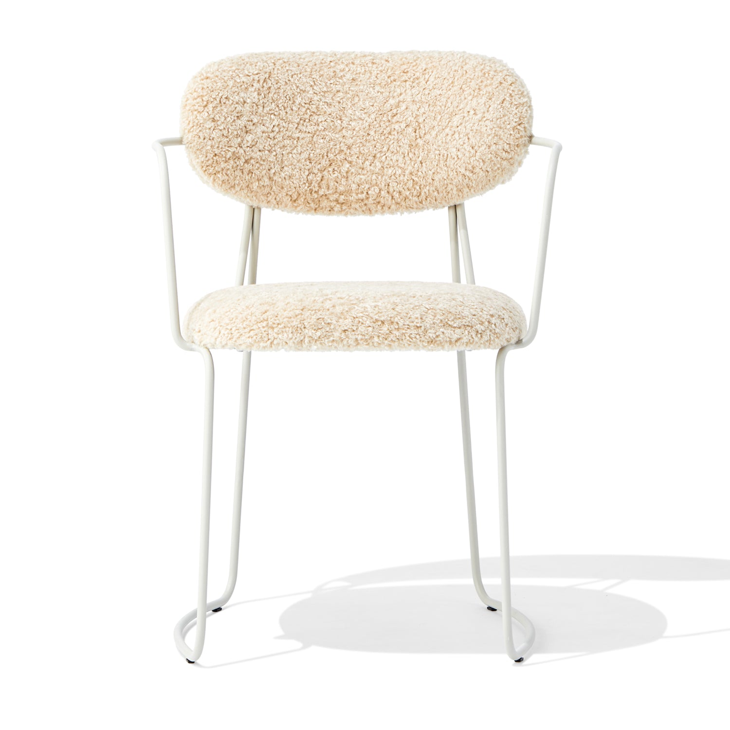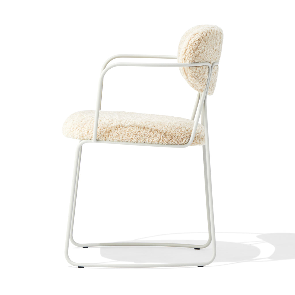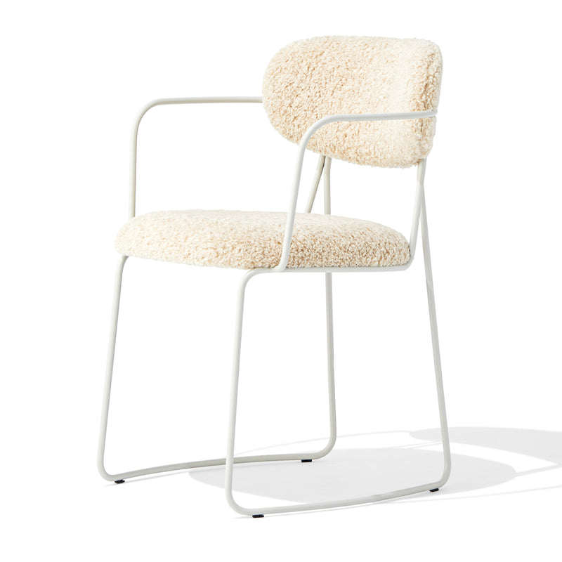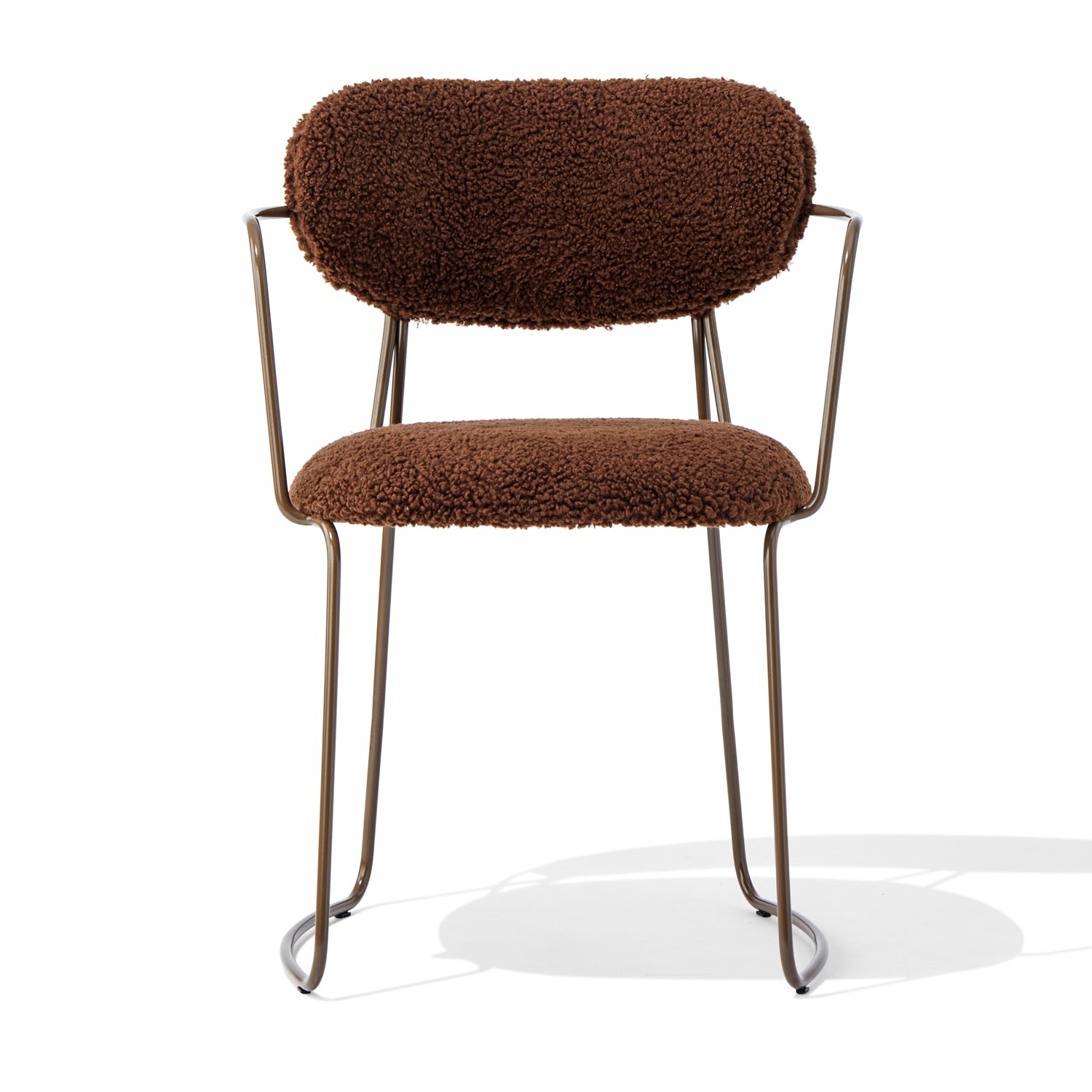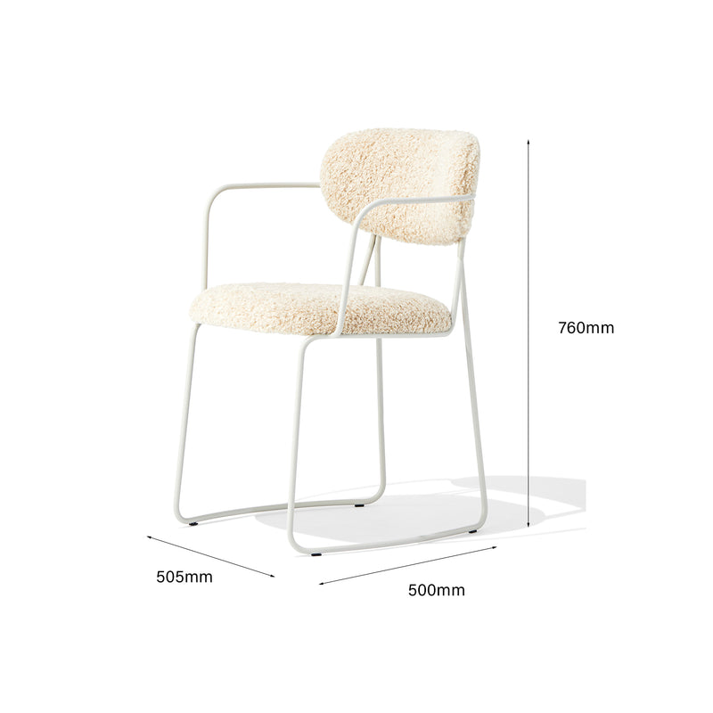 The Chester Armchair is shaped with an inviting curve, its generous backrest and rounded seat are wrapped in tactile boucle for a grounded sense of comfort. Slender steel legs keep the silhouette light, their gentle lines balancing structure with ease. Perfect at the dining table, in a study, or as a spare seat that quietly elevates a corner. A considered piece, crafted for both everyday use and timeless appeal.