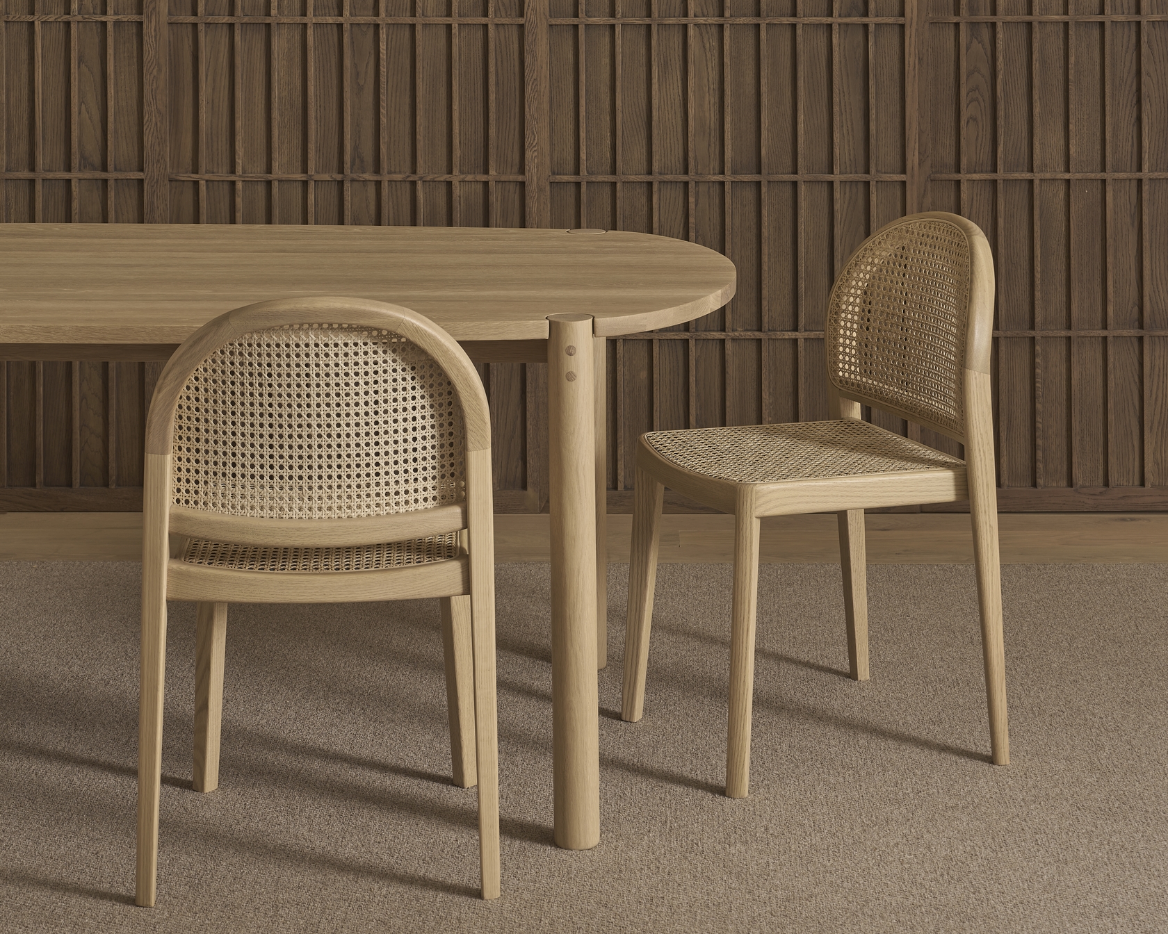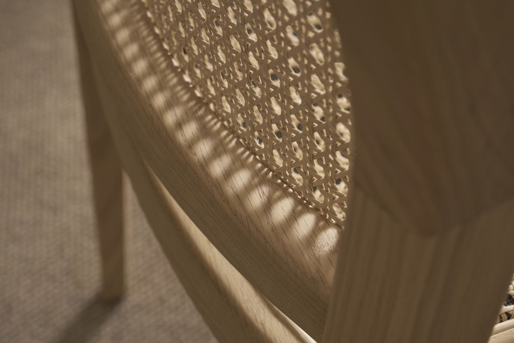 The Luk Chair is defined by its iconic arch silhouette referencing classic lightweight furniture typologies. The design is both complex and restrained in form, focusing on flowing surfaces which emphasise wood grain and the natural beauty of cane weave rattan. Light and shadow permeate through the weave, adding to the sense of weightlessness. Neatly stacking and developed with comfort first, Luk delivers with its holistic functionality and uncluttered looks.