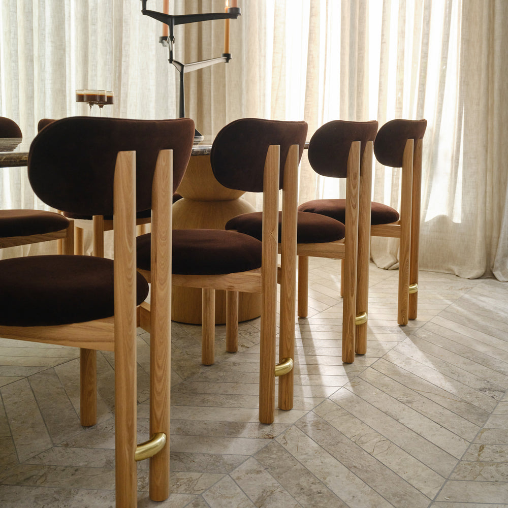 Two fabric options highlight its versatility. Espresso is a rich chocolate velvet that brings depth and warmth. Biscuit is a soft beige textile that offers a lighter and tactile softness. Each finish responds to the light in subtle ways, enhancing the sculptural character of the piece. The result is a chair that feels grounded yet expressive, refined yet distinctive, and a timeless addition to the dining space.