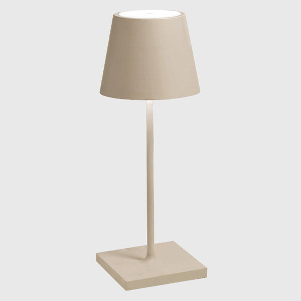 Poldina Mini Table Lamp by Zafferano Ai Lati Lights is a battery-operated, portable and rechargeable table lamp. It is equipped with a contact charging base and dimmer touch control.