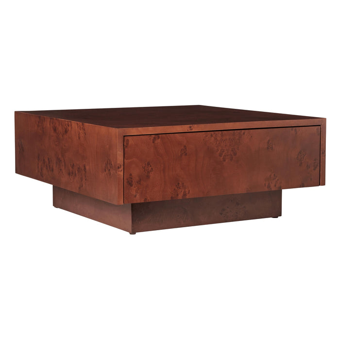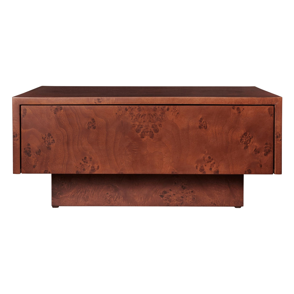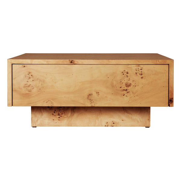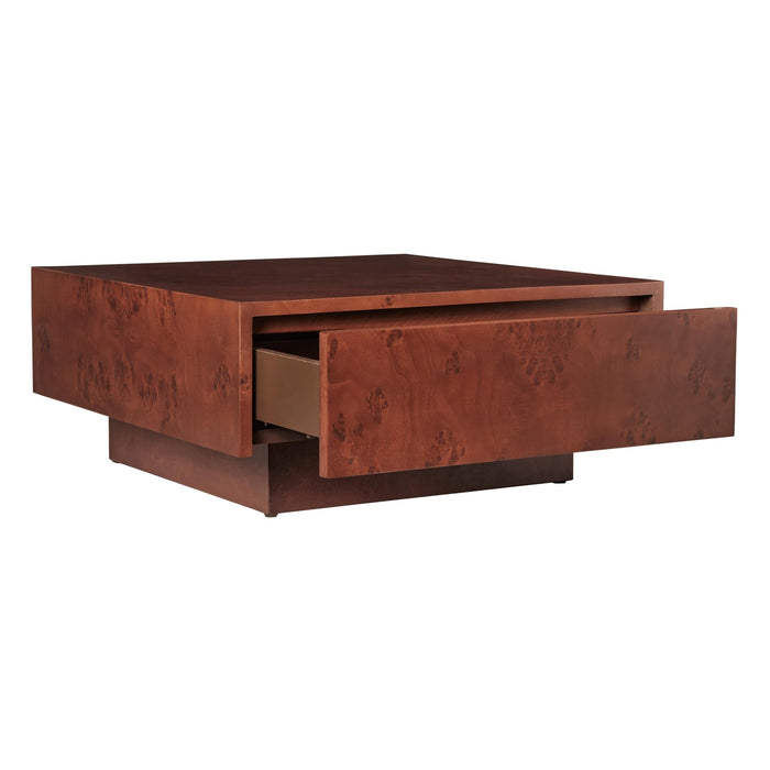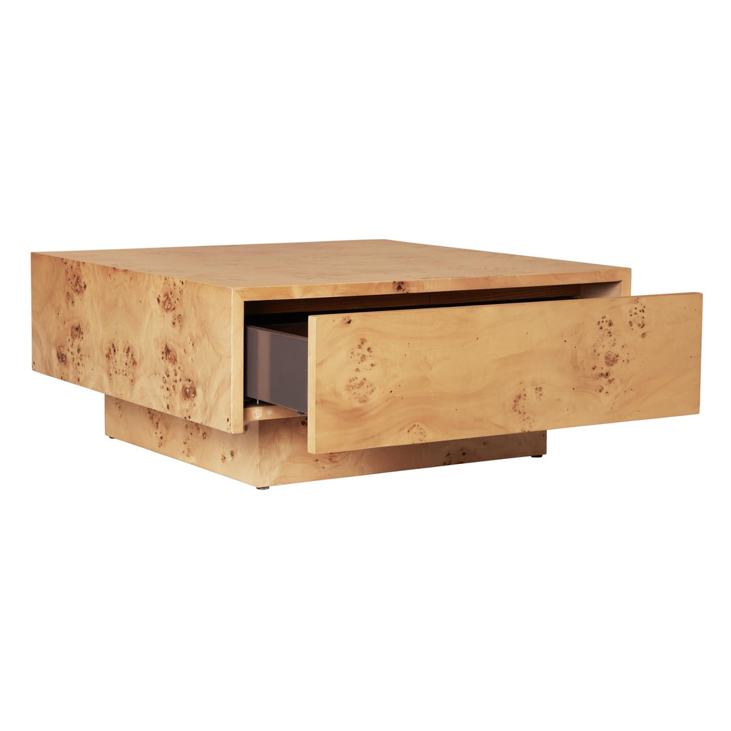 The Burl Storage Coffee Table features a square format with an added storage drawer. Crafted from FSC™ Mix-certified wood with a rich burl veneer, its swirling grain adds depth and visual warmth. The concealed drawer offers a discreet space for storing everyday items, keeping your living area calm and uncluttered.