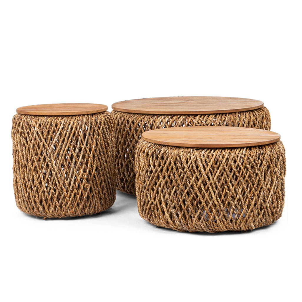 This playful set consists of three small tables, all in different sizes. The versatile pieces can be used as tables, poufs or for decoration. With the top removed, they can even be used as baskets. The tables are made of eco-friendly materials, with the sides decorated with hand-braided abaca fibers and the removable top made of reclaimed teak wood.
