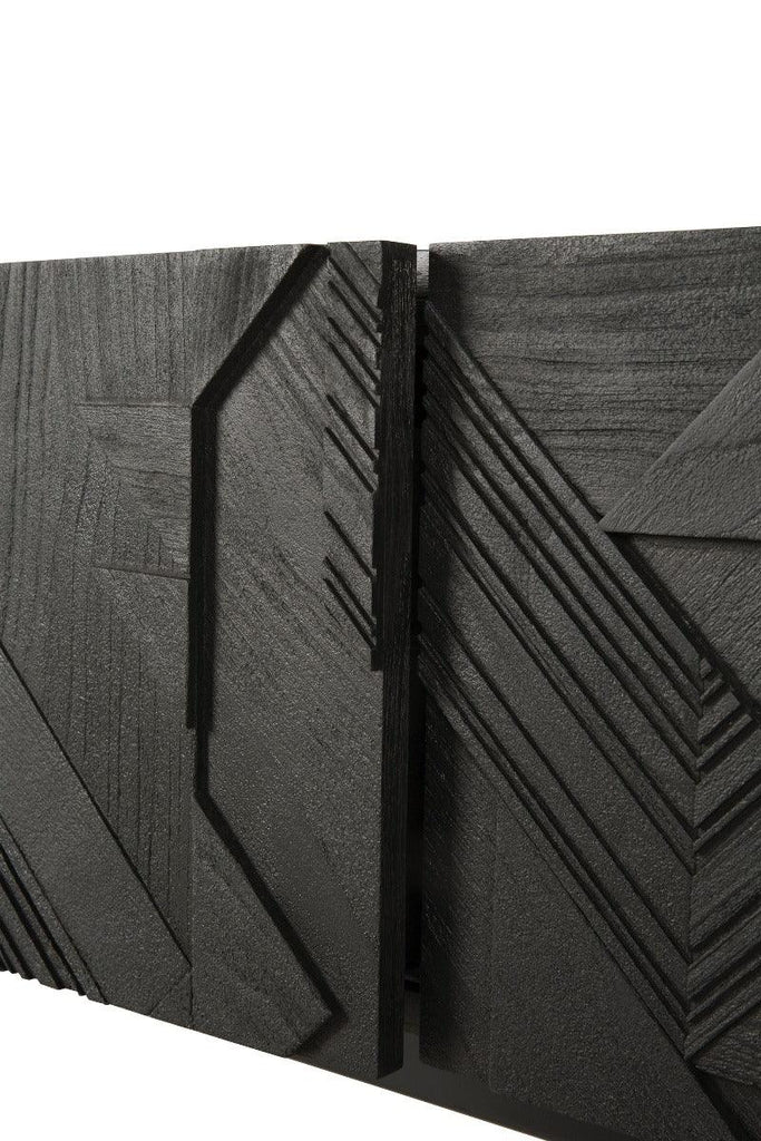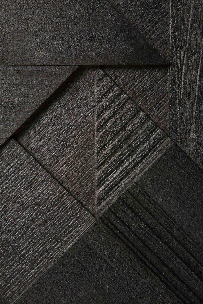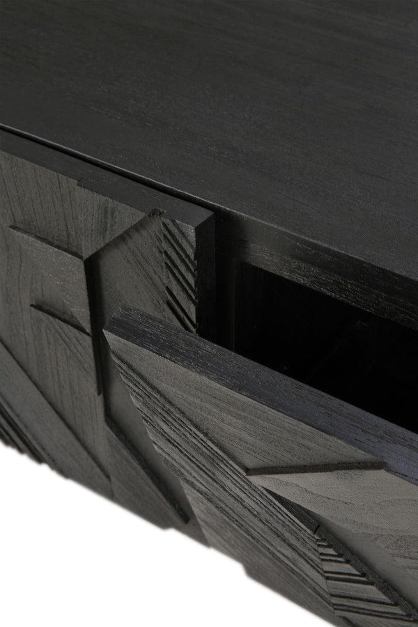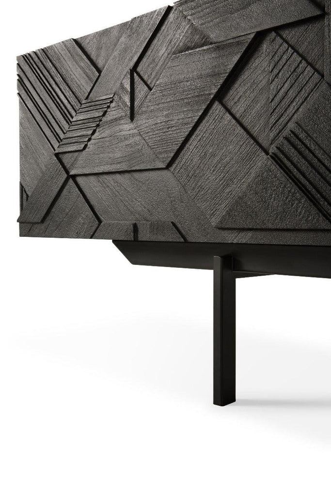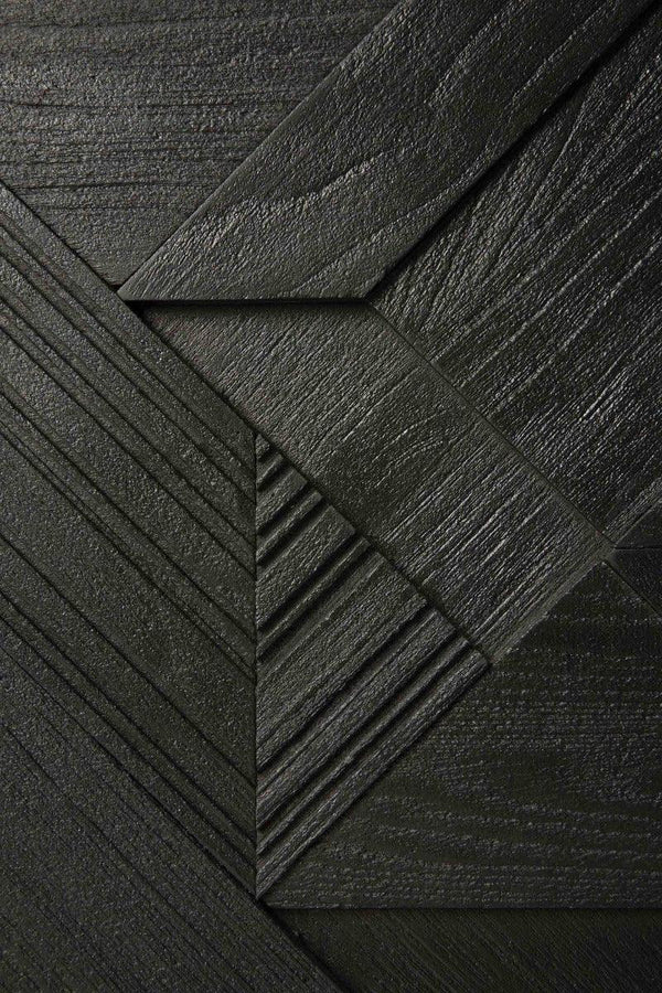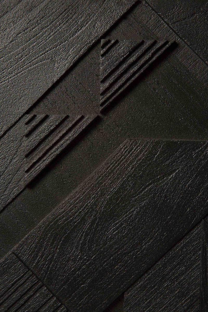In his quest to add movement to the surface, our designer Alain van Havre started layering and combining triangular shapes. Before he knew it, he had created an interesting composition out of teak. We ended up brushing the surface to highlight the grain and further emphasize the feeling of motion. Originally used for our popular Teak Graphic sideboard, the pattern now translates perfectly to a new TV cupboard.