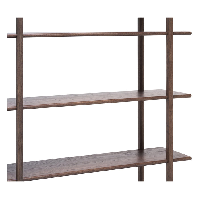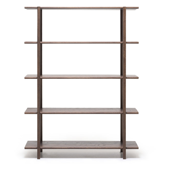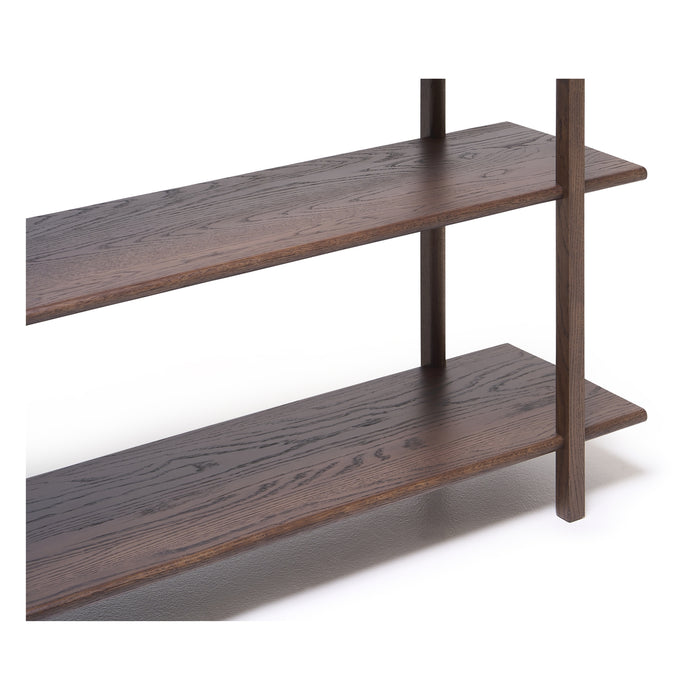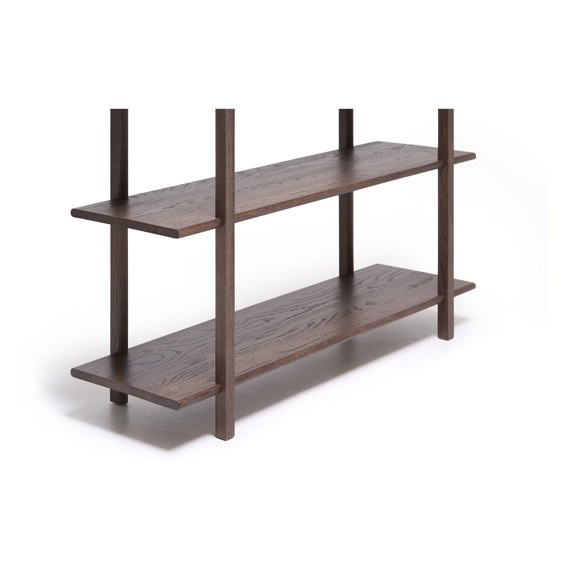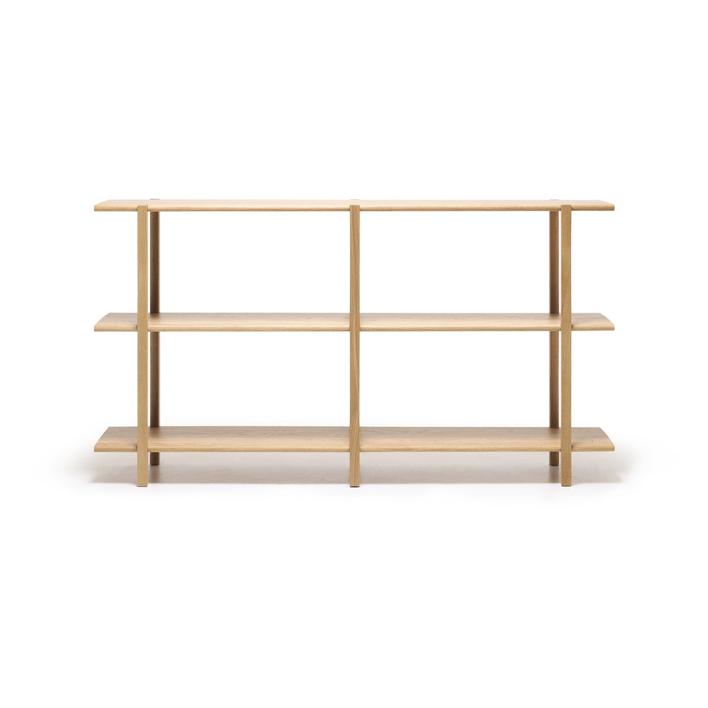 Mentsen designed the Farnsworth shelf to be strong yet visually light. The beauty of this architecture-inspired piece is in the repeating interlocking joints – a structure that does away with diagonal bracing in favour of clean horizontal and vertical lines. At each interval, the oak shelves appear to clasp the uprights effortlessly. Farnsworth comes in two different heights.