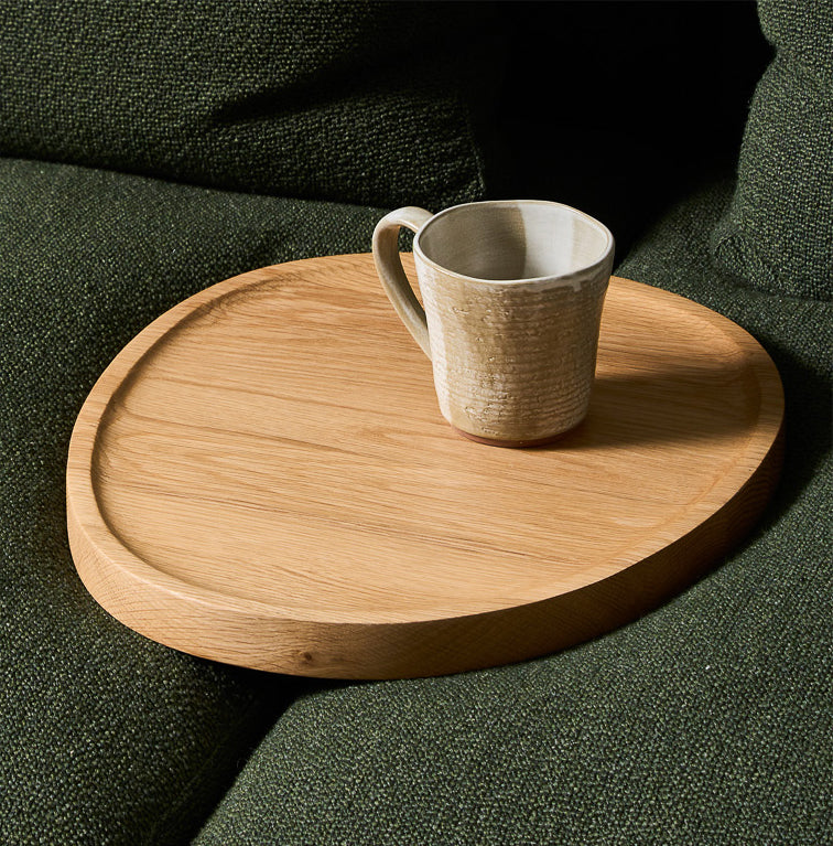 The side table stands independently on a base of the same shape, while the tray table using the same top has a fin which slots between the seat cushions of the sofa, giving stability to the tray.