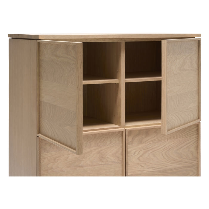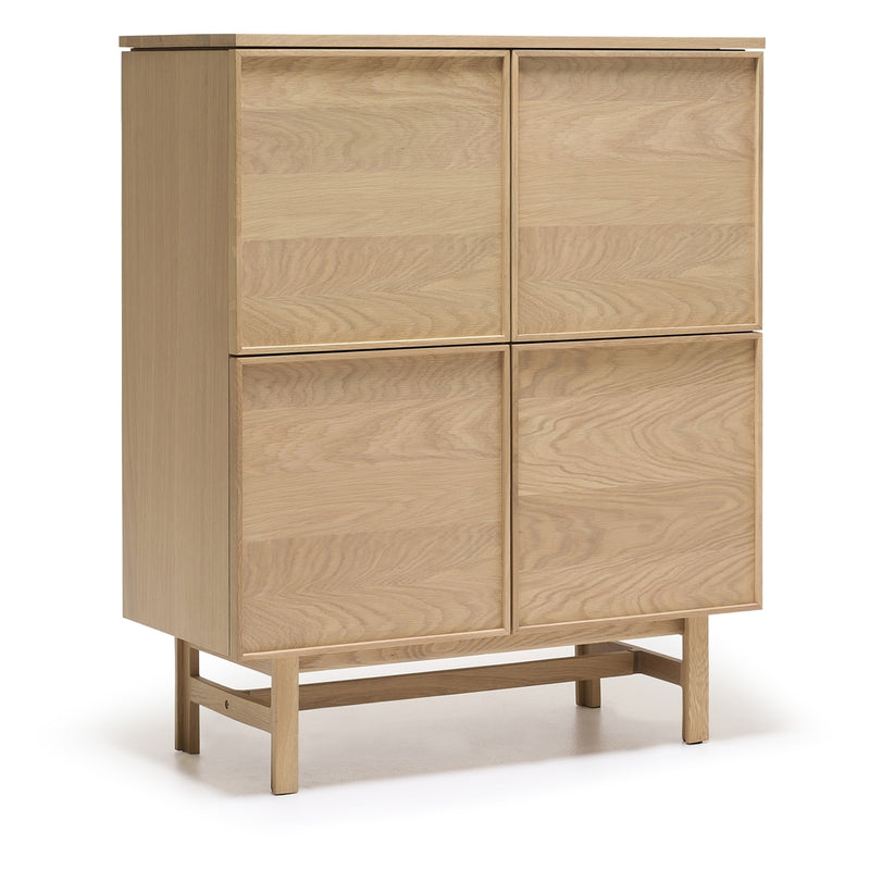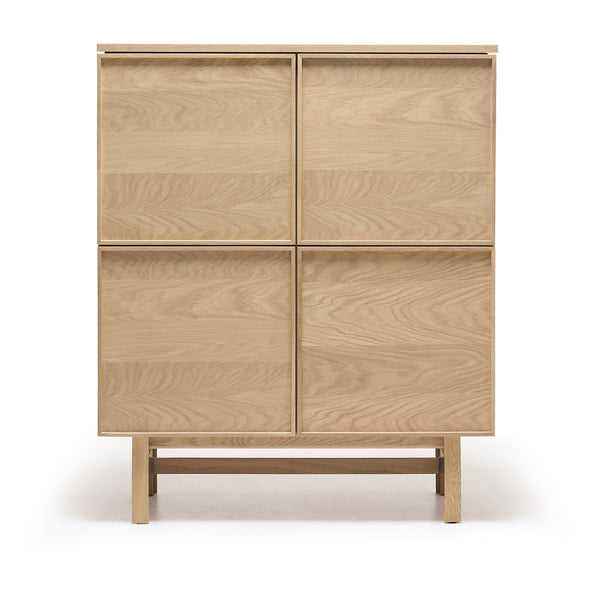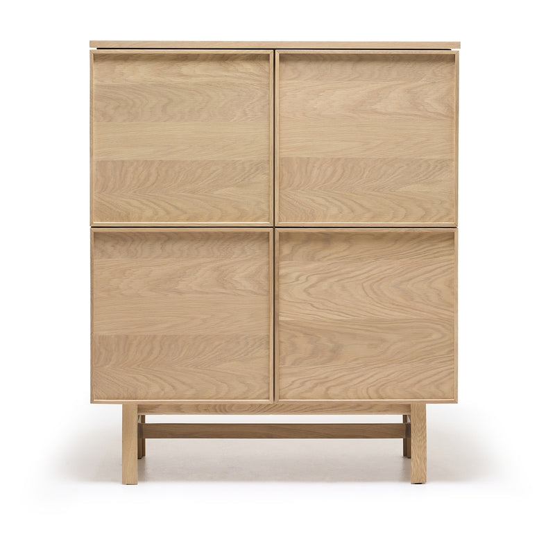 Yorke cabinets exude the calm assurance of symmetry. A crafted panelled motif on the fronts, effortlessly linking the past with the present, is the only decorative detail on an otherwise minimal linear form, well-grounded by thoughtful proportions. Choose from solid oak or natural stone for the top panel.