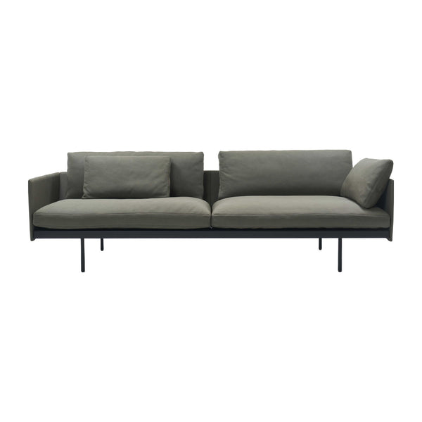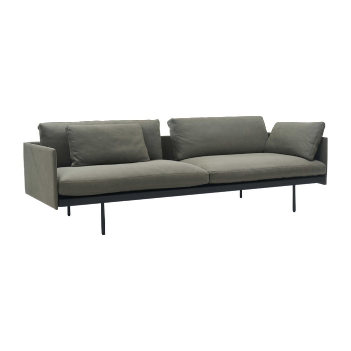 Casually slack cushions contrast with super-sleek arms, sitting on a tidy steel base for an effect that is loaded with low key elegance. Looking super comfortable, this sofa presents a new level of comfort while maintaining its high level of contemporary design.