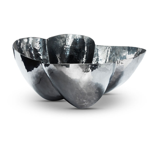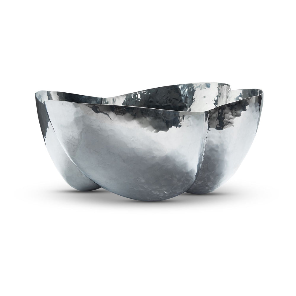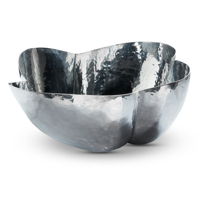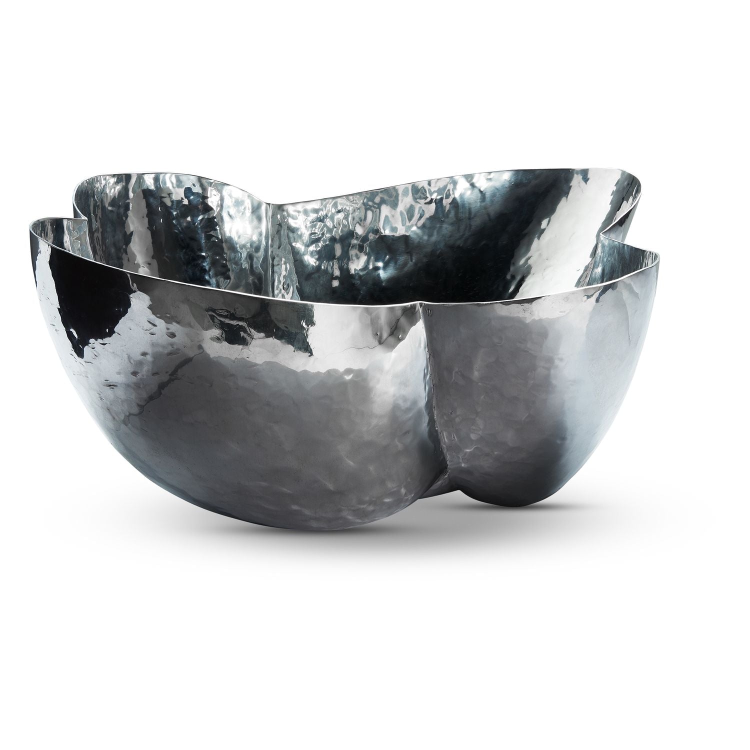 Cloud is a large sculptural bowl made of highly reflective polished aluminium. Handmade in India by skilled artisans, each bowl has unique qualities with every hammer and indentation from stretching and warping the metal being preserved, reflecting the amount of work that’s gone into the design. The silver bowl has a shape reminiscent of seedpods and can be used for a variation of purposes, such as a fruit bowl.