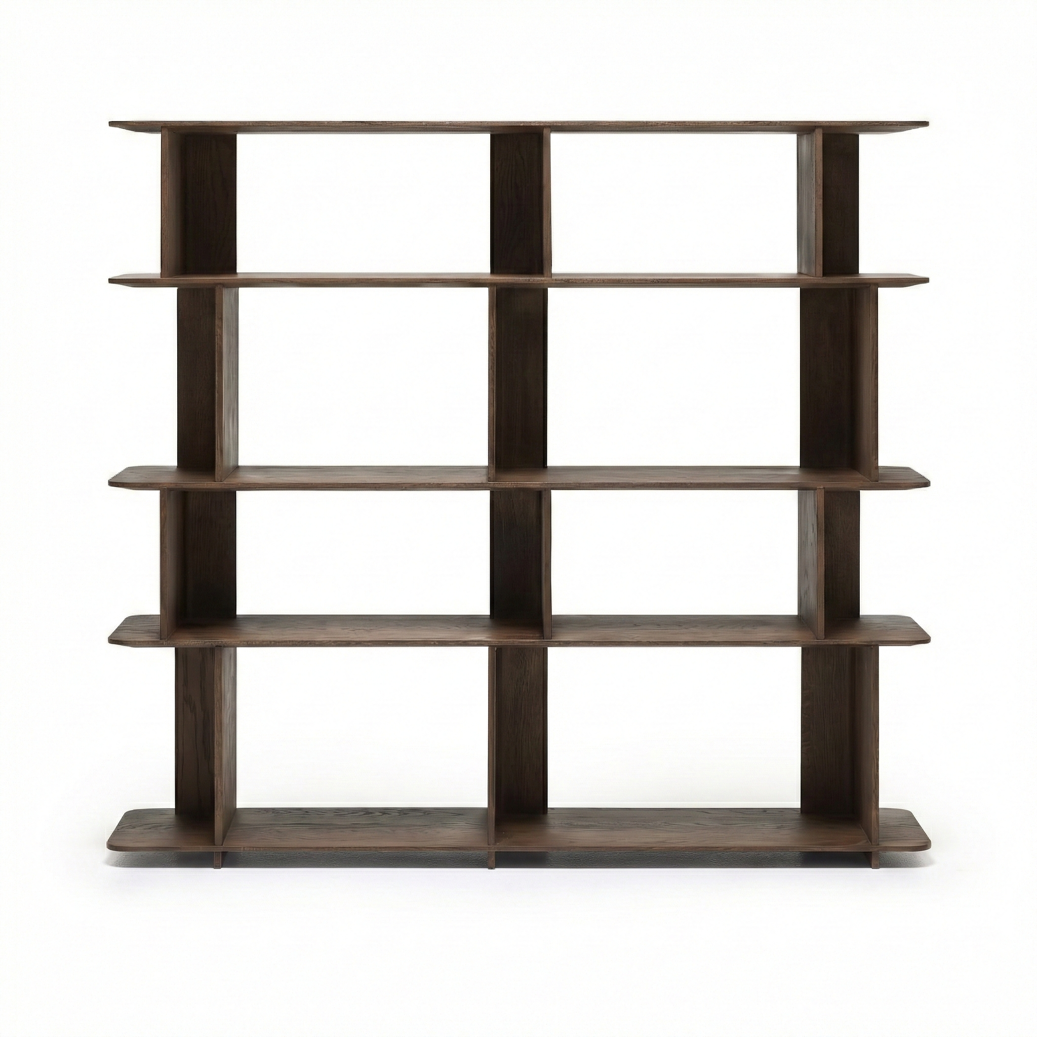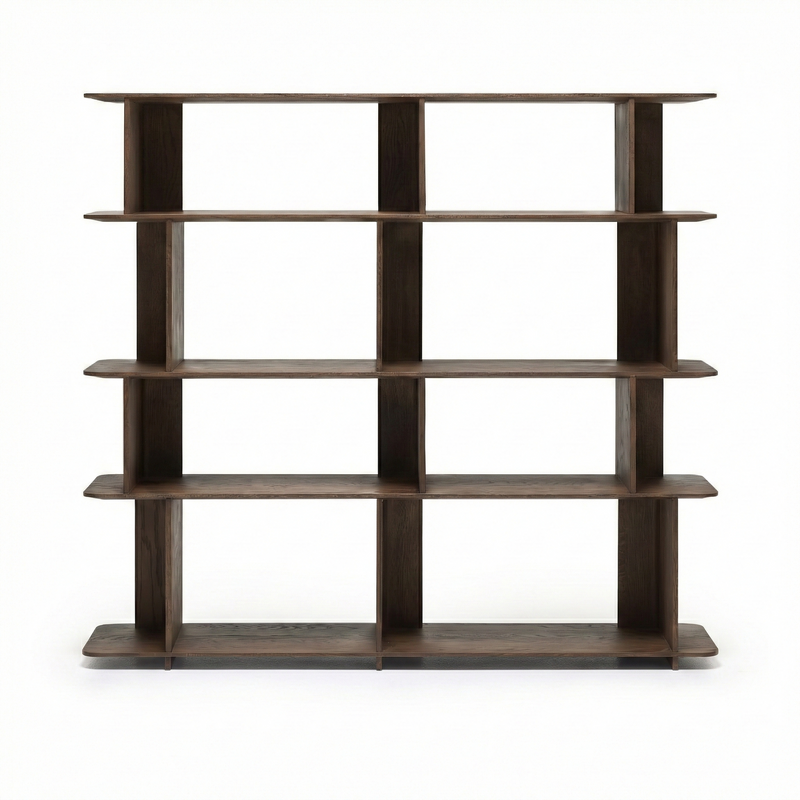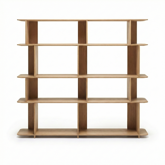 Perpendicular panels intersect to form the uprights, which, arranged in alternating directions, create a feeling of movement and break up the symmetry, while also offering interesting display and storage options.