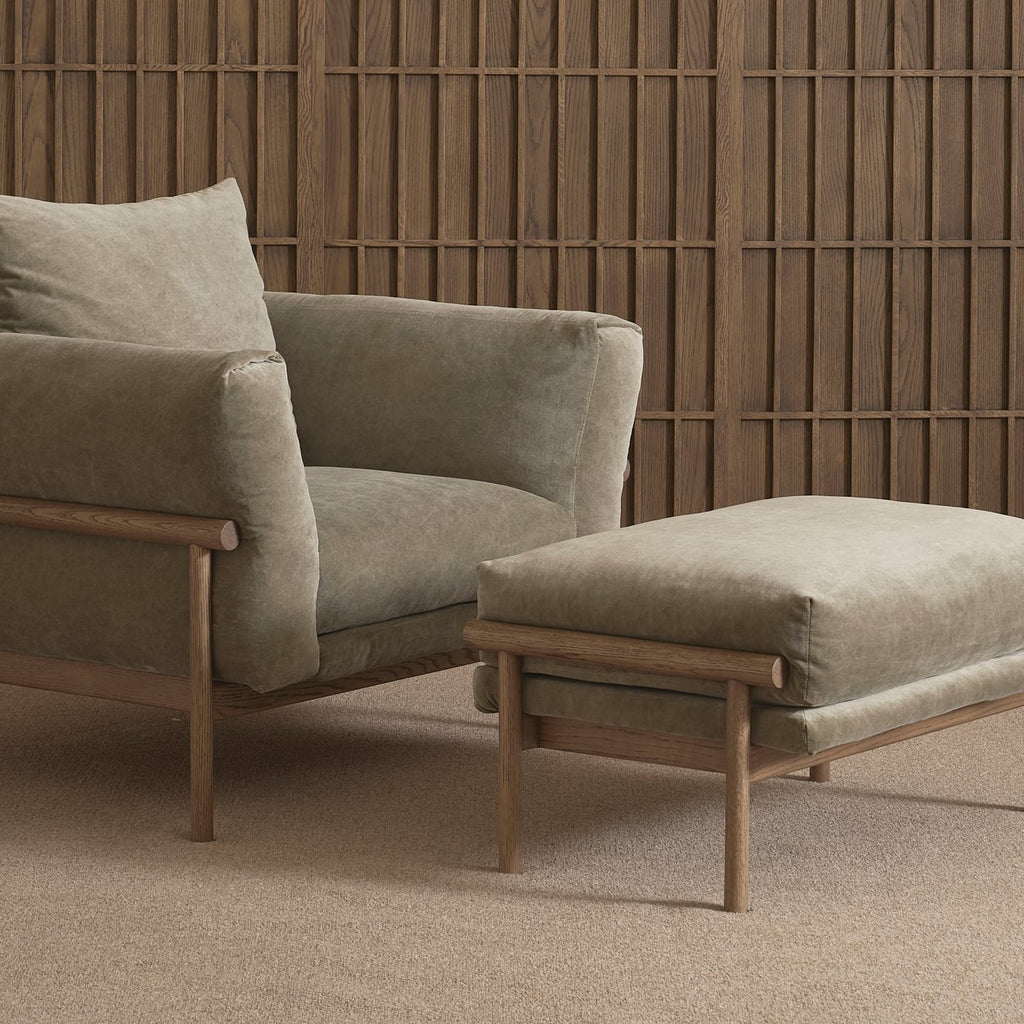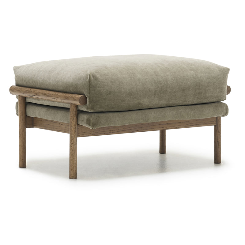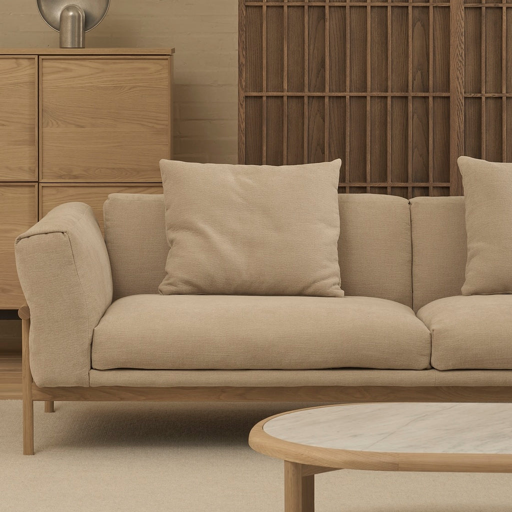 The Timm sofa is defined by an expertly crafted solid oak external frame that exudes timeless elegance. The arms of the sofa are elegantly folded over the wood frame, creating a subtle harmony between the soft and hard elements of the sofa, while also providing a distinctive but relaxed look.