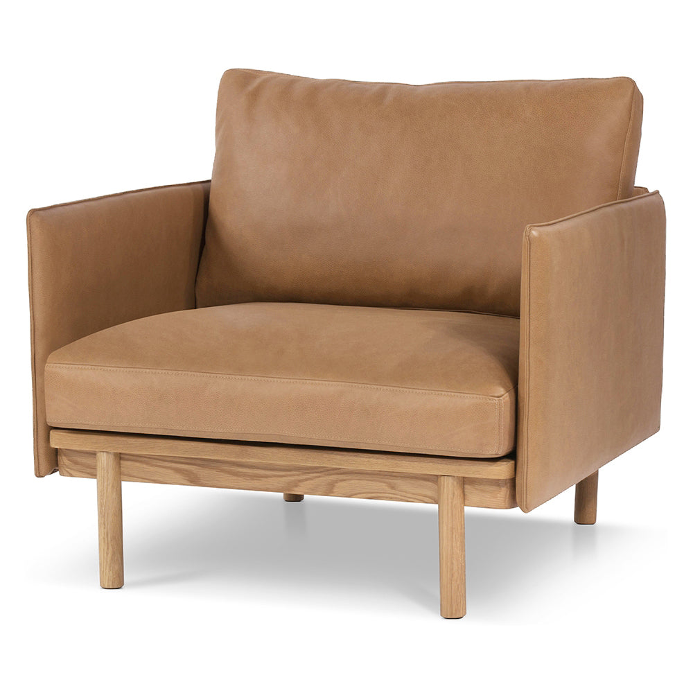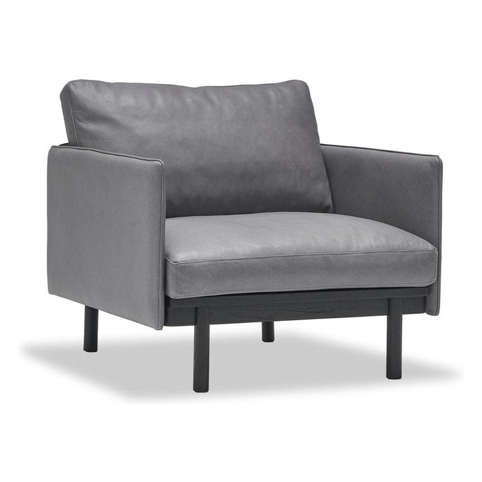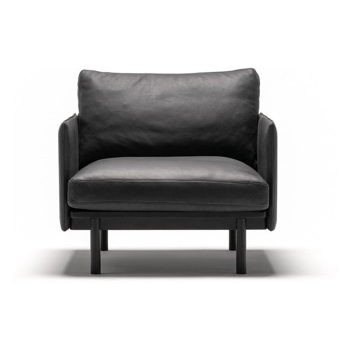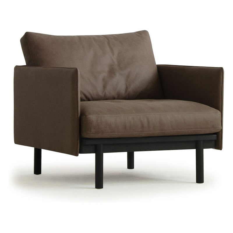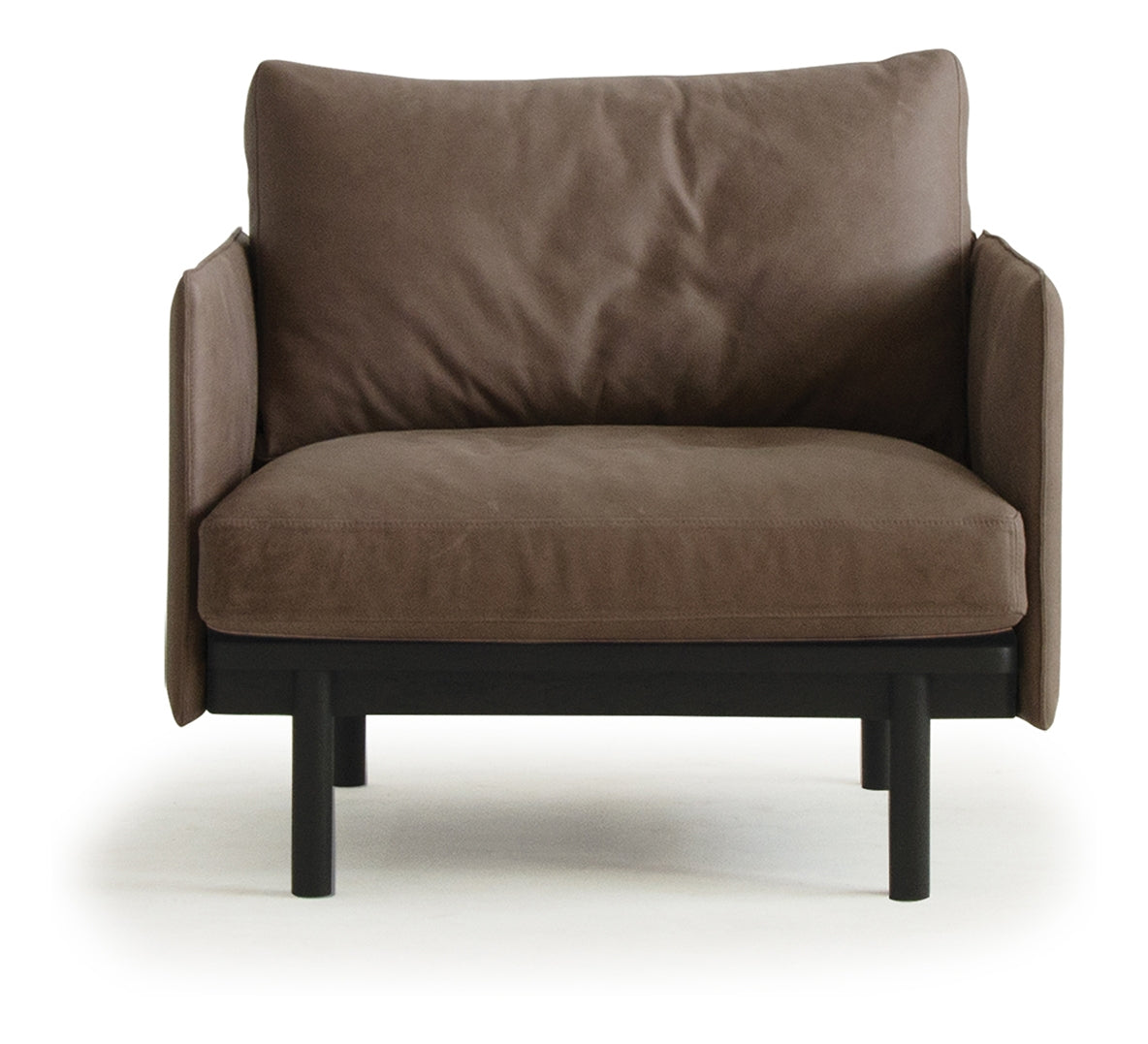 Cameron Foggo’s Pensive armchair deftly combines comfort and structure for a relaxing place to sit. It is characterised by thin planar arms, with soft seat and back cushions. Like the sofa of the same design, it has a wooden plinth base intersected by cylindrical wood legs.